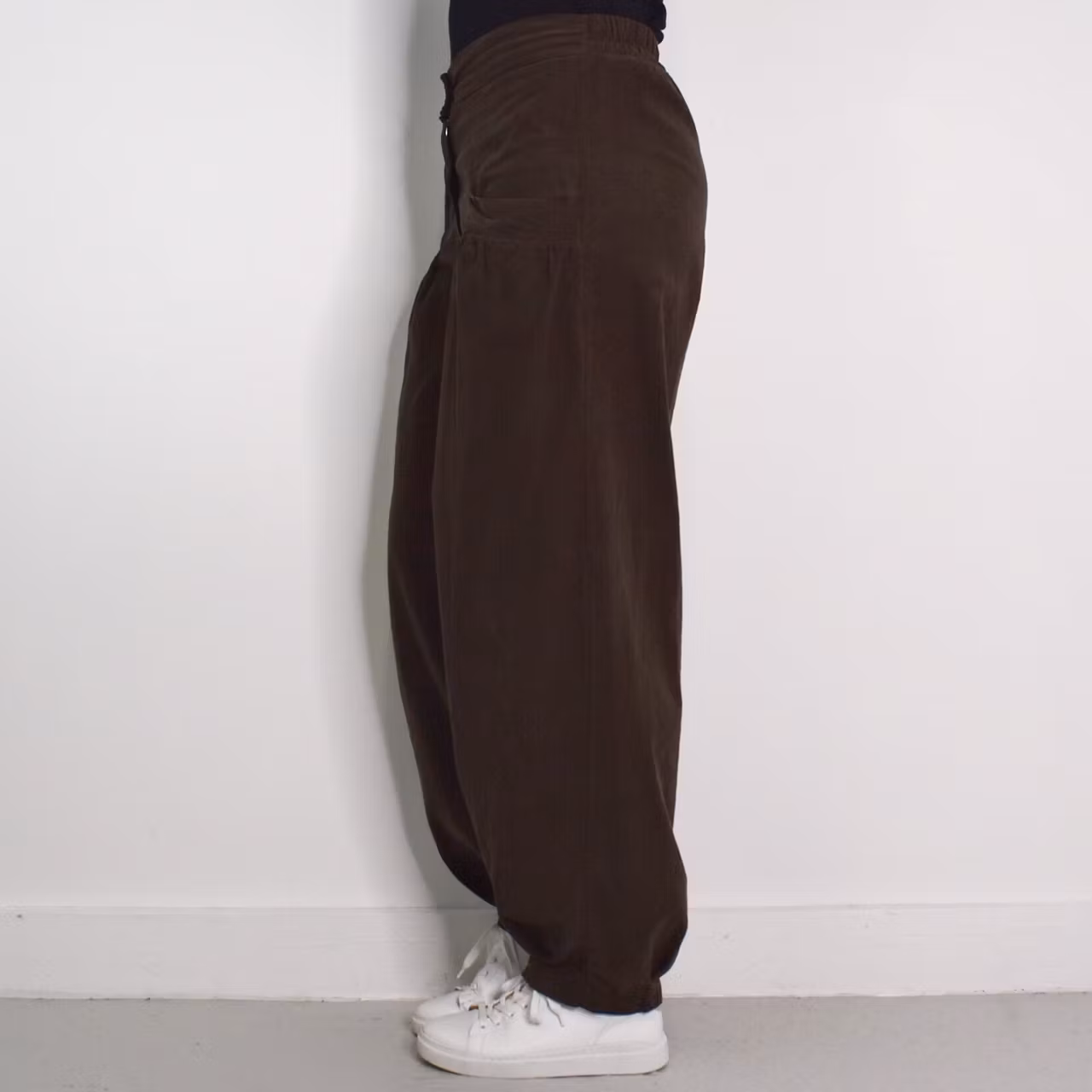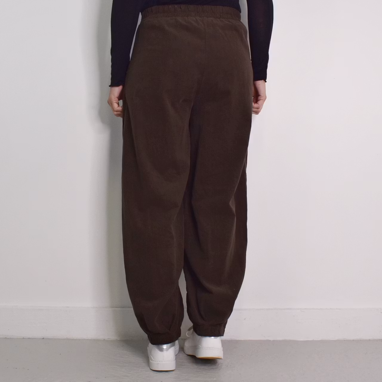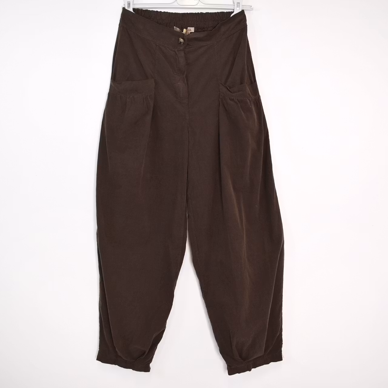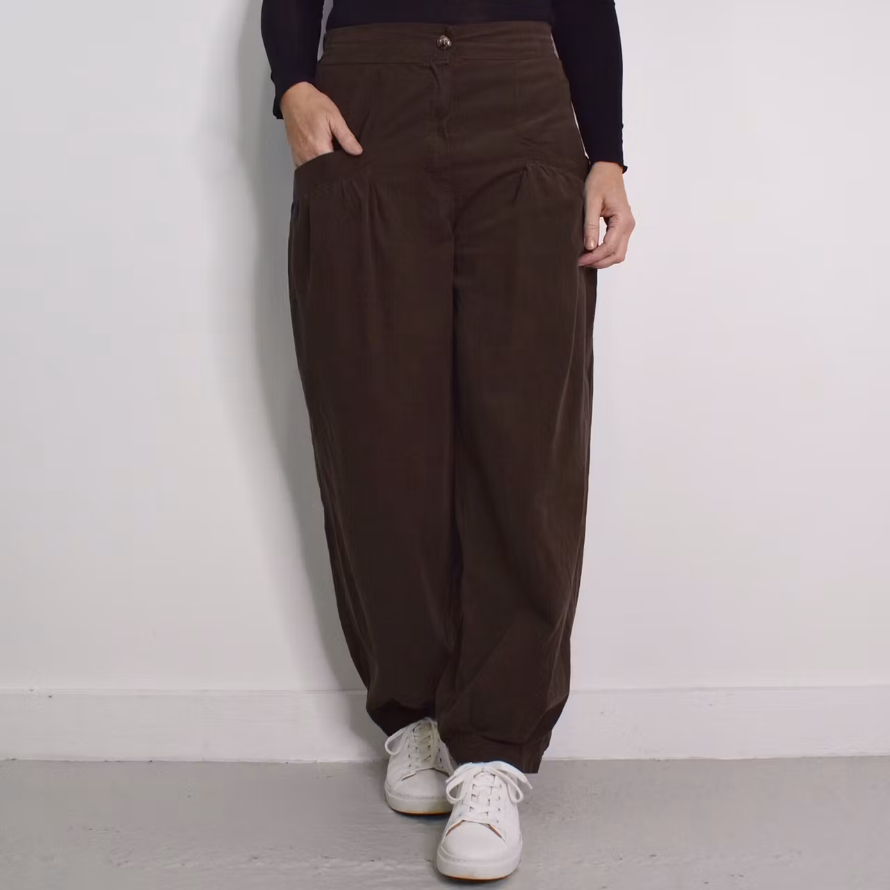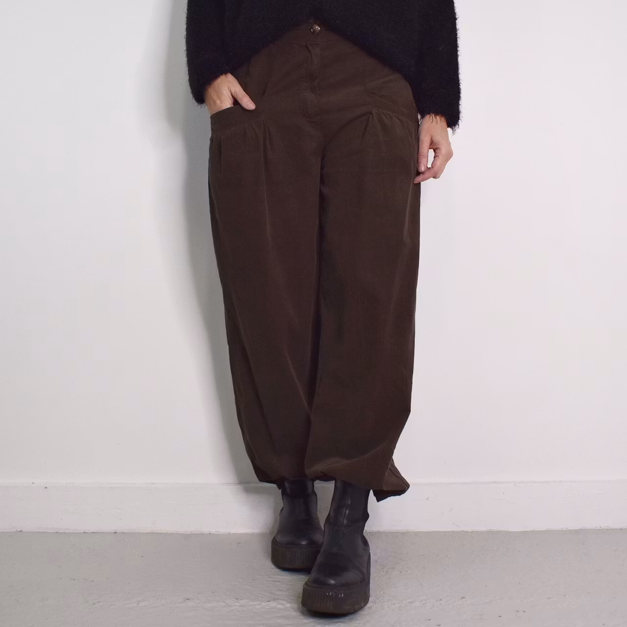 Det här är en läcker byxa i smalspårig manchester med pösiga ben och bylsiga fickor fram. I midjan finns en stretchig resår baktill. Benslutet är smalt och tyget är rynkat ovanför. Byxan stängs med knapp och dragkedja i gylfen. Observera att midjan kan upplevas som liten och att tyget inte innehåller stretch. Modellen har ett midjemått på cirka 78cm, en stuss på cirka 99cm, är 163cm lång och bär storlek S/M.