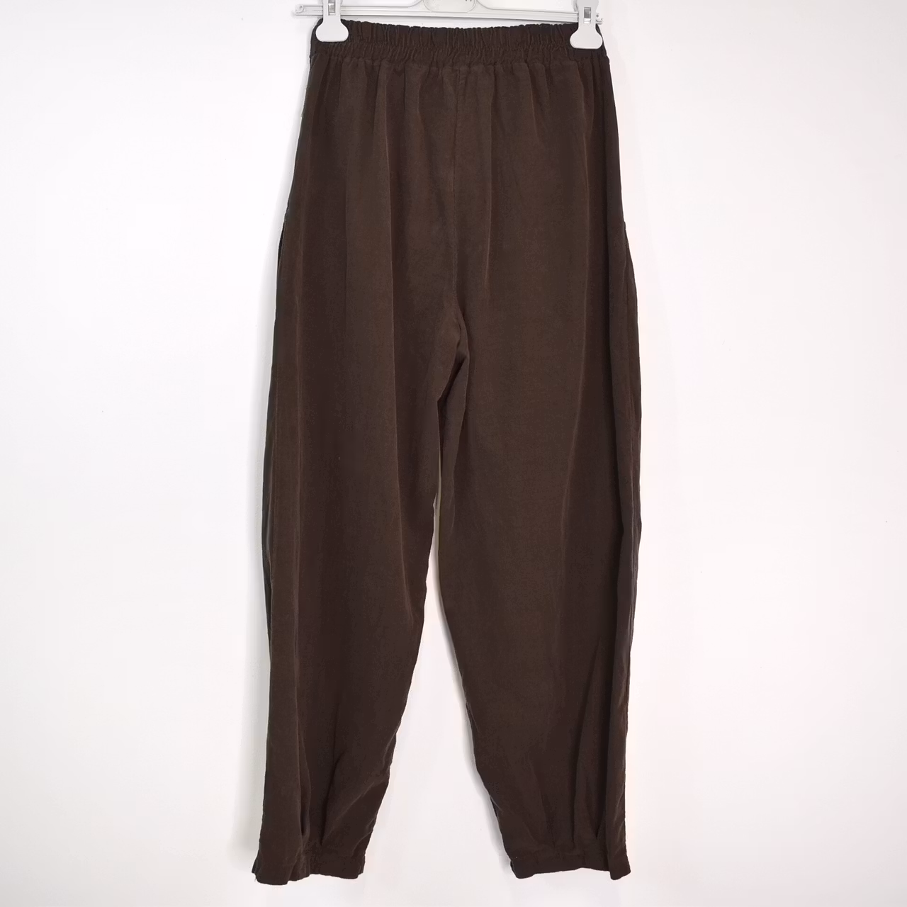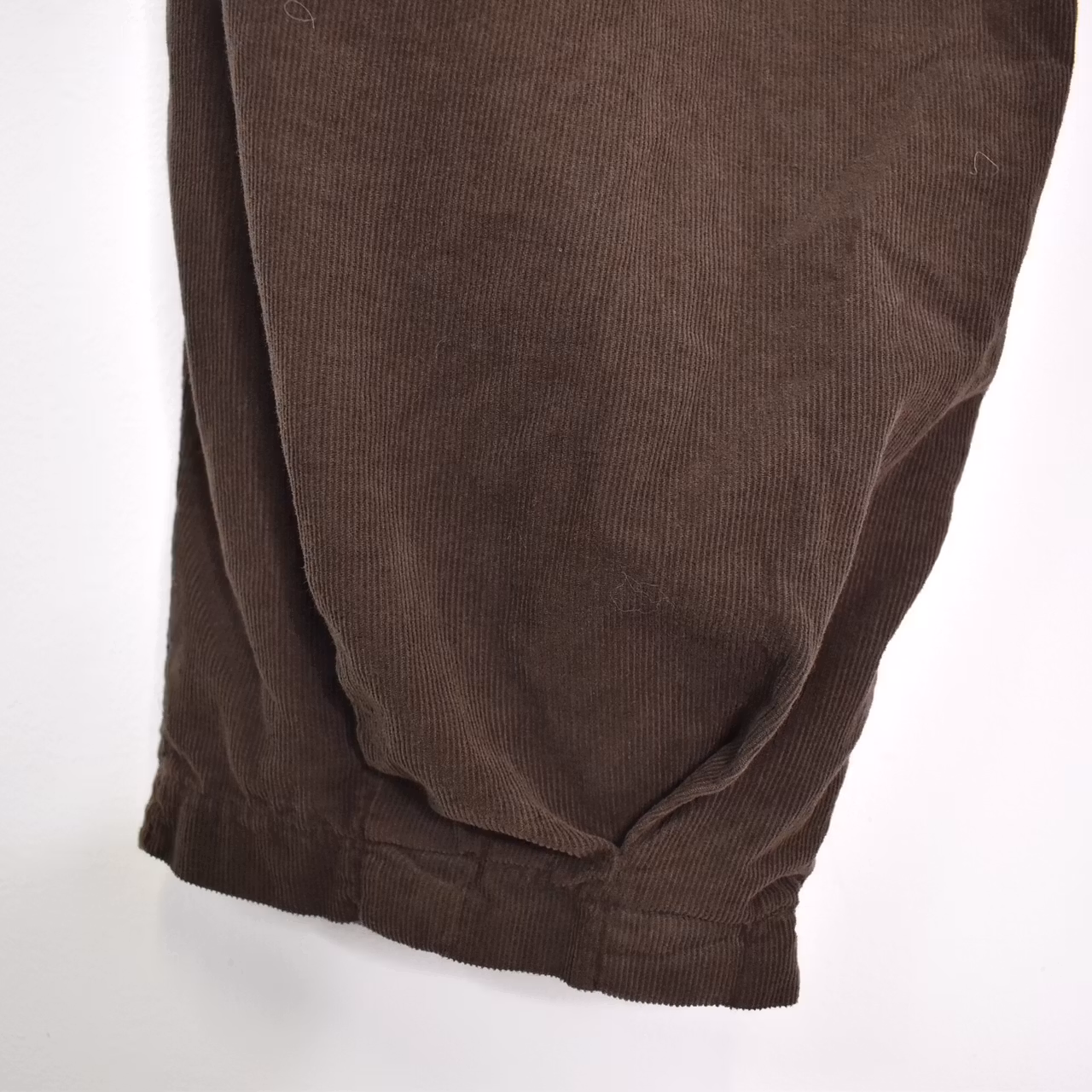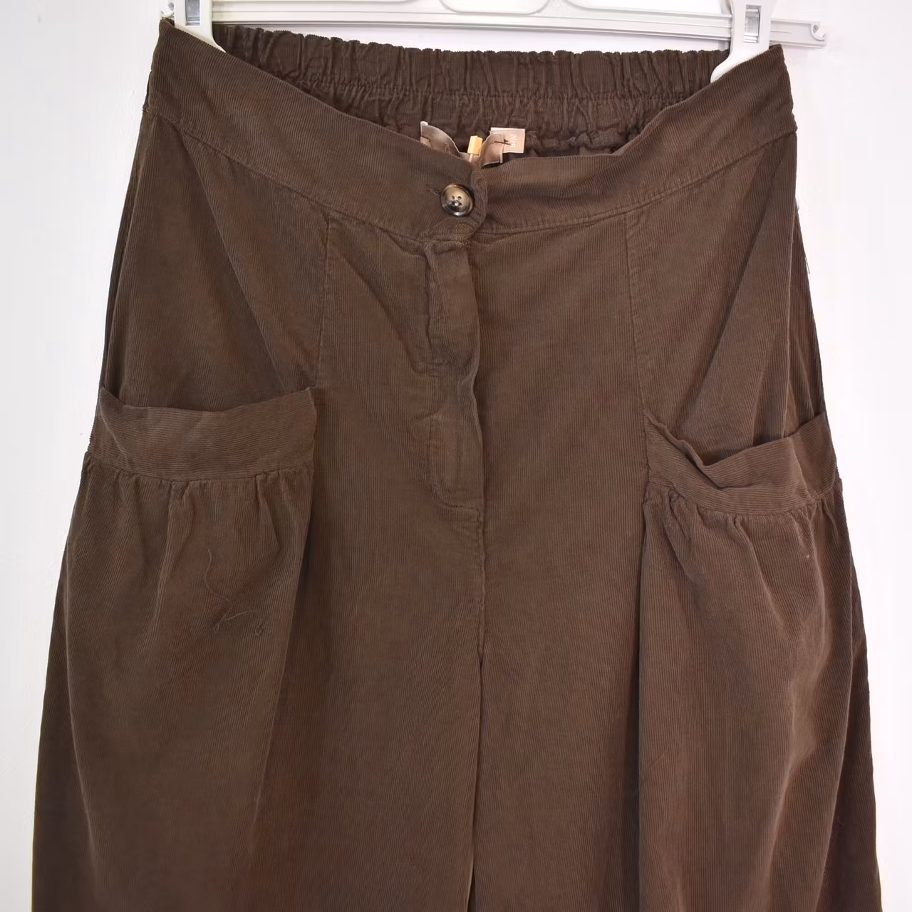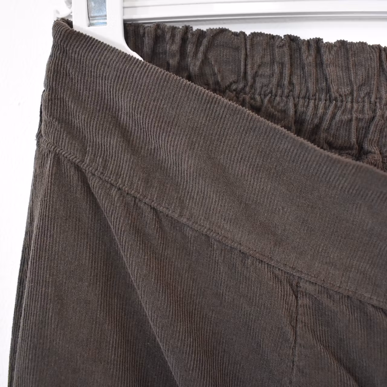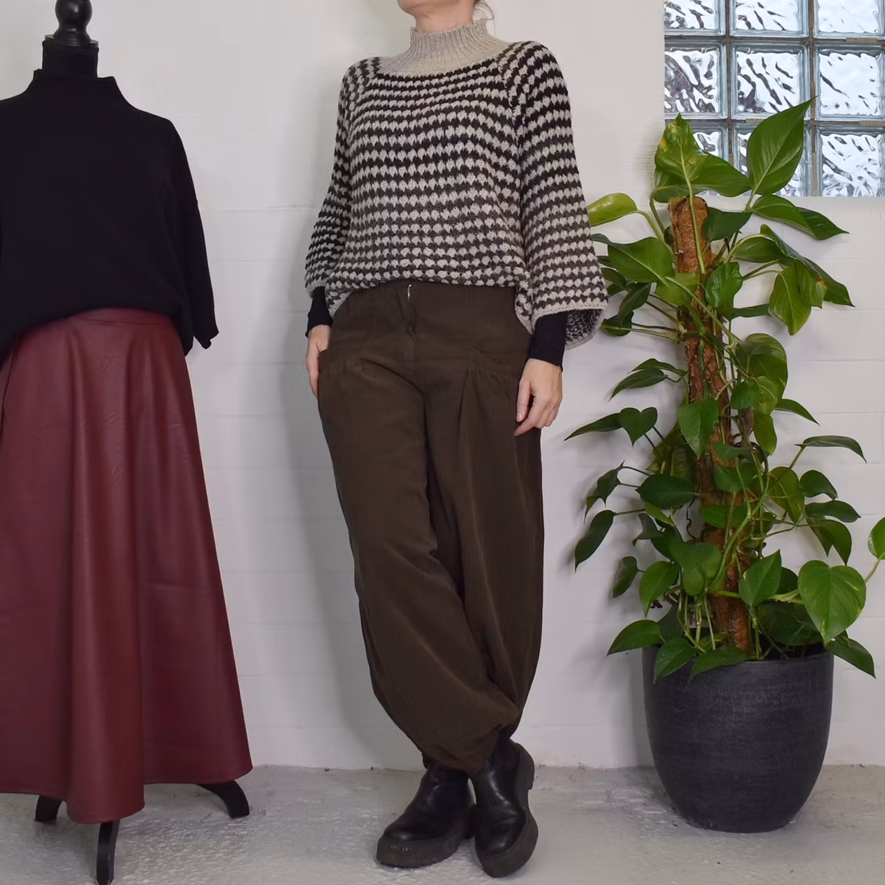 Det här är en läcker byxa i smalspårig manchester med pösiga ben och bylsiga fickor fram. I midjan finns en stretchig resår baktill. Benslutet är smalt och tyget är rynkat ovanför. Byxan stängs med knapp och dragkedja i gylfen. Observera att midjan kan upplevas som liten och att tyget inte innehåller stretch. Modellen har ett midjemått på cirka 78cm, en stuss på cirka 99cm, är 163cm lång och bär storlek S/M.