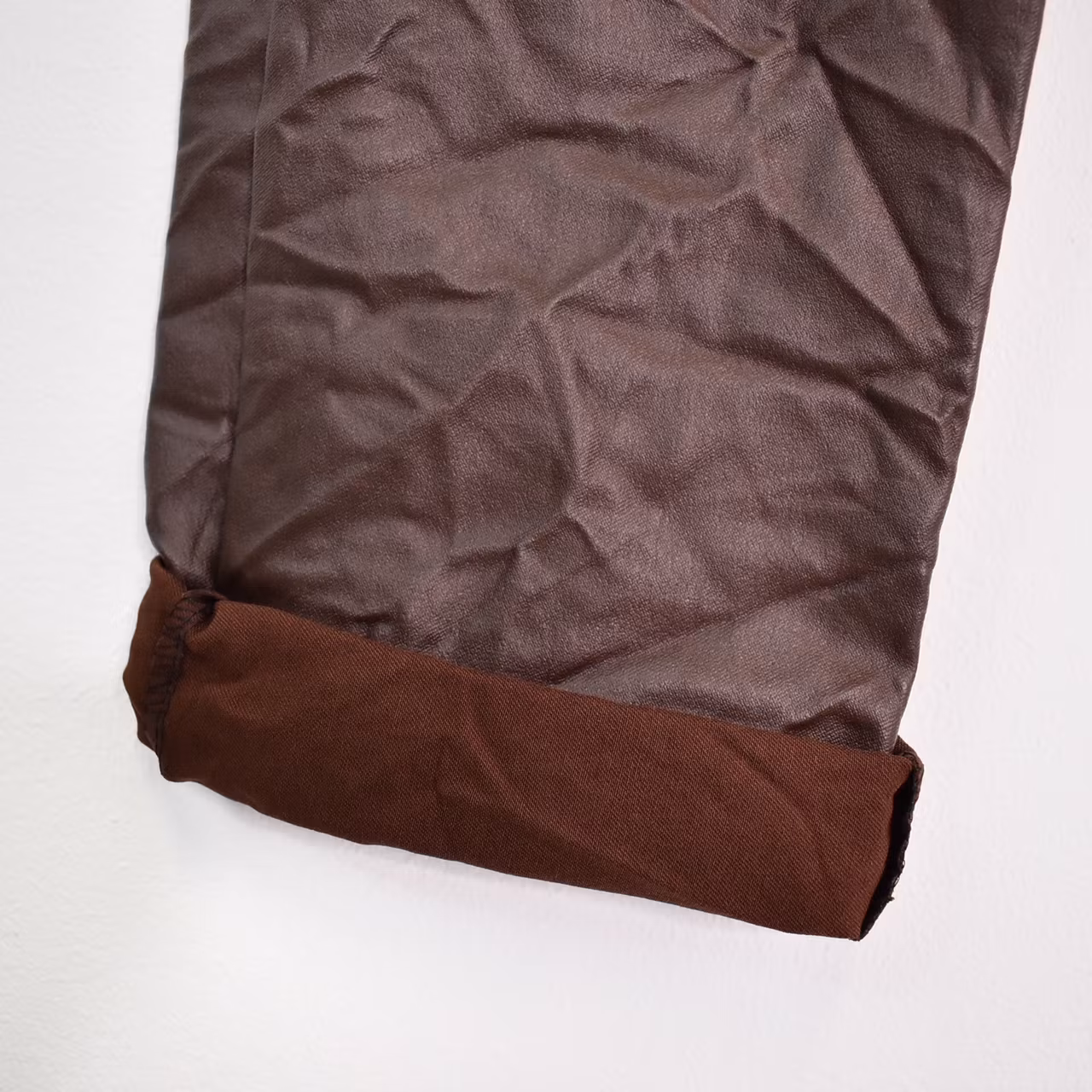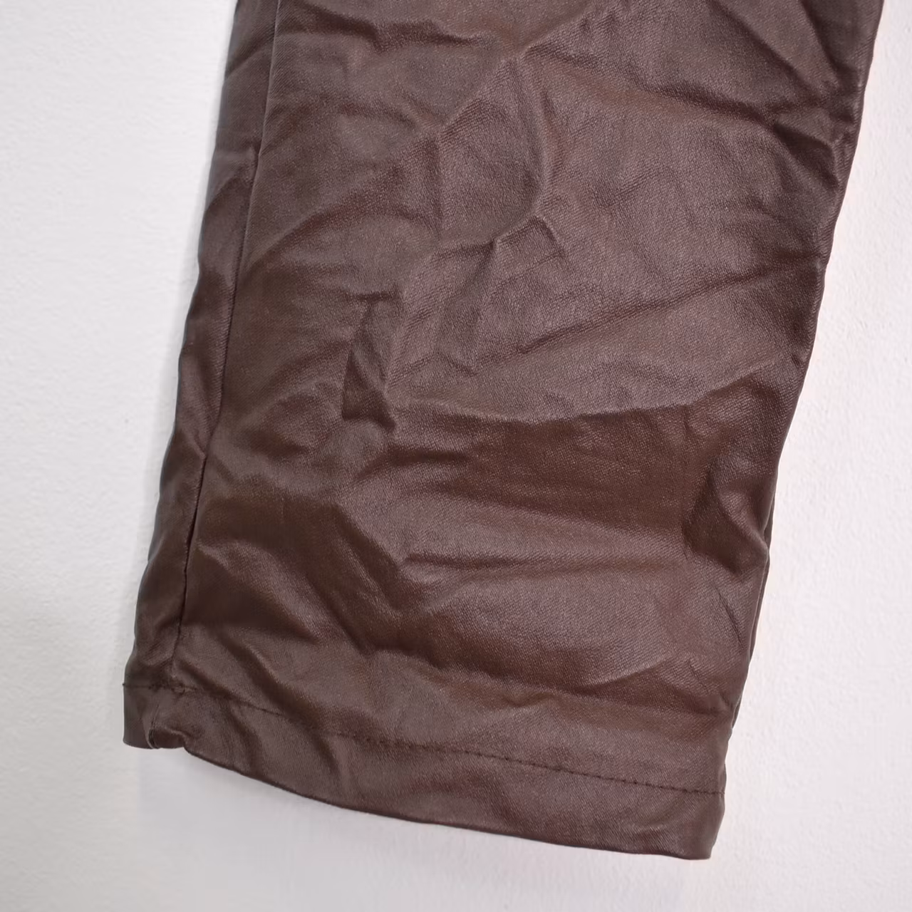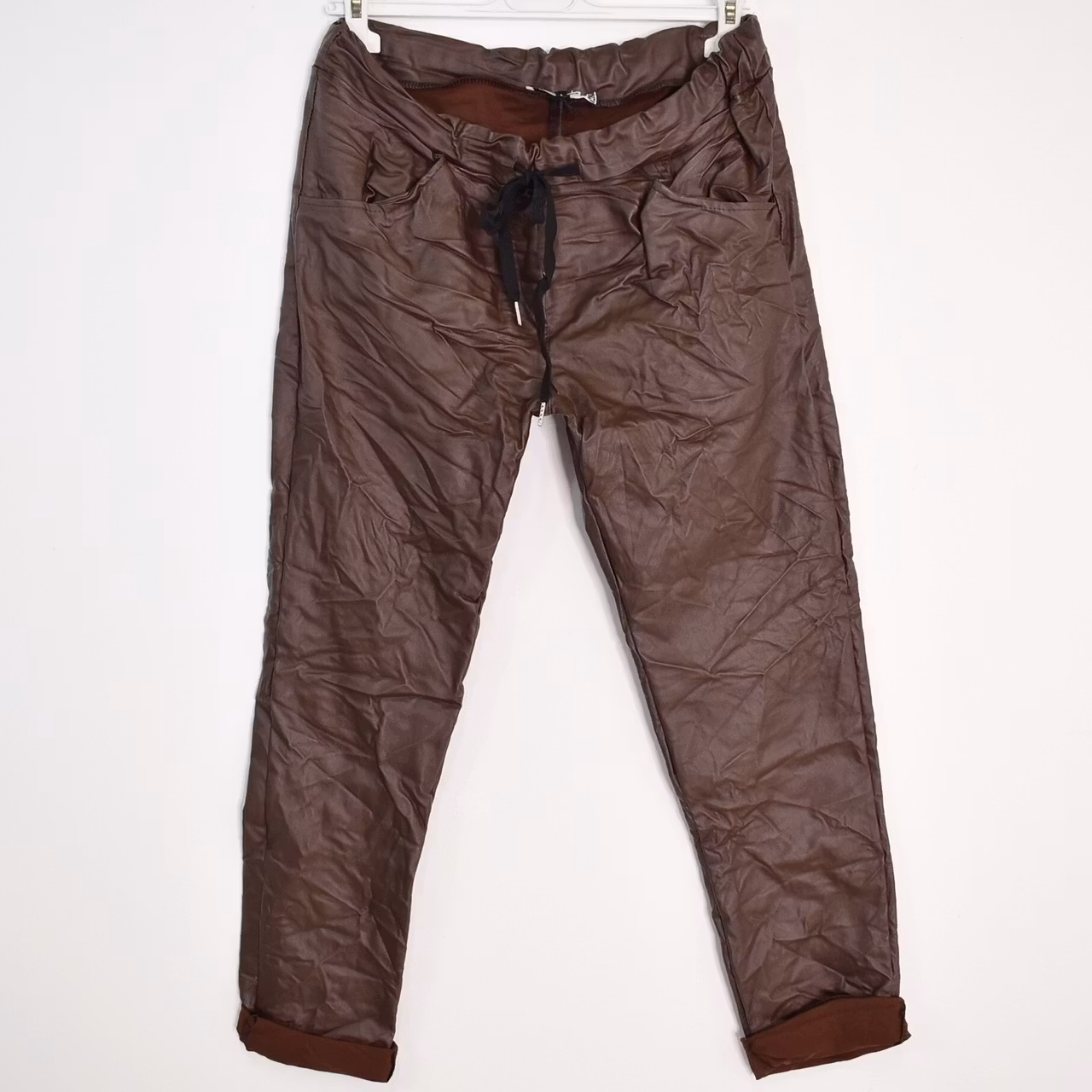Det här är en snygg byxa med läcker vaxad yta och stretchig resår i midjan. Där är två fickor i sidorna och två låga baktill. Knytband finns i midjan samt fejkgylf fram. Obs! Dessa är stora i måtten samtidigt som materialet, trots att det innehåller elastan, inte är så stretchigt. Modellen har ett midjemått på cirka 76cm, en stussvidd på cirka 99cm, är 163cm lång och bär S/M. Måtten är endast ungefärliga och det kan skilja +/-1-2cm mellan exemplaren.