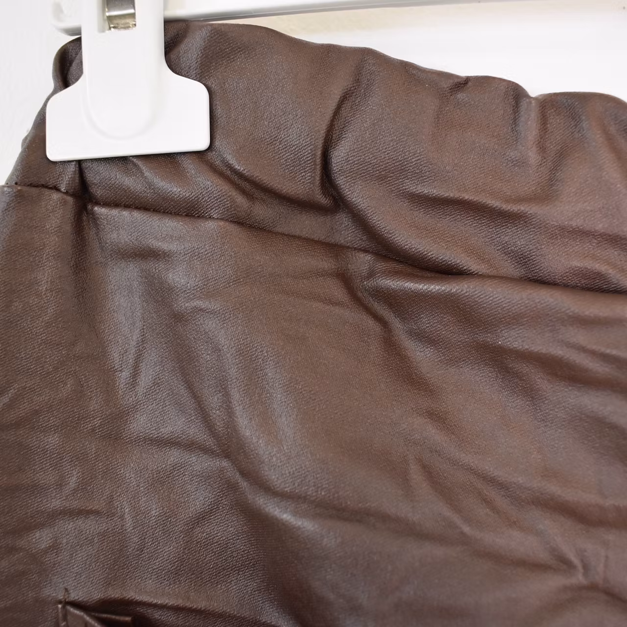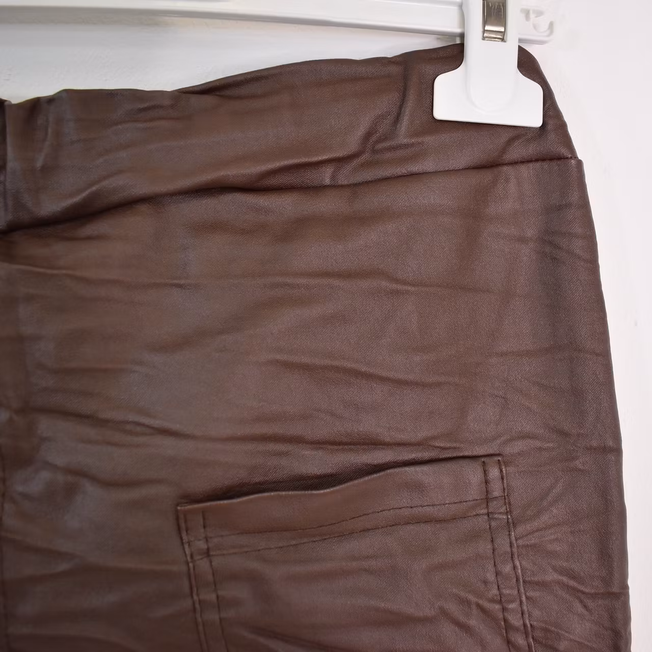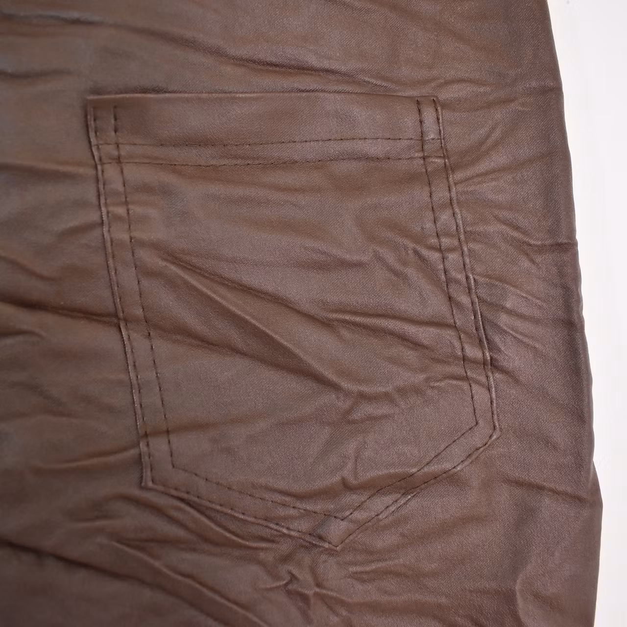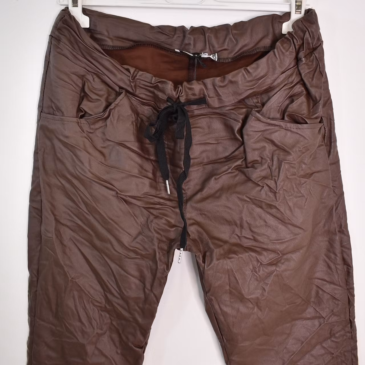 Det här är en snygg byxa med läcker vaxad yta och stretchig resår i midjan. Där är två fickor i sidorna och två låga baktill. Knytband finns i midjan samt fejkgylf fram. Obs! Dessa är stora i måtten samtidigt som materialet, trots att det innehåller elastan, inte är så stretchigt. Modellen har ett midjemått på cirka 76cm, en stussvidd på cirka 99cm, är 163cm lång och bär S/M. Måtten är endast ungefärliga och det kan skilja +/-1-2cm mellan exemplaren.