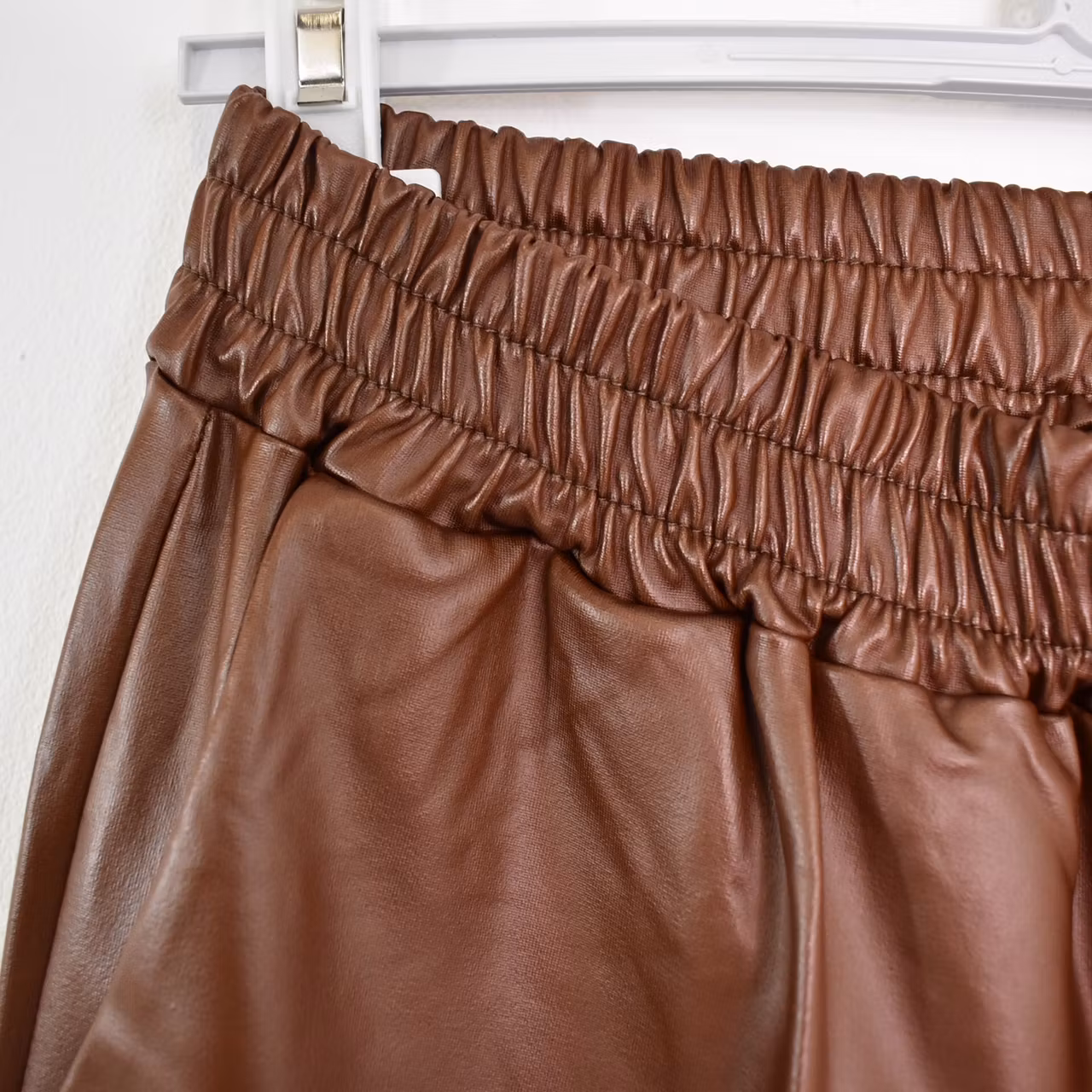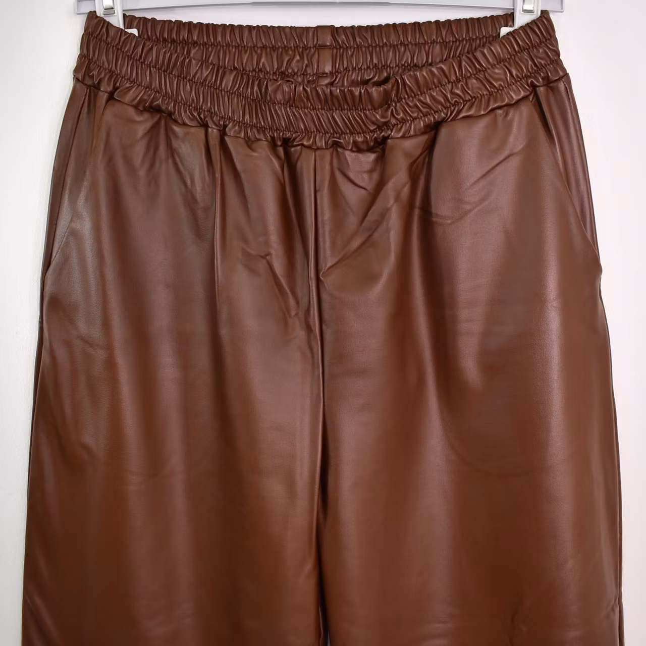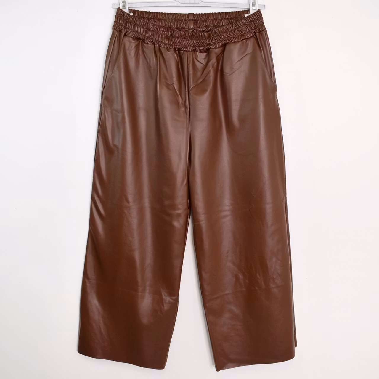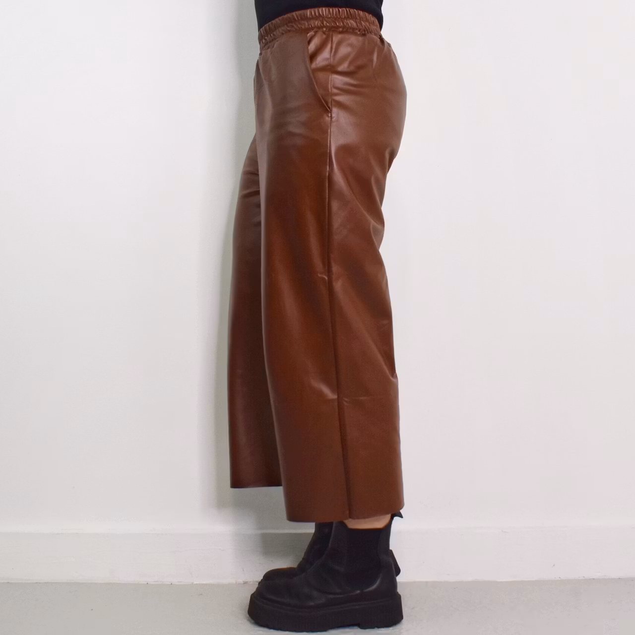 Det här är en läcker kort byxa i glansigt konstskinn. Byxan har vida ben och stretchig resår i midjan. I sidorna finns sneda fickor. Benen är avklippta i tyget så där finns ingen söm i benslutet. Materialet är ganska tunt, mjukt och stretchigt. Passformen är avslappnad. Modellen har en midjevidd på cirka 78cm, en stuss på cirka 99cm, är 163cm lång och bär S/M.