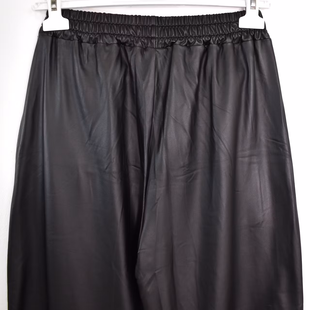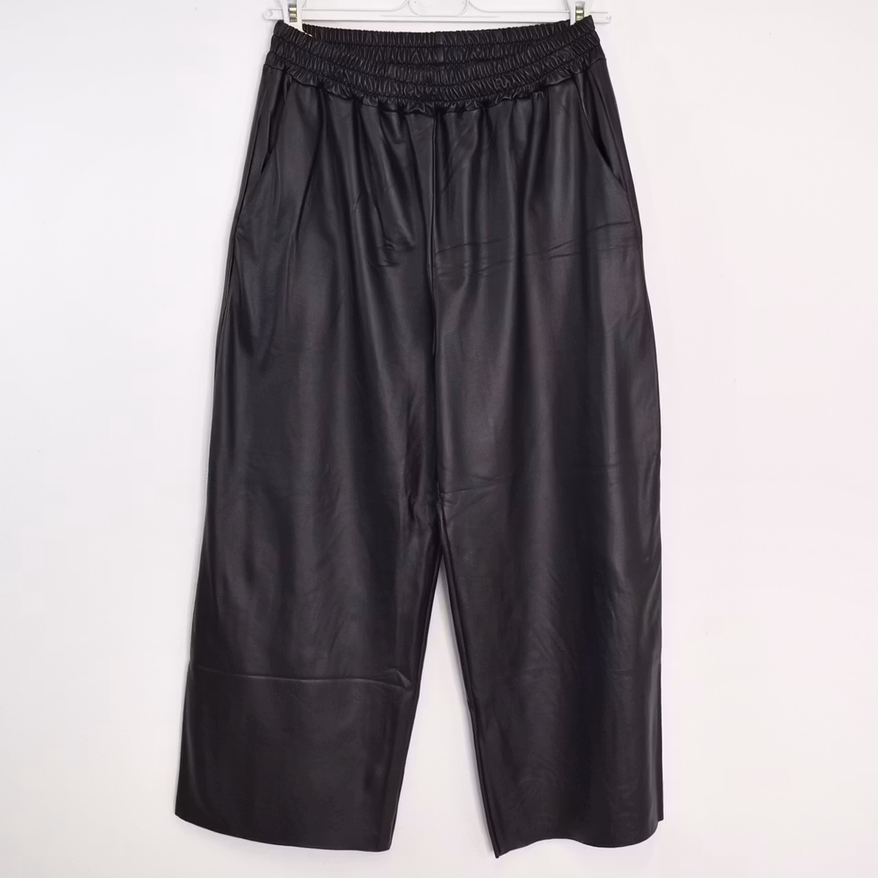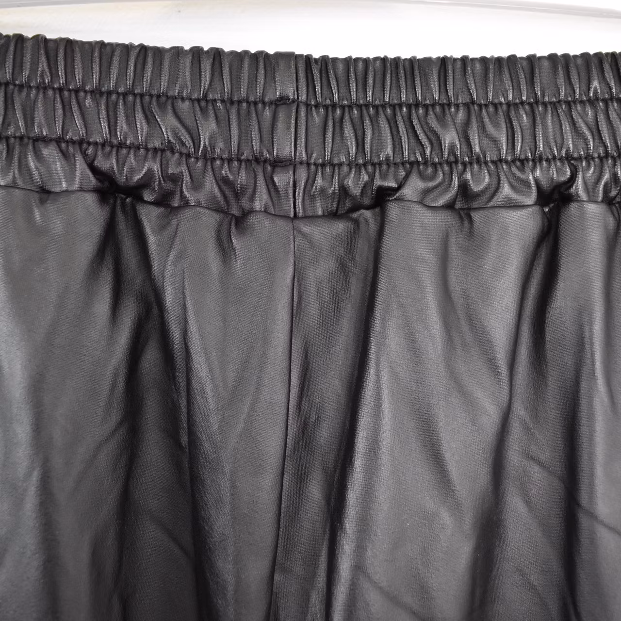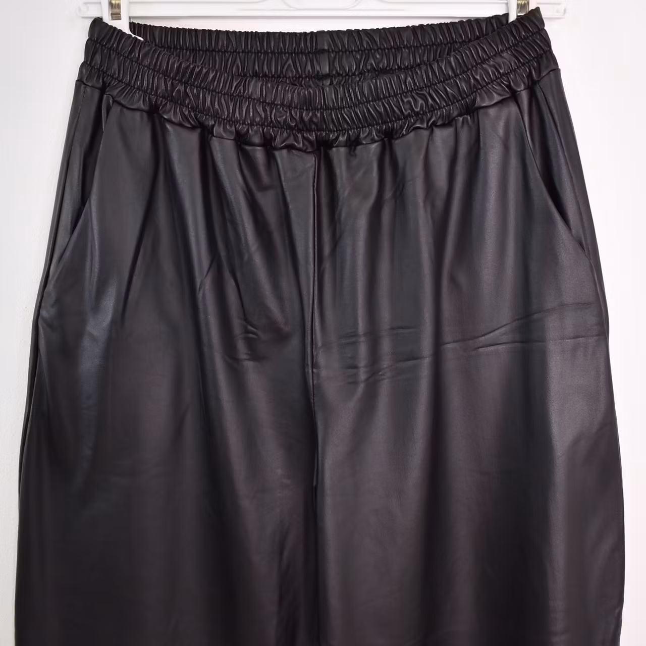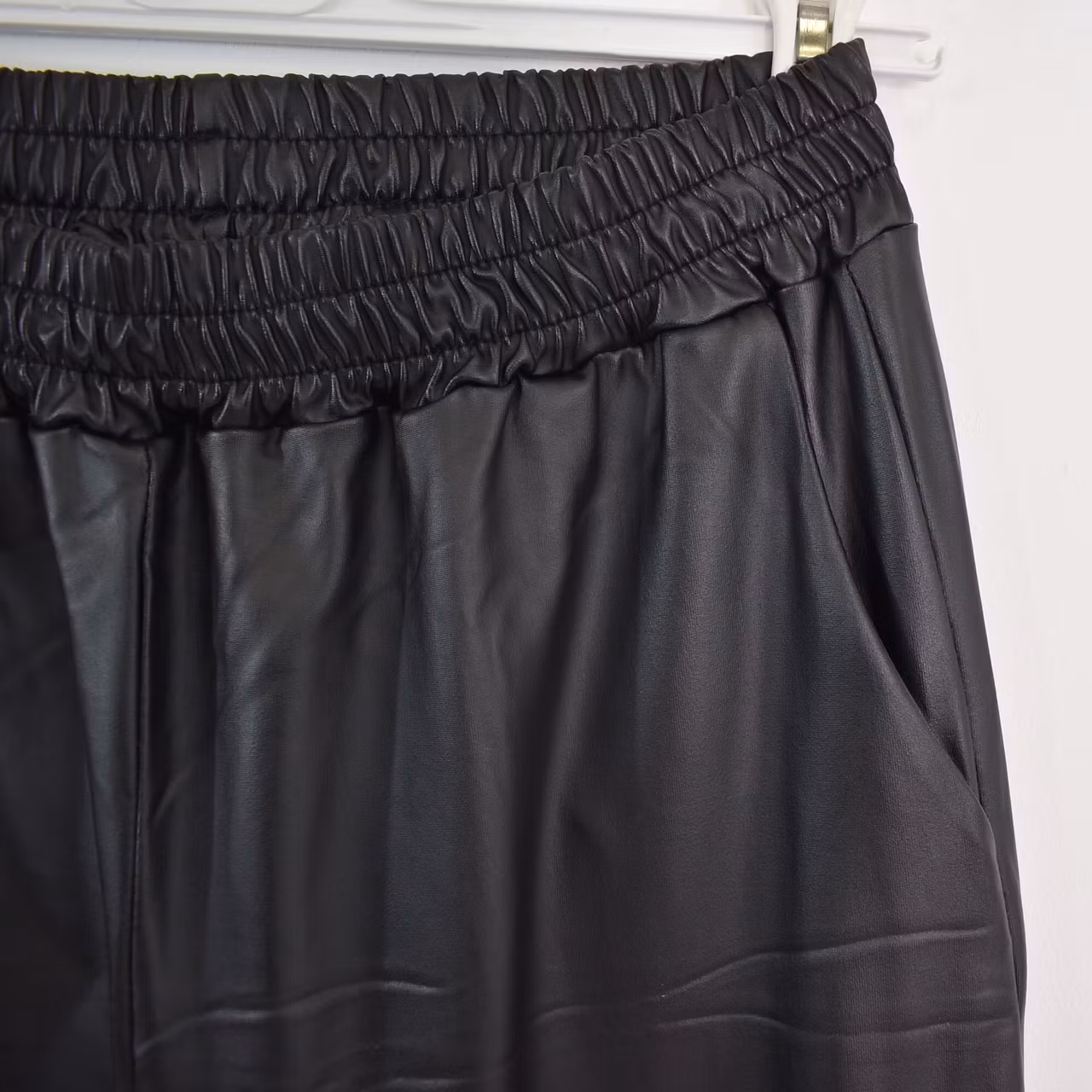 Det här är en läcker kort byxa i glansigt konstskinn. Byxan har vida ben och stretchig resår i midjan. I sidorna finns sneda fickor. Benen är avklippta i tyget så där finns ingen söm i benslutet. Materialet är ganska tunt, mjukt och stretchigt. Passformen är avslappnad. Modellen har en midjevidd på cirka 78cm, en stuss på cirka 99cm, är 163cm lång och bär S/M.