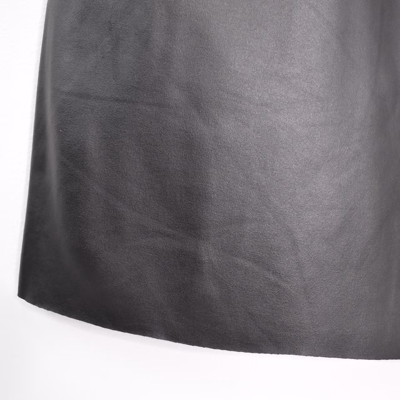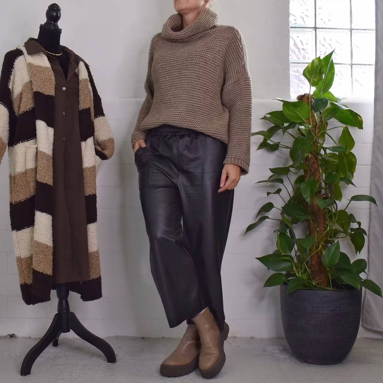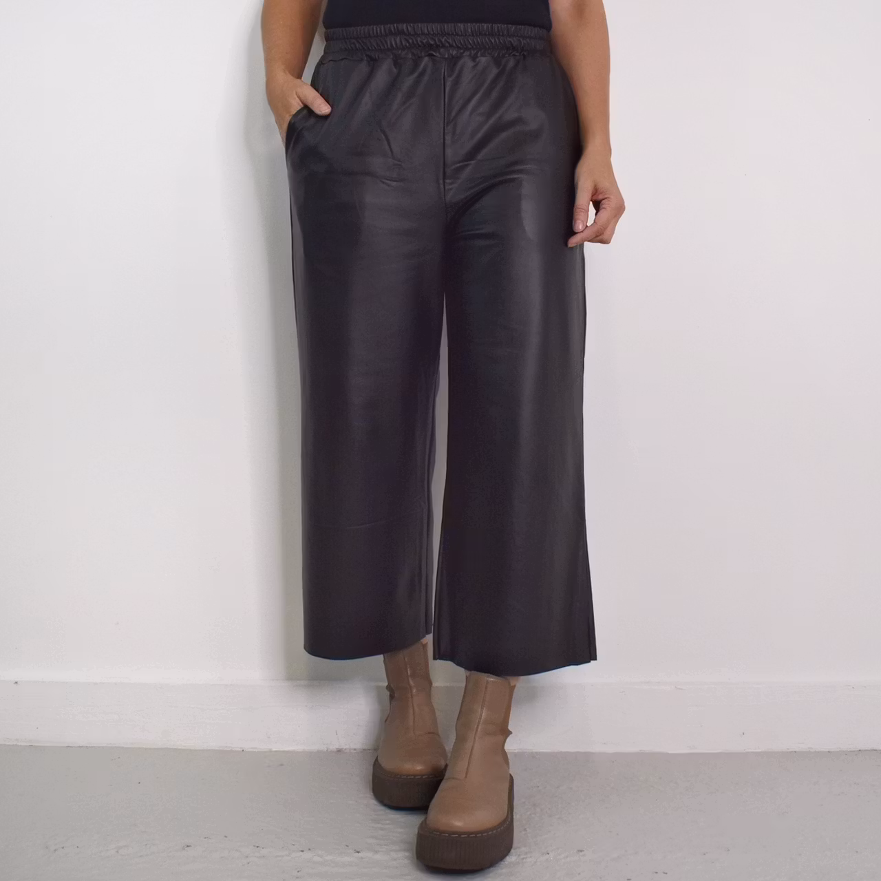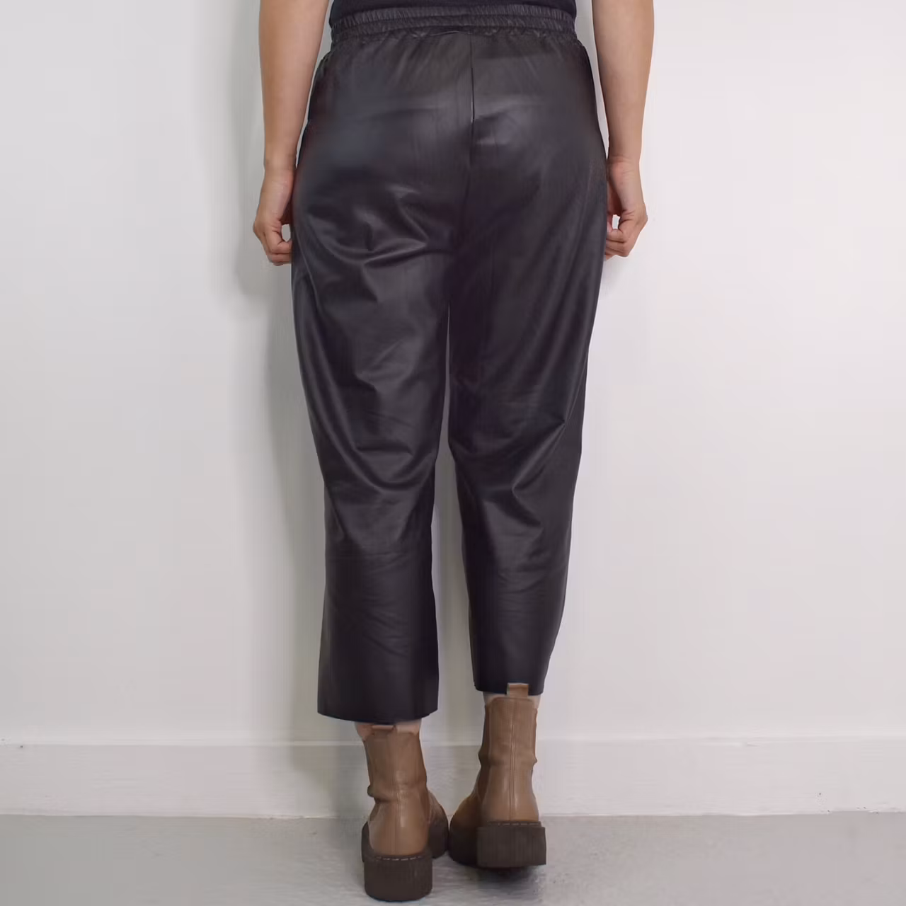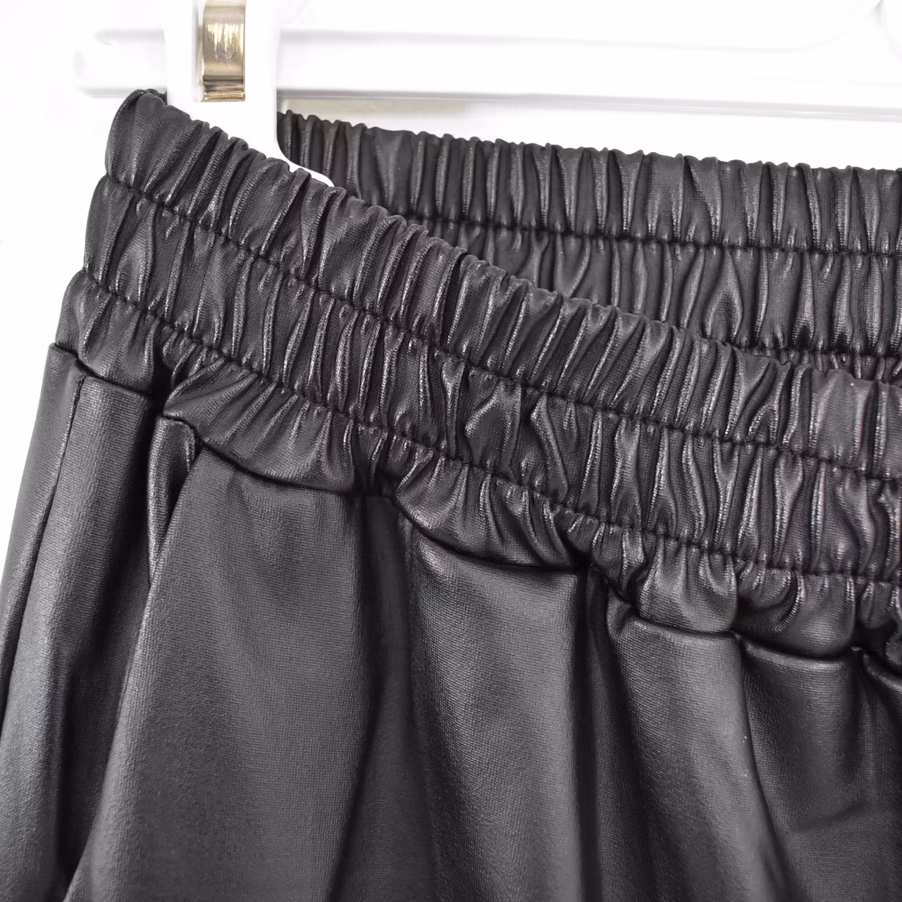 Det här är en läcker kort byxa i glansigt konstskinn. Byxan har vida ben och stretchig resår i midjan. I sidorna finns sneda fickor. Benen är avklippta i tyget så där finns ingen söm i benslutet. Materialet är ganska tunt, mjukt och stretchigt. Passformen är avslappnad. Modellen har en midjevidd på cirka 78cm, en stuss på cirka 99cm, är 163cm lång och bär S/M.