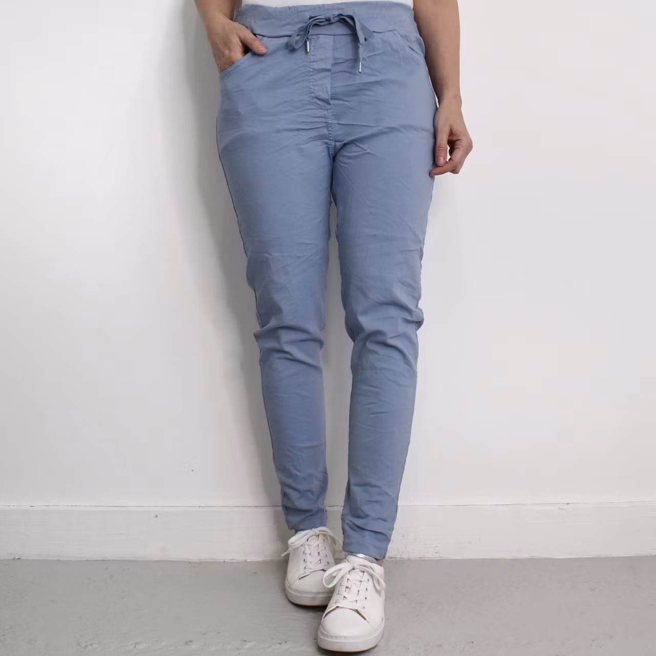 Det här är en bekväm, snygg och användbar komfortbyxa i femficks-modell med låga fickor bak. I midjan är där knytband och stretchig resår. Fejkgylf finns framtill. Midjan är mellanhög. Materialet är tunt, behagligt och väldigt stretchigt. Modellen har ett midjemått på cirka 76cm, en stussvidd på cirka 98cm, är 163cm lång och bär 36/38. Observera: Dessa byxor har en skrynkeleffekt som kan variera något och effekten försvinner vid tvätt så att tyget slätas ut. På grund av byxans speciella modell och det mycket stretchiga materialet kan måtten skilja sig en aning mellan olika exemplar. Vid infärgning krymper tyget olika mycket, vilket gör att byxan inte går att producera i exakta mått varje gång. Därför kan det förekomma en viss variation på cirka ±1–2 cm på alla mått. Det är också bra att känna till att tyget kan töja sig olika mycket både vid användning och tvätt (ha det i åtanke när du väljer storlek). Exakt hur det förändras går tyvärr inte att förutse, på grund av materialets speciella egenskaper och unika karaktär. Kulörer kan aldrig återskapas till exakt samma nyans och därför kan även färgen skilja lite mellan exemplar som är tillverkade vid olika tillfällen.