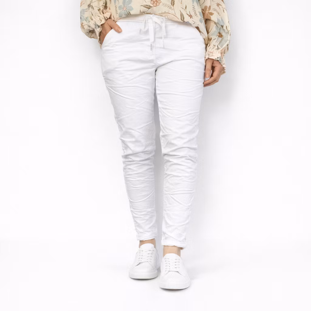 Det här är en bekväm, snygg och användbar komfortbyxa i femficks-modell med låga fickor bak. I midjan är där knytband och stretchig resår. Fejkgylf finns framtill. Midjan är mellanhög. Materialet är tunt, behagligt och väldigt stretchigt. Modellen har ett midjemått på cirka 76cm, en stussvidd på cirka 98cm, är 163cm lång och bär 36/38. Observera: Dessa byxor har en skrynkeleffekt som kan variera något och effekten försvinner vid tvätt så att tyget slätas ut. På grund av byxans speciella modell och det mycket stretchiga materialet kan måtten skilja sig en aning mellan olika exemplar. Vid infärgning krymper tyget olika mycket, vilket gör att byxan inte går att producera i exakta mått varje gång. Därför kan det förekomma en viss variation på cirka ±1–2 cm på alla mått. Det är också bra att känna till att tyget kan töja sig olika mycket både vid användning och tvätt (ha det i åtanke när du väljer storlek). Exakt hur det förändras går tyvärr inte att förutse, på grund av materialets speciella egenskaper och unika karaktär. Kulörer kan aldrig återskapas till exakt samma nyans och därför kan även färgen skilja lite mellan exemplar som är tillverkade vid olika tillfällen.
