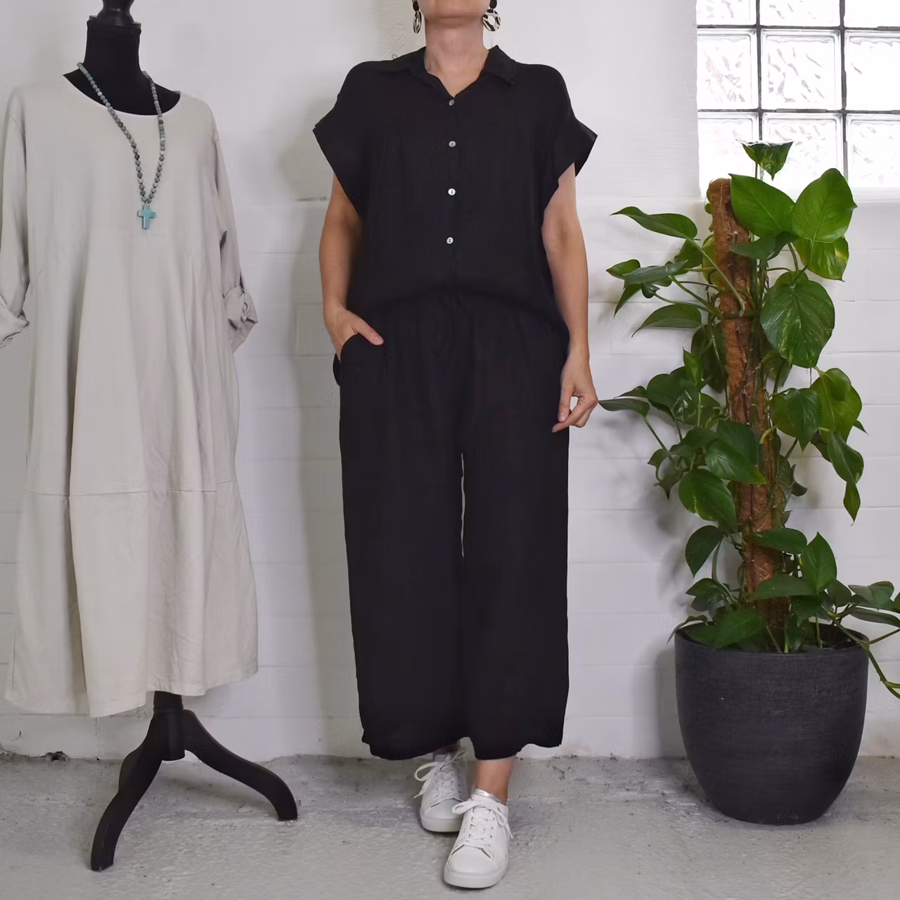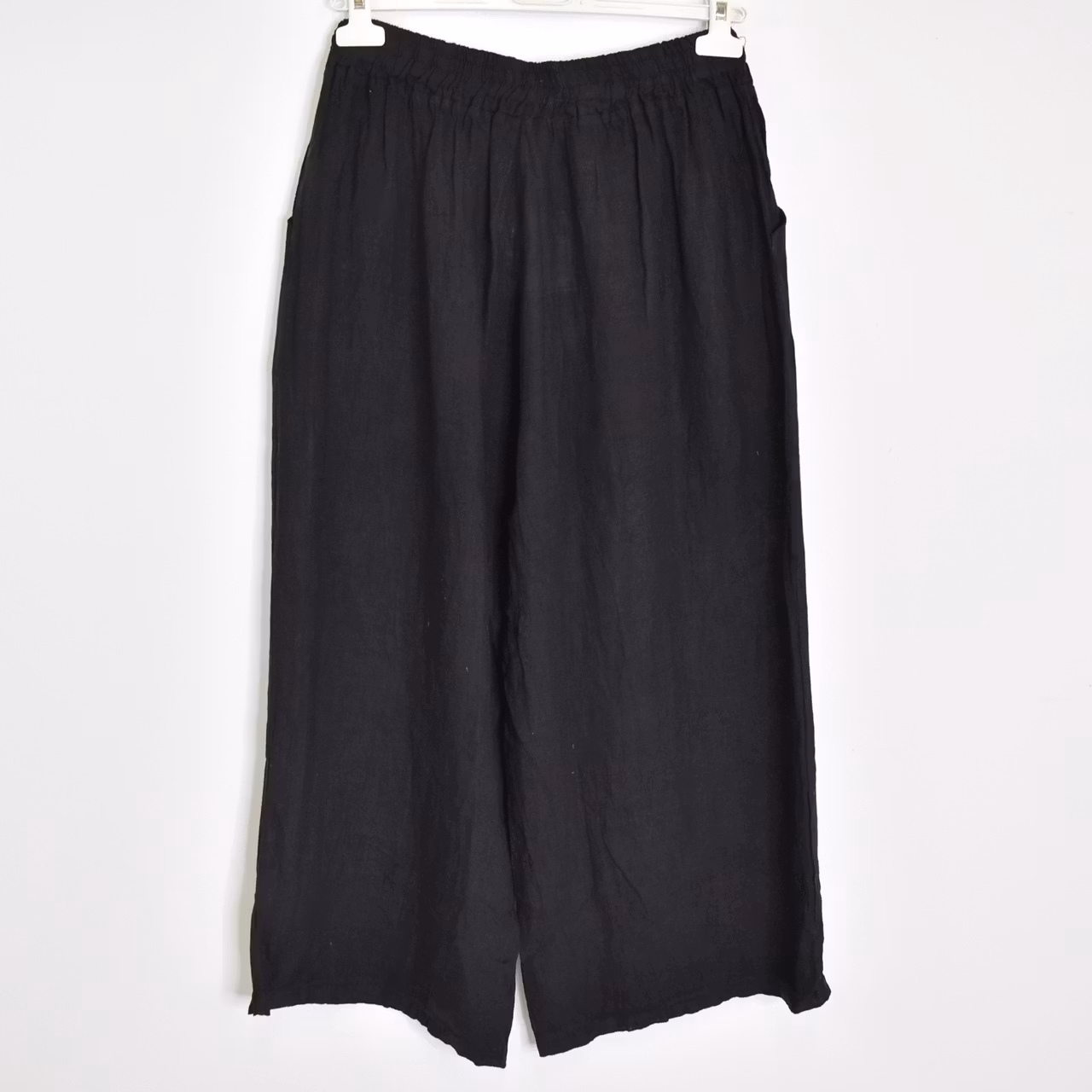 Det här är en skön coulettbyxa med korta vida ben. Det finns fickor i sidorna, en stretchresår och knytband i midjan. Materialet innehåller inte stretch och tyget är tunt så det kan upplevas som något genomskinligt. Modellen har ett midjemått på cirka 79cm, en stussvidd på cirka 99cm och är 163cm lång. Förekomsten av streck, färgskiftningar etc. inte är defekter utan en del av det som gör tyget vackert.