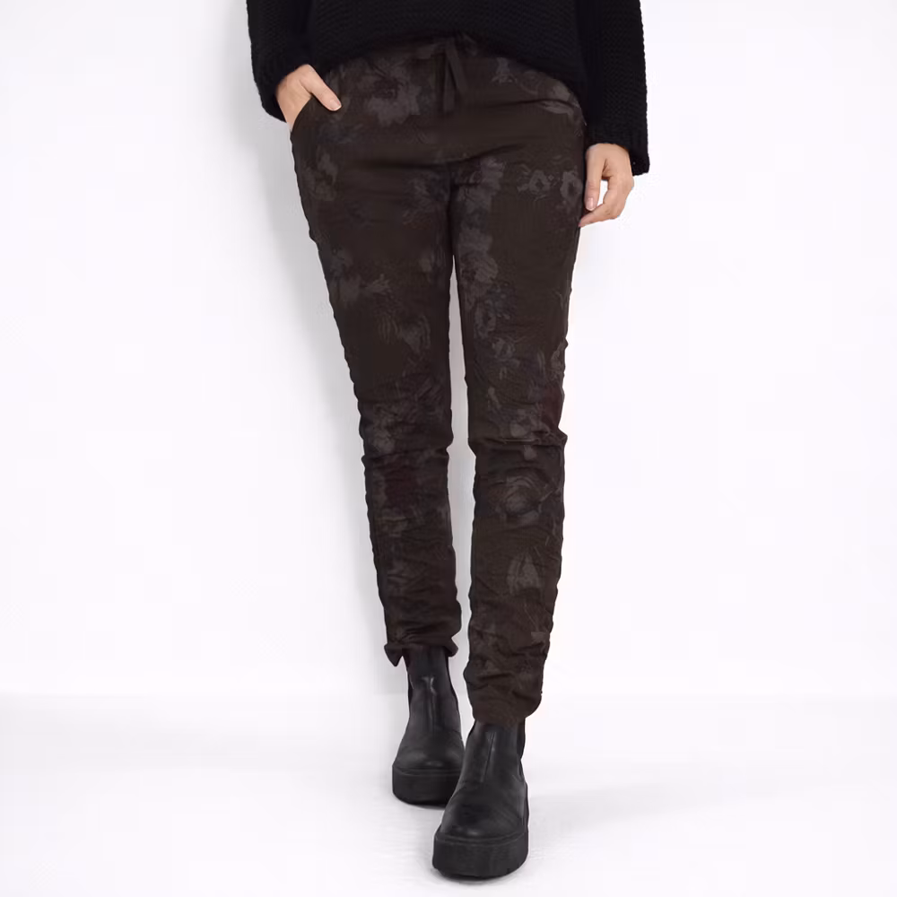 Det här är en skön komfortbyxa med vackert mönster. Det finns knytband och resår i midjan samt fejkgylf fram. Byxan har fyra fickor varav två låga baktill. Modellen har ett midjemått på cirka 76cm, en stuss på cirka 99cm, är 163cm lång och bär storlek S/M. Observera: Dessa byxor har en lätt skrynkeleffekt som kan variera något och effekten försvinner vid tvätt. På grund av byxans speciella modell och det mycket stretchiga materialet kan måtten skilja sig en aning mellan olika exemplar. Vid infärgning krymper tyget olika mycket, vilket gör att byxan inte går att producera i exakta mått varje gång. Därför kan det förekomma en viss variation på cirka ±1–2 cm. Det är också bra att känna till att tyget kan töja sig olika mycket både vid användning och tvätt. Exakt hur det förändras går tyvärr inte att förutse, på grund av materialets speciella egenskaper och unika karaktär. Kulörer kan aldrig återskapas till exakt samma nyans och därför kan även färgen skilja lite mellan exemplar som är tillverkade vid olika tillfällen.