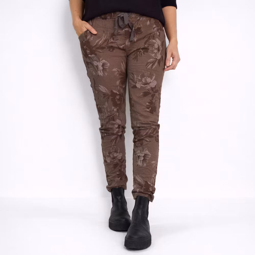 Det här är en skön komfortbyxa med snyggt blommigt mönster. Det finns knytband och stretchig resår i midjan samt fejkgylf fram. Byxan har fyra fickor (låga fickor bak). Modellen har ett midjemått på cirka 78cm, en stuss på cirka 99cm, är 163cm lång och bär storlek S/M. Observera: Dessa byxor har en lätt skrynkeleffekt som kan variera något och effekten försvinner vid tvätt. På grund av byxans speciella modell och material kan måtten skilja sig en aning mellan olika exemplar. Vid infärgning krymper tyget olika mycket, vilket gör att byxan inte går att producera i exakta mått varje gång. Därför kan det förekomma en viss variation på cirka ±1–2 cm. Det är också bra att känna till att tyget kan töja sig olika mycket både vid användning och tvätt. Exakt hur det förändras går tyvärr inte att förutse, på grund av materialets speciella egenskaper och unika karaktär.