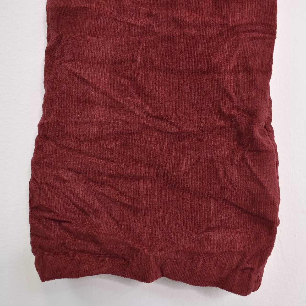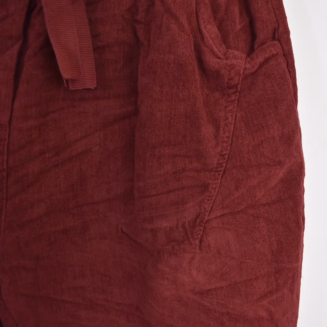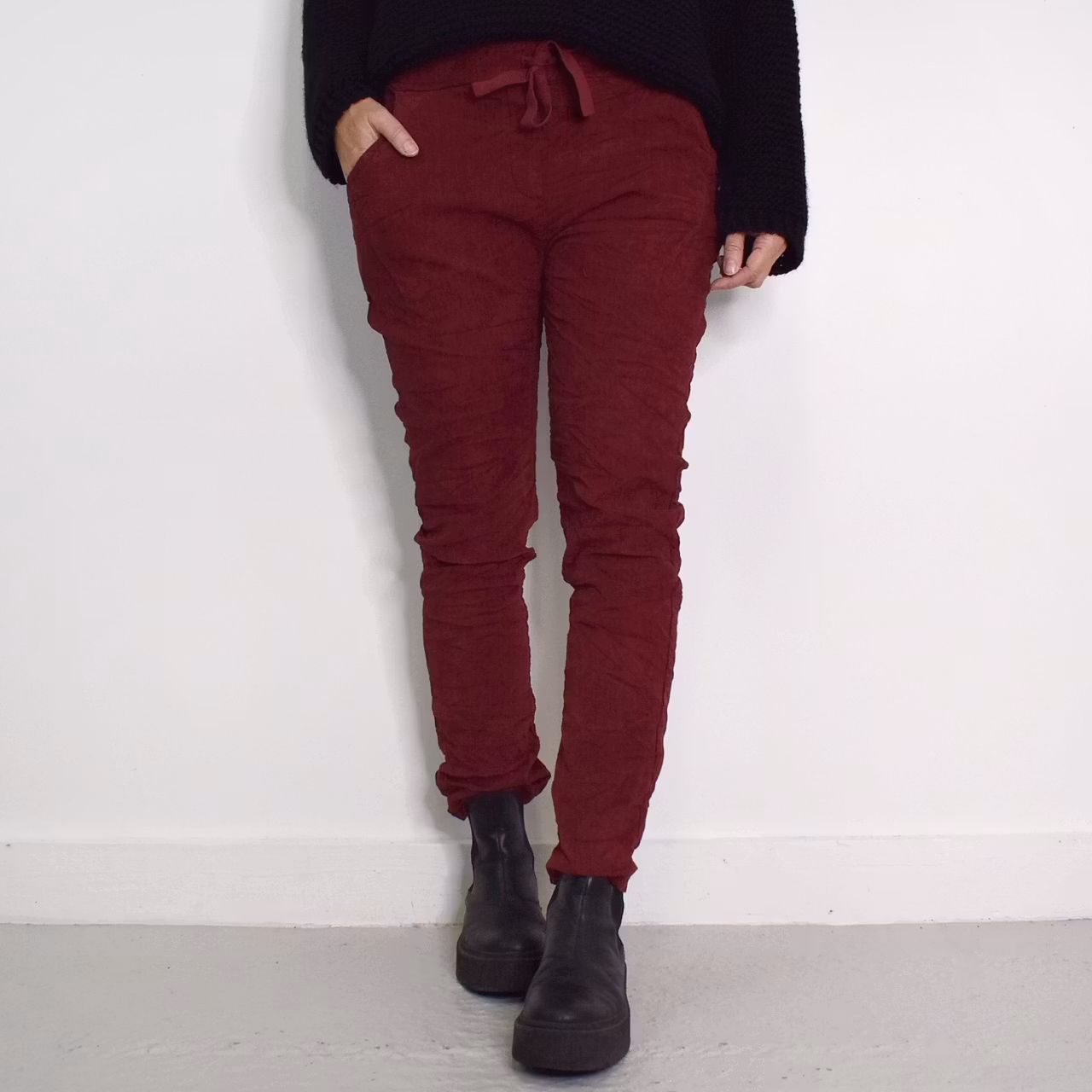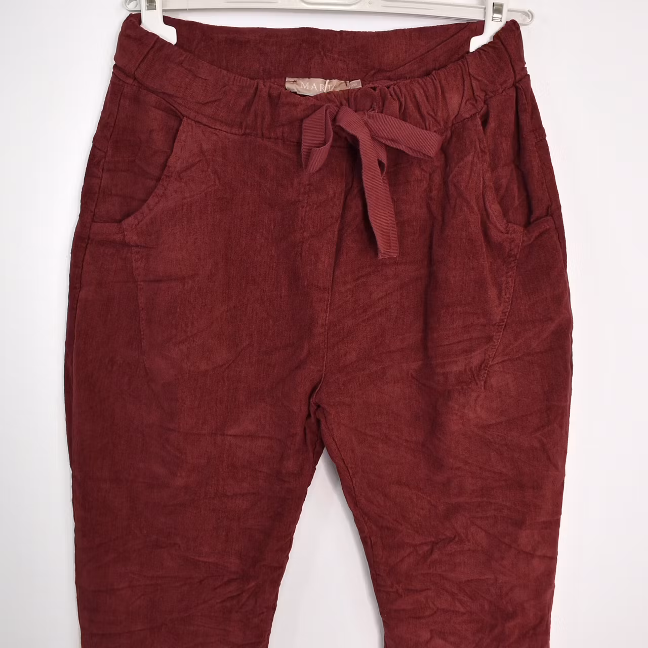 Det här är en skön byxa i stretchigt och mjukt smalspårigt manchestertyg. Det finns knytband och stretchig resår i midjan samt fejkgylf fram. Byxan har fyra fickor (låga fickor bak). Från fickorna fram går det en sned dekorativ söm. Modellen har ett midjemått på cirka 78cm, en stuss på cirka 99cm, är 163cm lång och bär storlek S/M. Observera: Dessa byxor har en lätt skrynkeleffekt som kan variera något och effekten försvinner vid tvätt. På grund av byxans speciella modell och material kan måtten skilja sig en aning mellan olika exemplar. Därför kan det förekomma en viss variation på cirka ±1–2 cm. Det är också bra att känna till att tyget kan töja sig olika mycket både vid användning och tvätt. Exakt hur det förändras går tyvärr inte att förutse.
