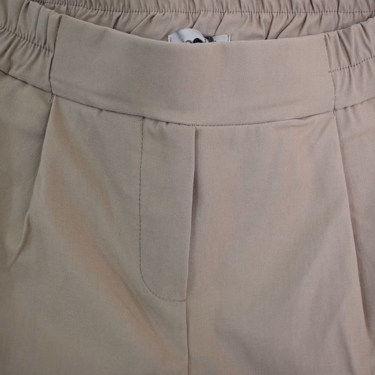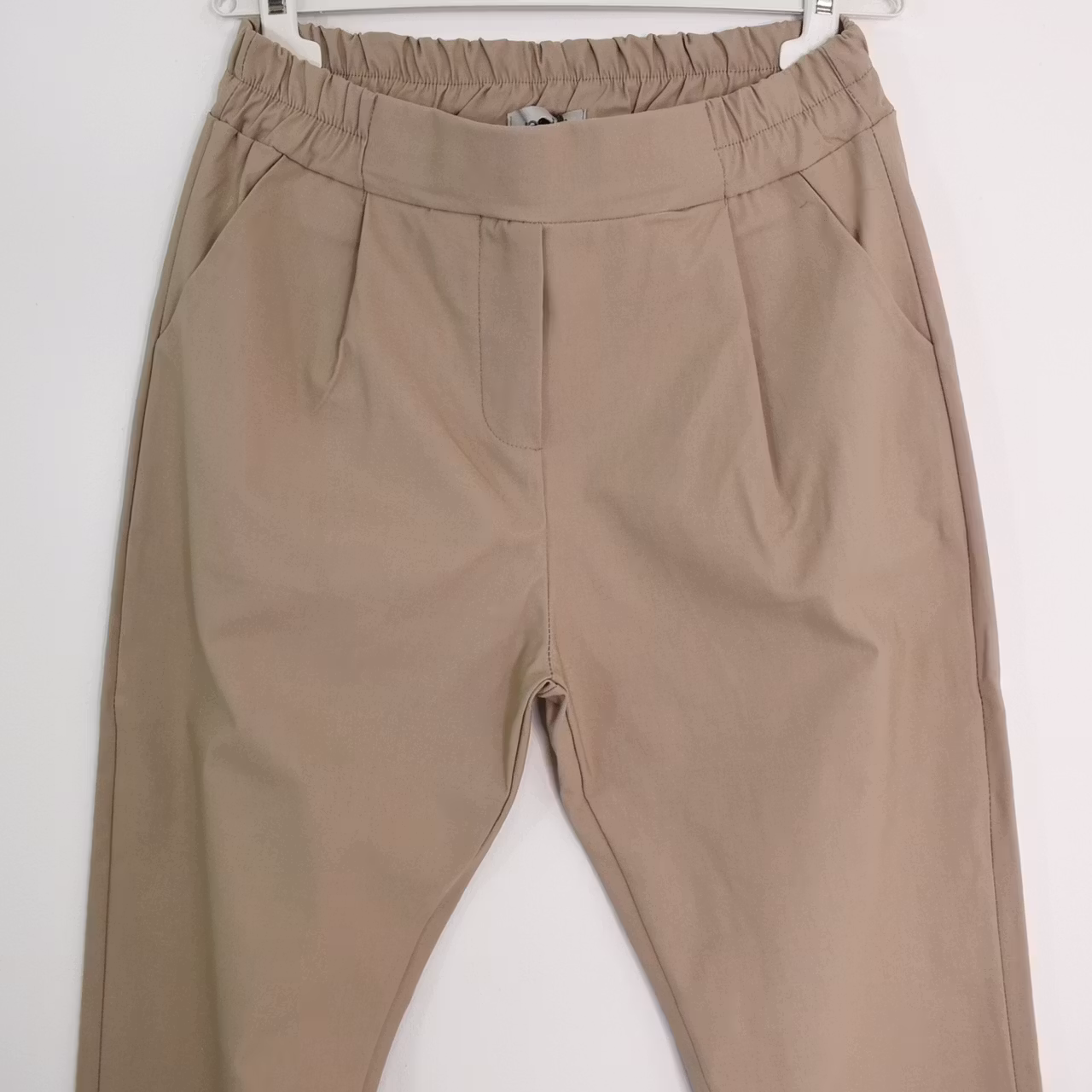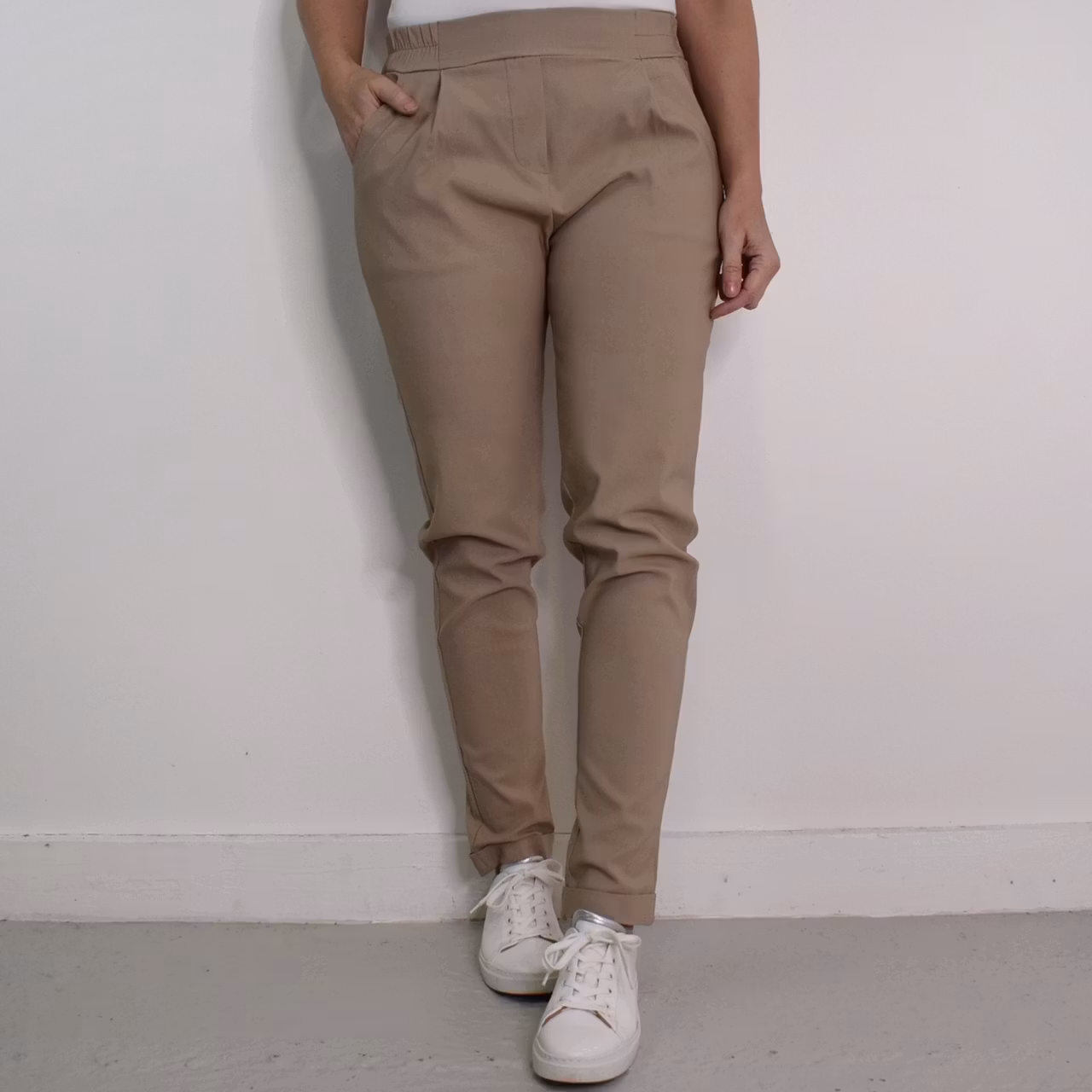 Det här är en stilig byxa i kostym-stil med avslappnad passform. Där är veck framtill, två sneda fickor samt fejkgylf fram. Baktill och på sidorna i midjan finns en stretchig resår och benslutet är uppvikt. Tyget är mjukt och stretchigt. Modellen har ett midjemått på cirka 79cm, en stussvidd på cirka 99cm, är 163cm lång och bär S/M.