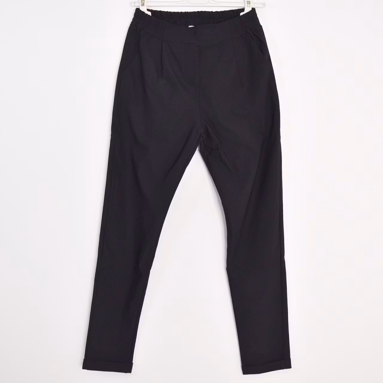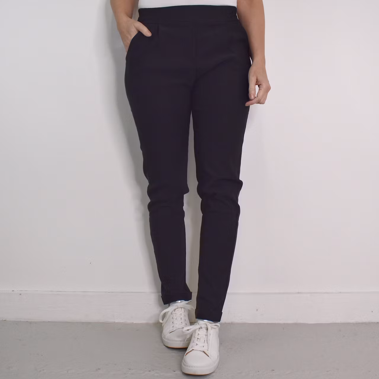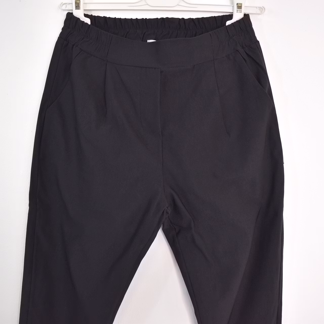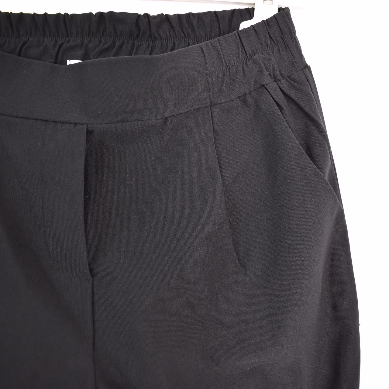 Bra att veta: Stretchigt och mjukt tyg. Veck framtill. Resår baktill och på sidorna i midjan. Uppvikta benslut.