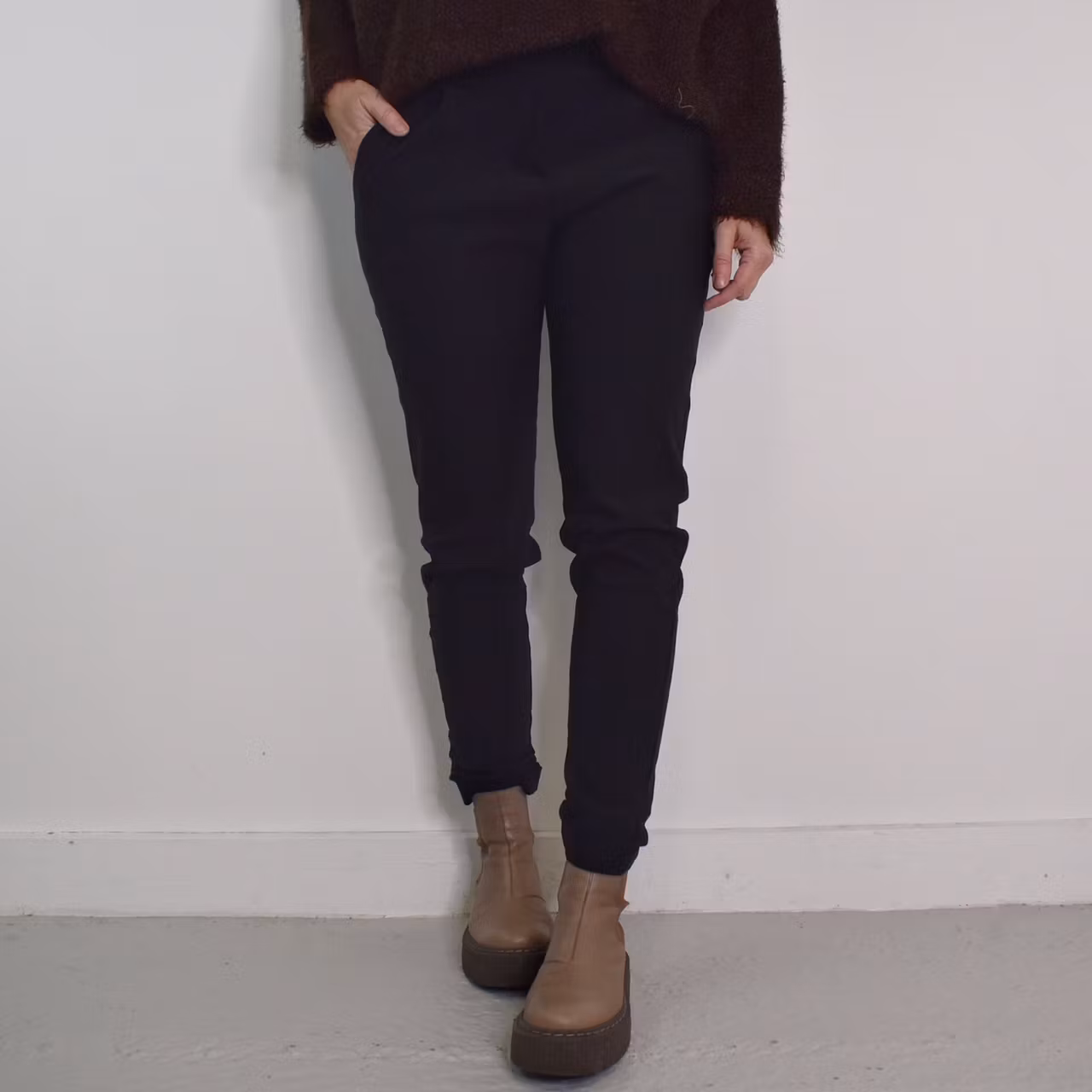 Det här är en stilig byxa i kostym-stil med avslappnad passform. Där är veck framtill, två sneda fickor samt fejkgylf fram. Baktill och på sidorna i midjan finns en stretchig resår och benslutet är uppvikt. Tyget är mjukt och stretchigt. Modellen har ett midjemått på cirka 79cm, en stussvidd på cirka 99cm, är 163cm lång och bär S/M.