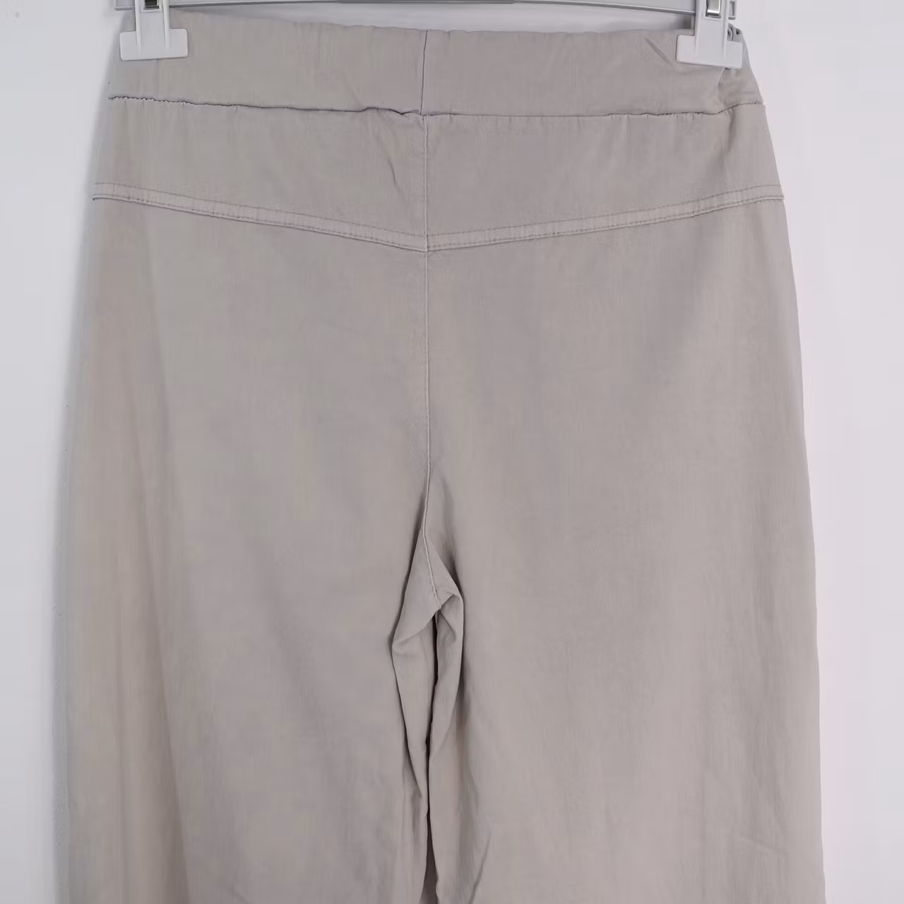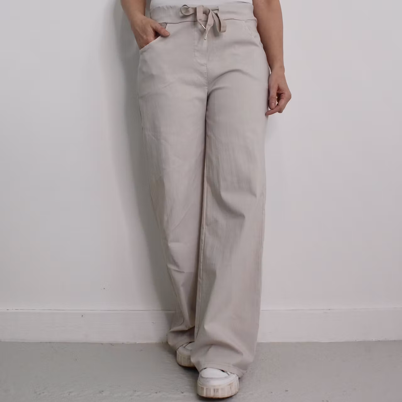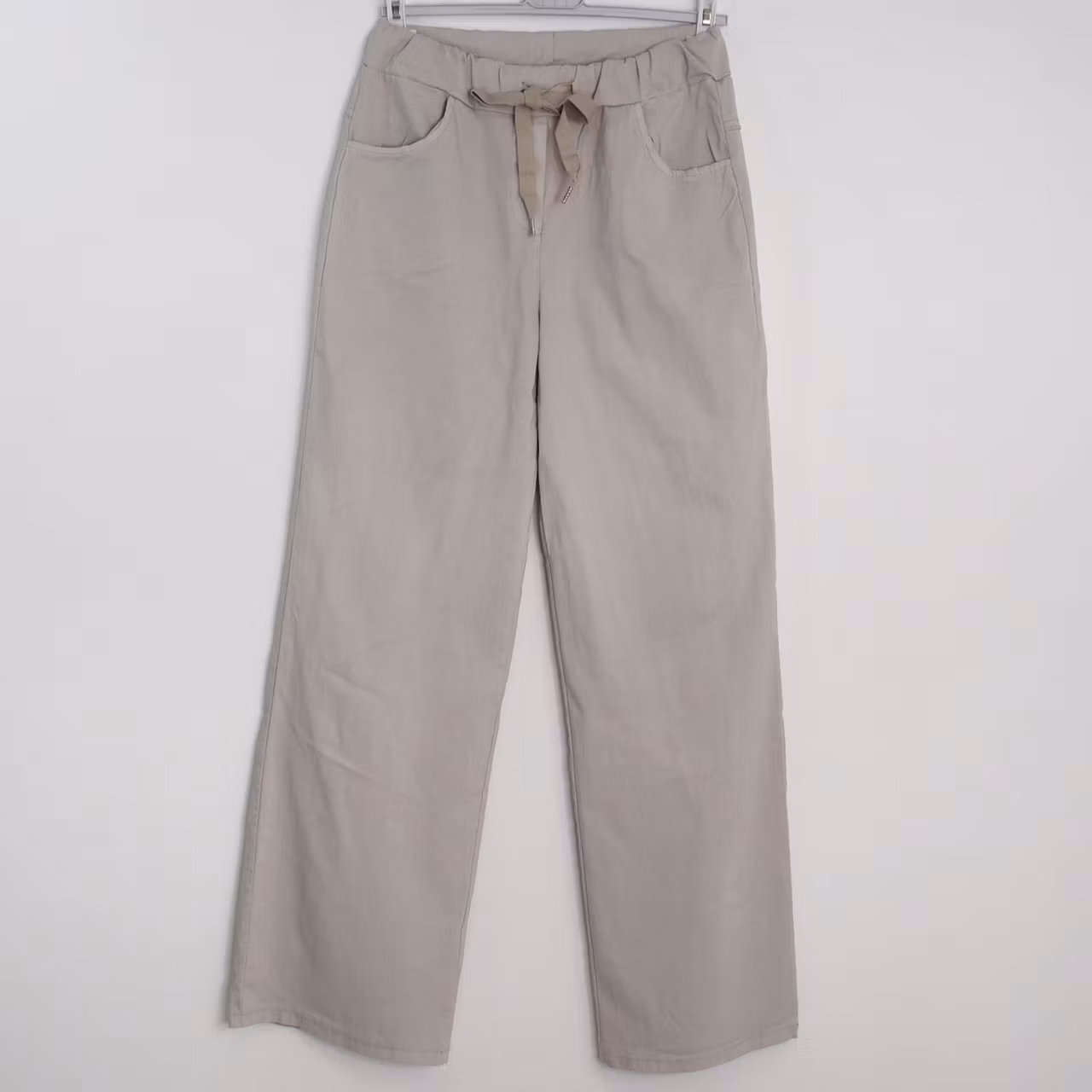 Det här är en skön vid byxa med långa, raka ben. Byxan har stretchig resår, knytband i midjan samt fejkgylf fram. Observera att dessa har extra långa benmått. Modellen har ett midjemått på cirka 79cm, en stussvidd på cirka 99cm, är 163cm lång och bär S/M.