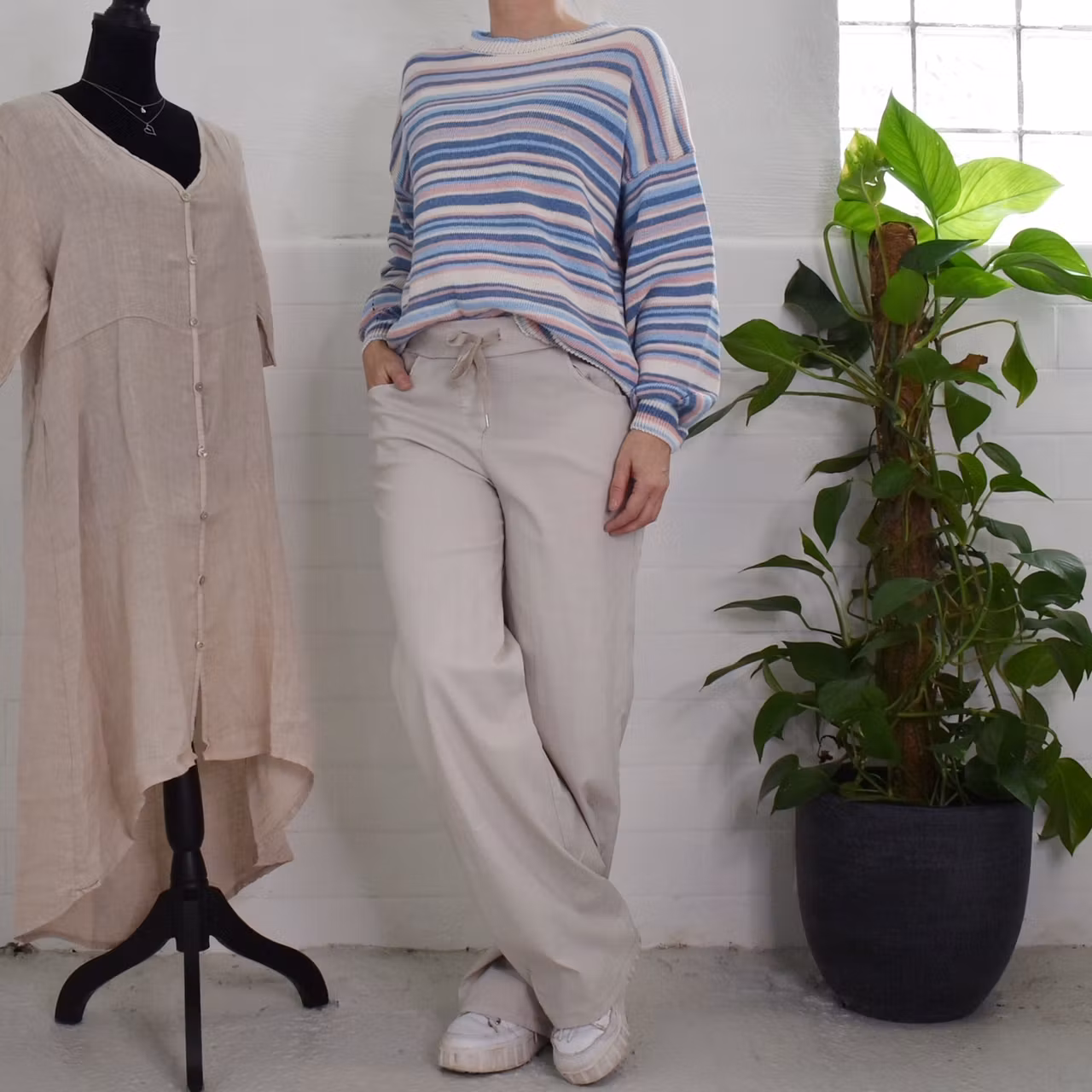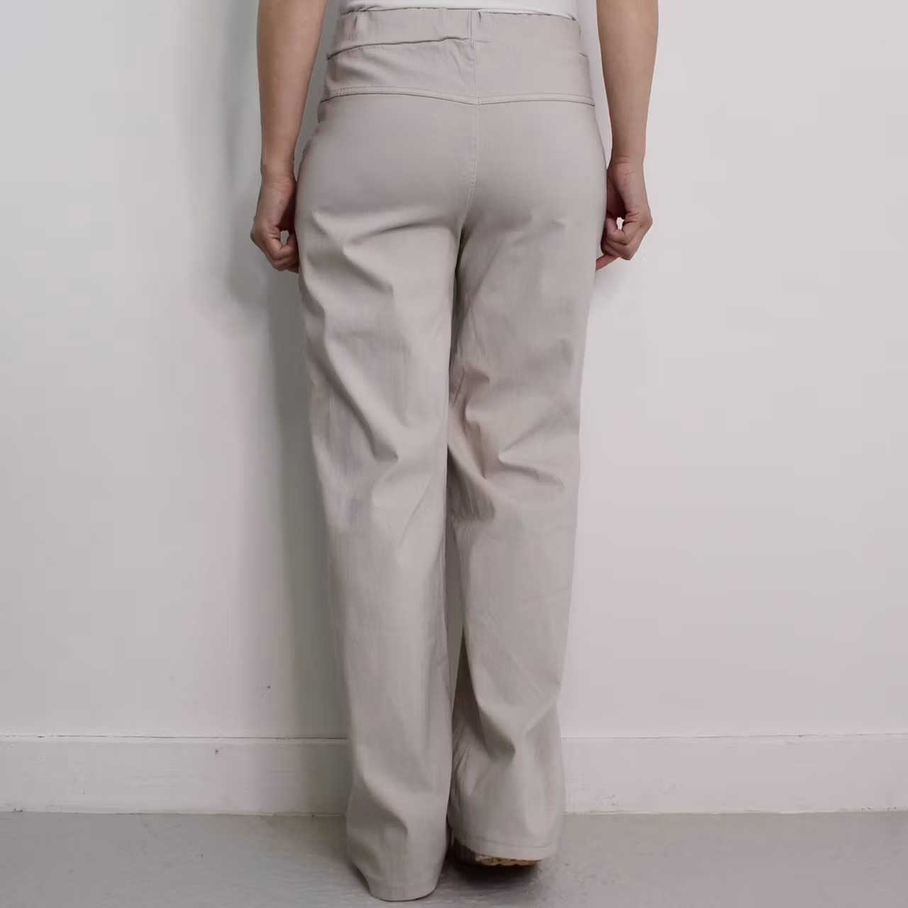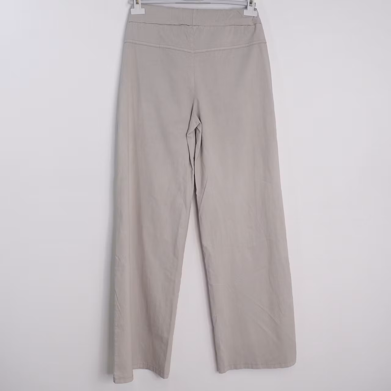 Det här är en skön vid byxa med långa, raka ben. Byxan har stretchig resår, knytband i midjan samt fejkgylf fram. Observera att dessa har extra långa benmått. Modellen har ett midjemått på cirka 79cm, en stussvidd på cirka 99cm, är 163cm lång och bär S/M.