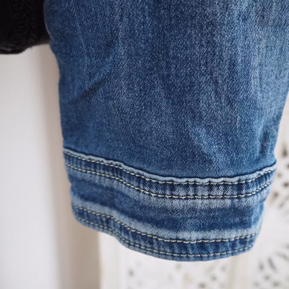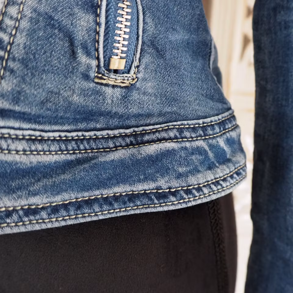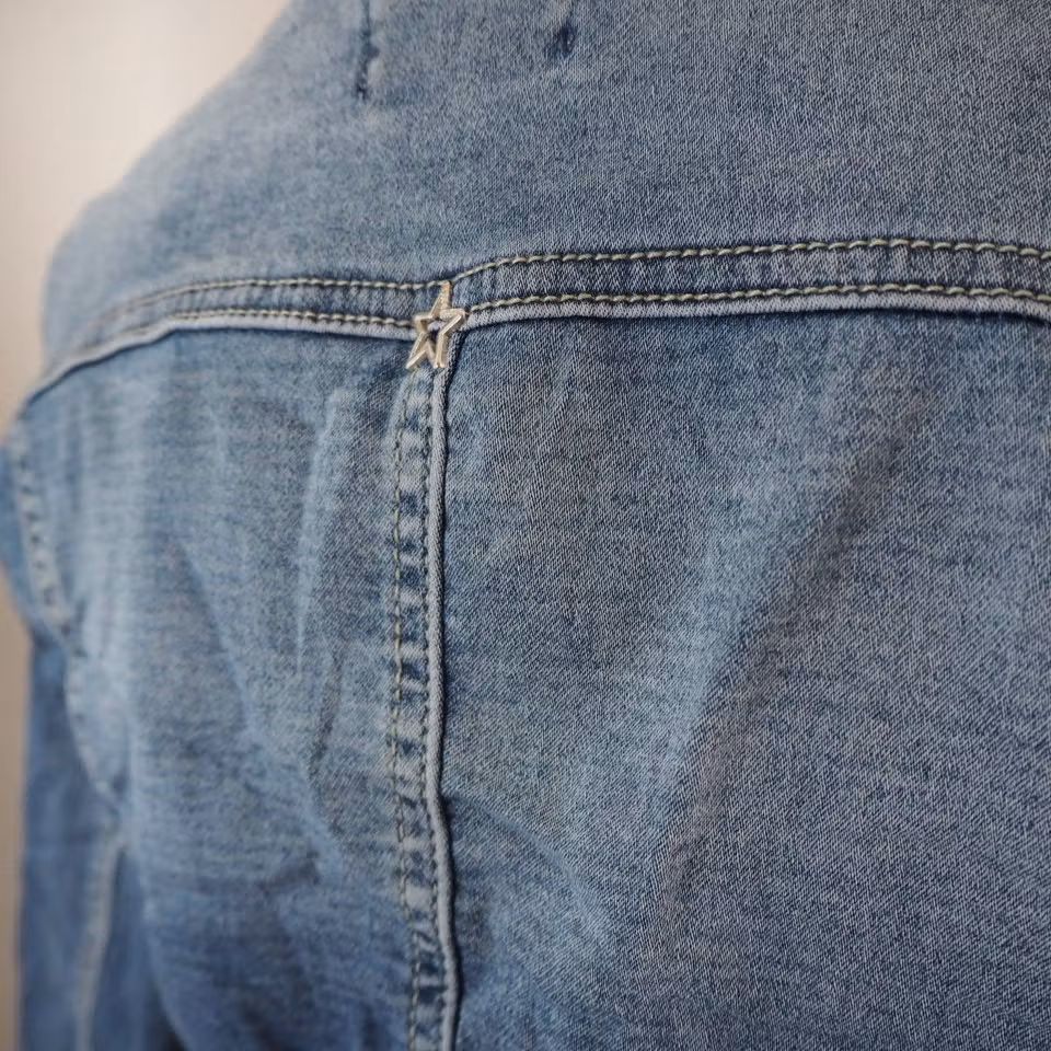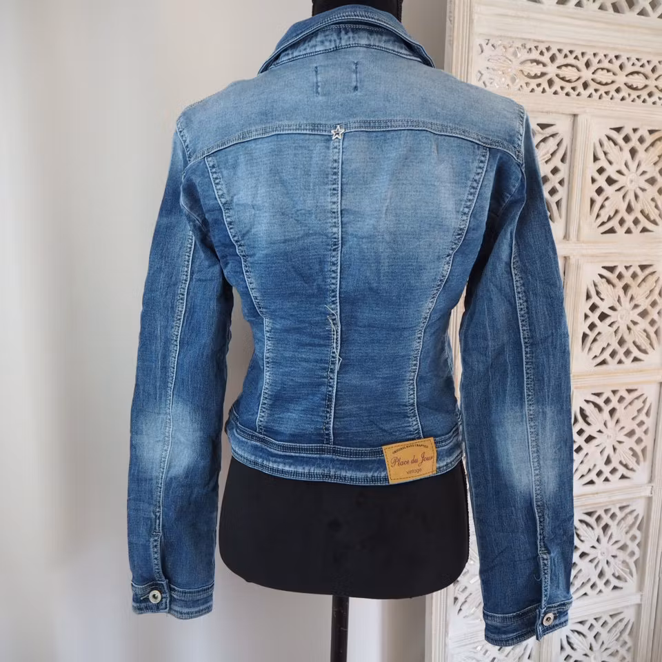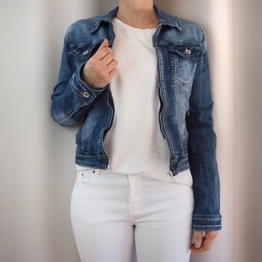 Detta är en så snygg, lite kortare jeansjacka med läcker slitning. Jackan stängs med dragkedja och är lätt figursydd. Nertill är den något mindre än över brösten. Det finns två fickor med knappar på bröstet och det är även knapp i ärmslutet. Fickorna på sidan har dragkedja. Materialet är otroligt skönt då det är mjukt (tunnare än kraftigt denim-tyg) och innehåller en hel del stretch. Då det är individuellt hur man upplever storlekar och vi alla är olika formade rekommenderar vi att man använder måtten för att bedöma vilken storlek som kan passa. Modellen är storlek S, har en bröstvidd på 88cm, är 163cm lång och bär storlek 36. Se ungefärliga mått längre ner i beskrivningen.