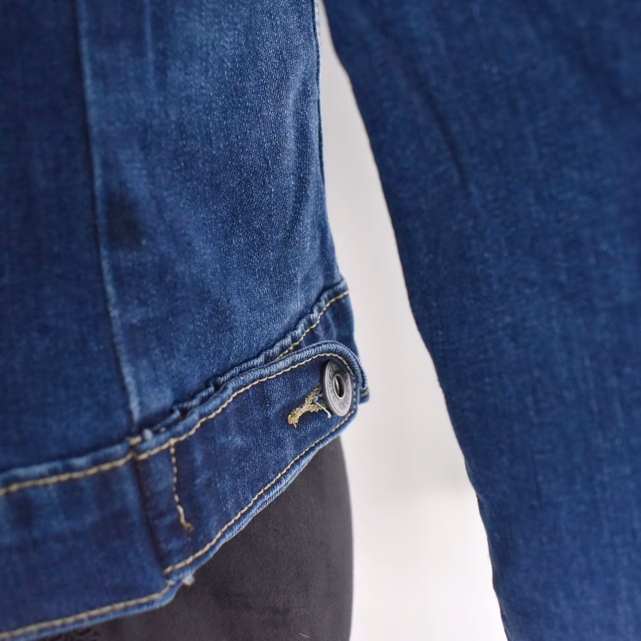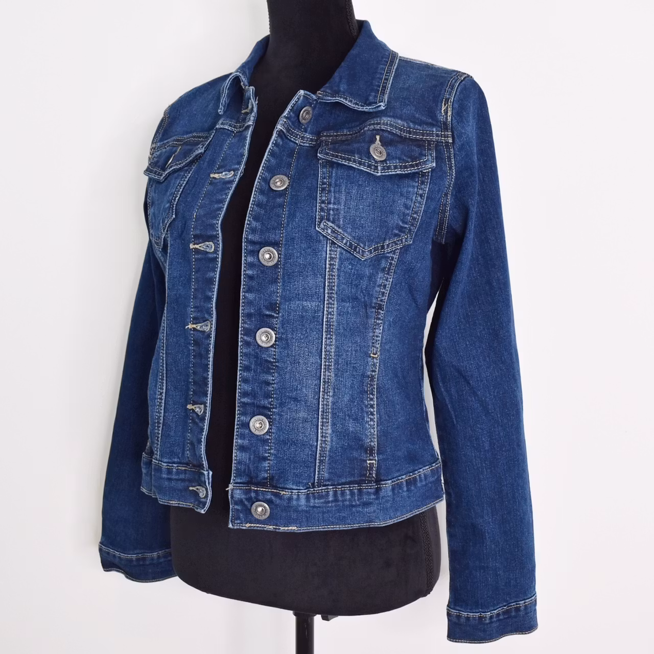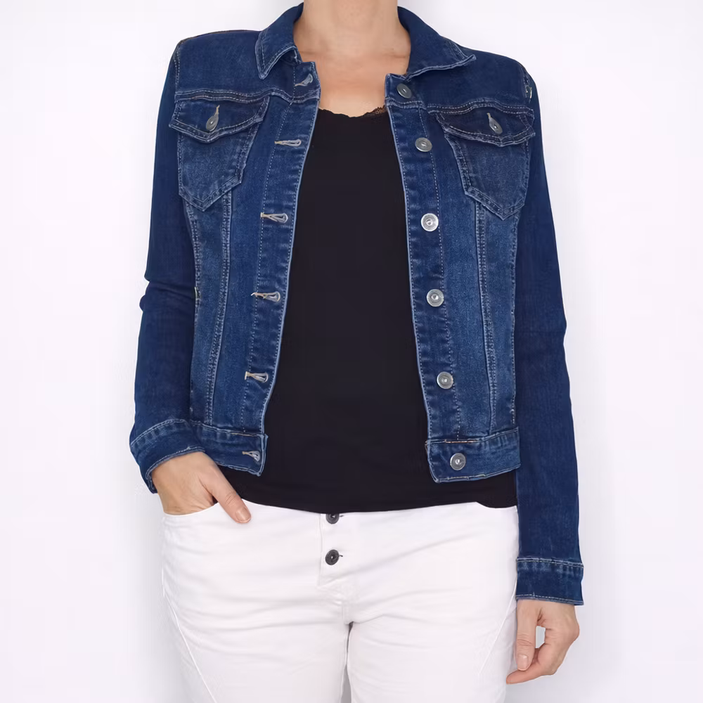 Detta är en så snygg kort jacka i rejält denimtyg. Jackan stängs med knappar och är lätt figursydd. Det finns två fickor med lock och knappar på bröstet samt fickor i sidorna. Där är en knapp i ärmslutet. Materialet innehåller stretch. Modellen har en bröstvidd på 88cm, är 163cm lång och bär storlek S (36).