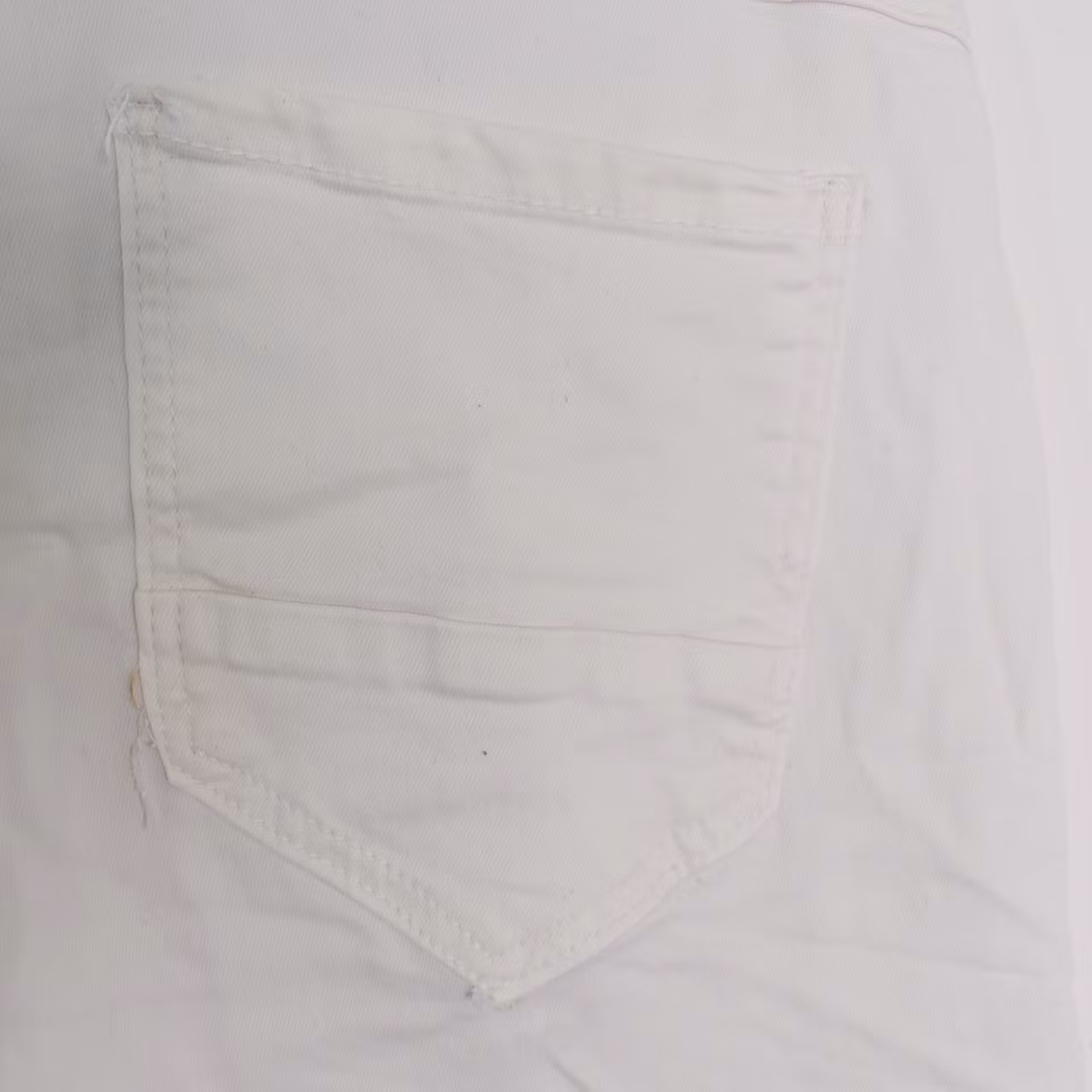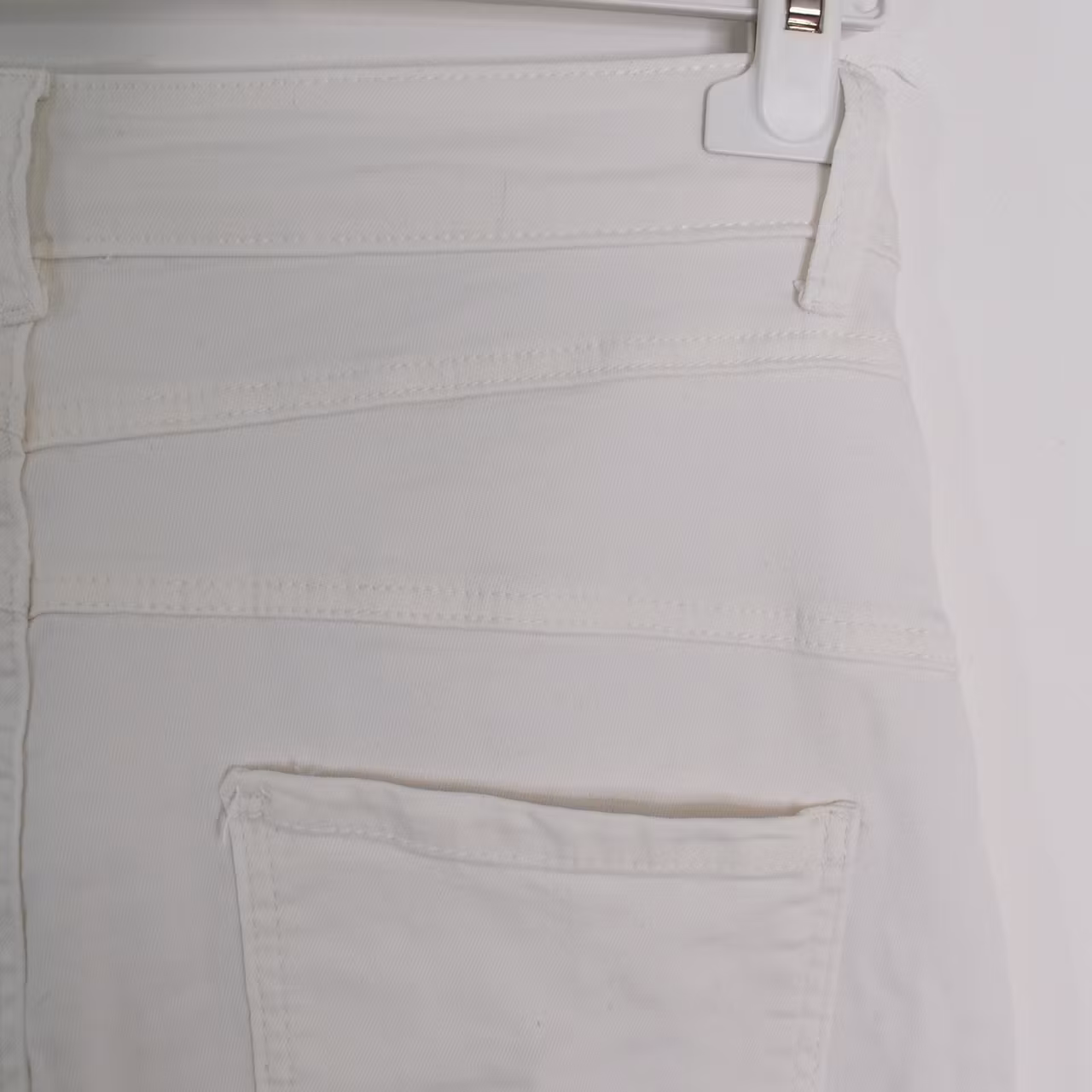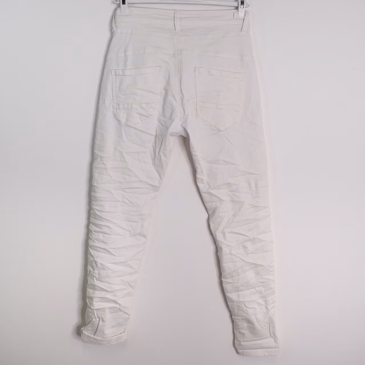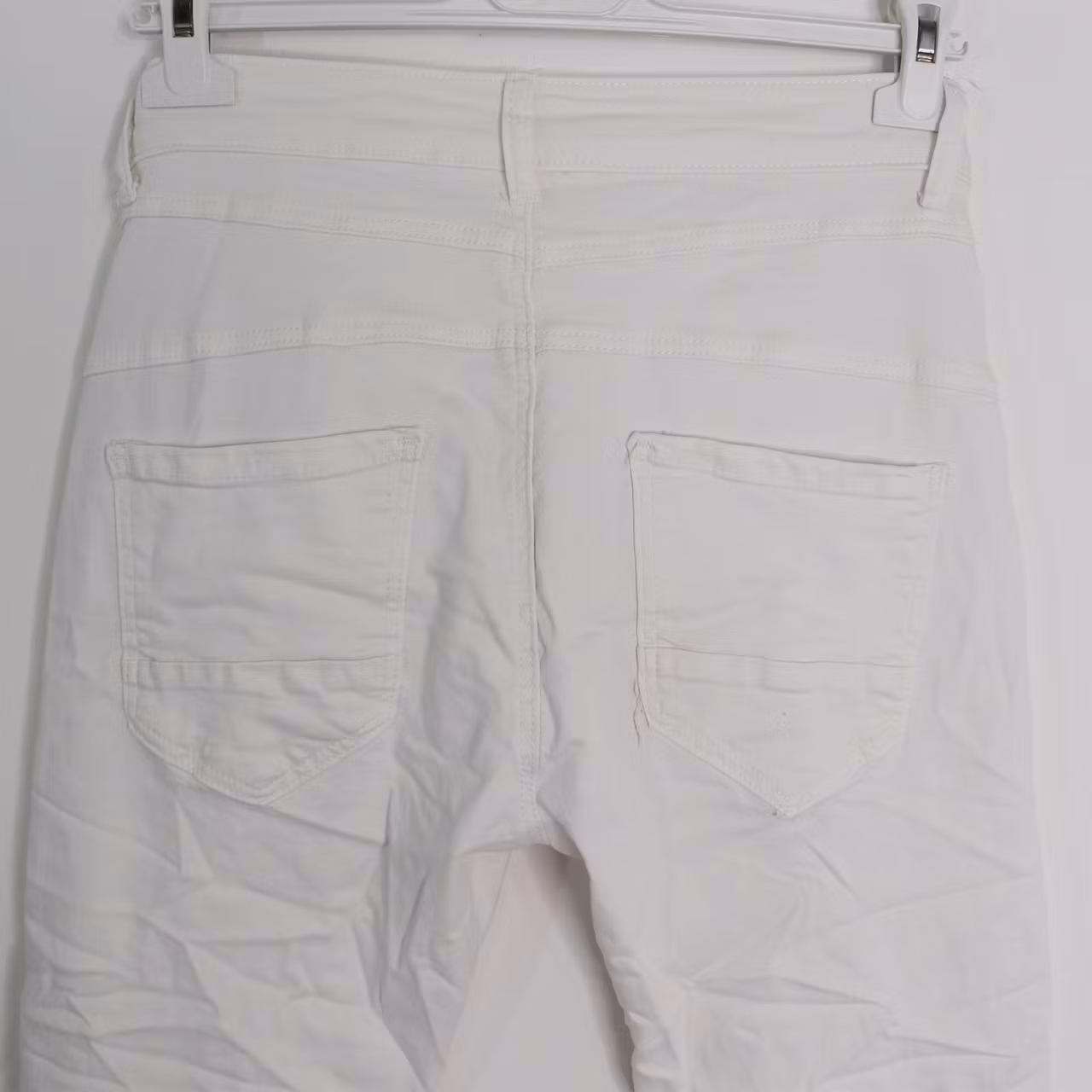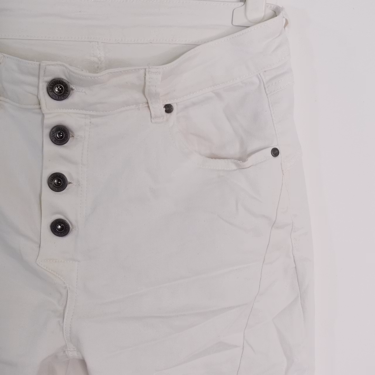 Det här är snygga jeans i mjukt och skönt, ganska tunt denimtyg. Jeansen är i femficks-modell (låga fickor bak) och stängs med fyra knappar. Det går en dekorativ sned söm en bit ner mot låret framtill. Bensömmarna är och ska vara något snedsydda. I midjan finns öglor för skärp. Materialet innehåller stretch. Modellen har en midjevidd på cirka 78cm, en stuss på cirka 99cm, är 163cm lång, och bär storlek S (36).