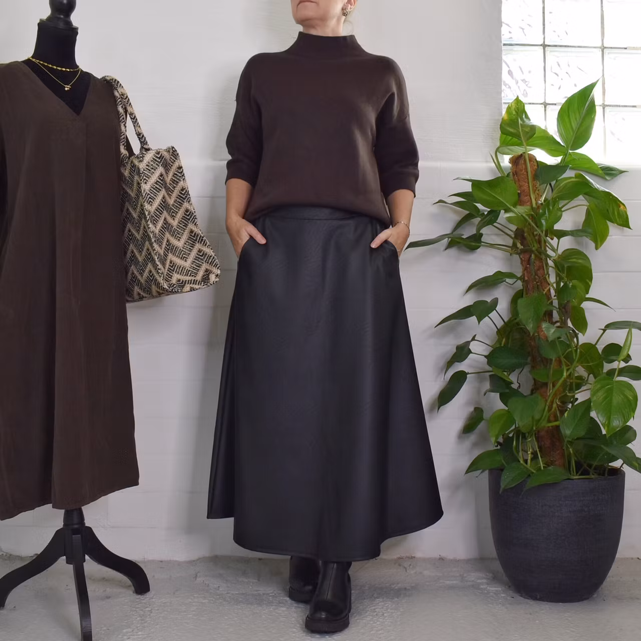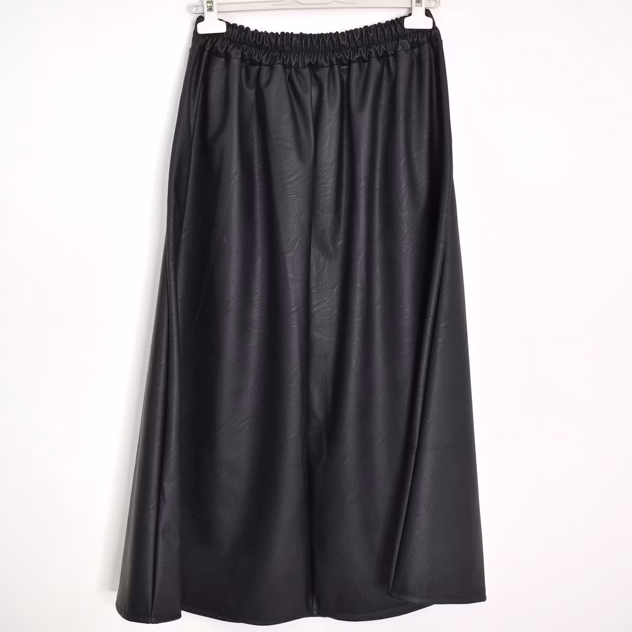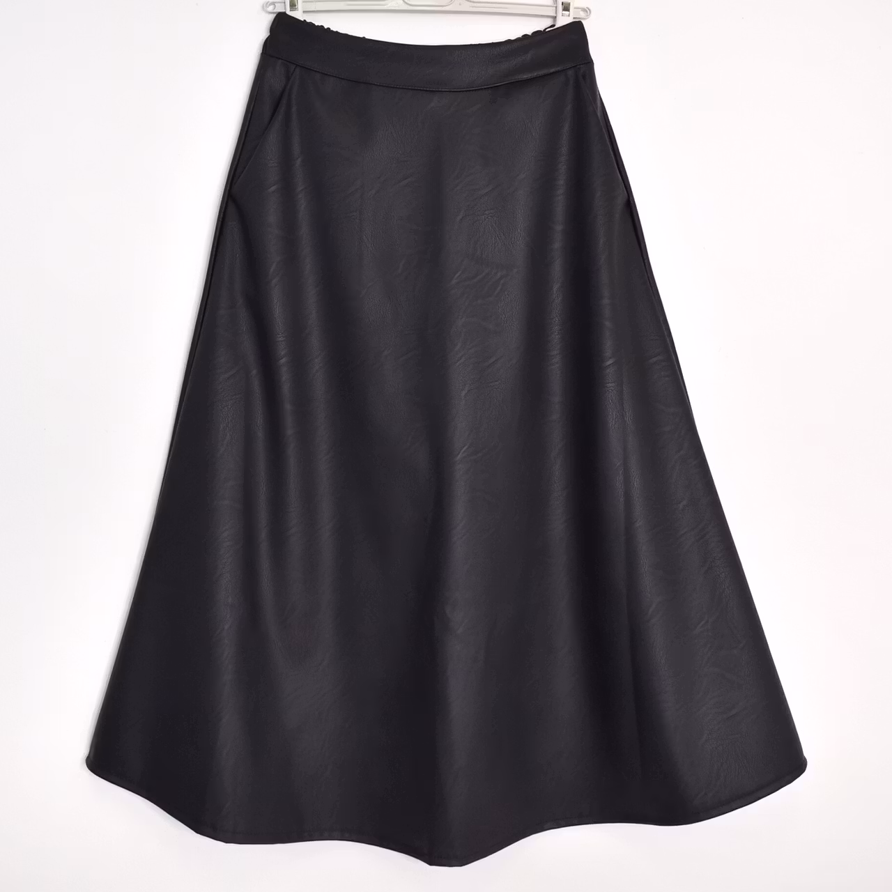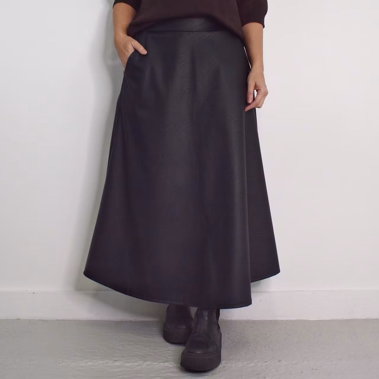 Det här är en läcker lång kjol i halvmatt konstskinn med svagt mönster (se detaljbilderna). Kjolen är klockformad och har sneda fickor fram. Baktill i midjan är där stretchig resår med rynkat tyg under. One Size - passar uppskattningsvis upp till L (40). Modellen har en midjevidd på cirka 78cm och är 163cm lång.