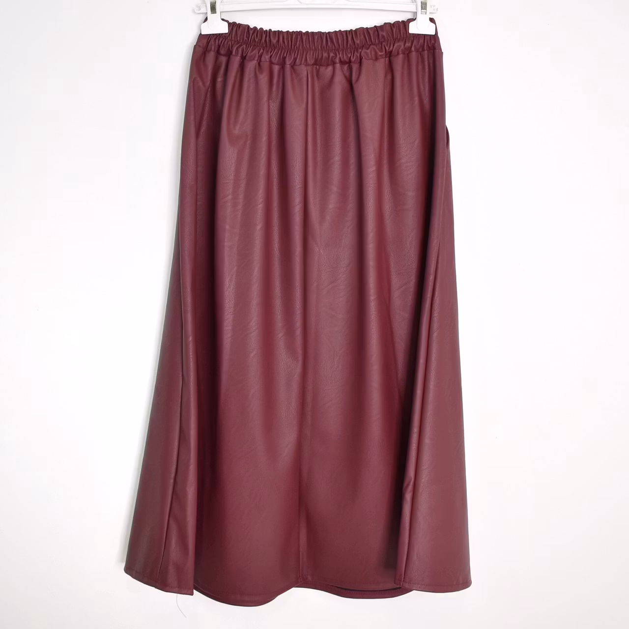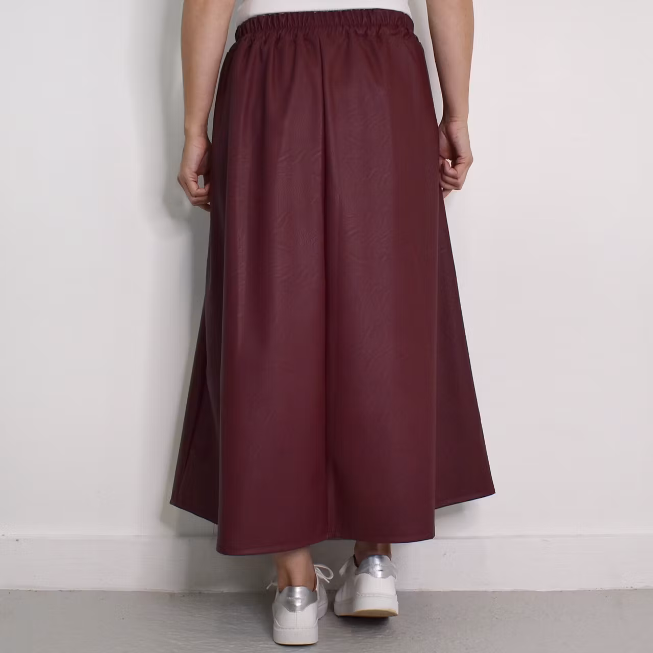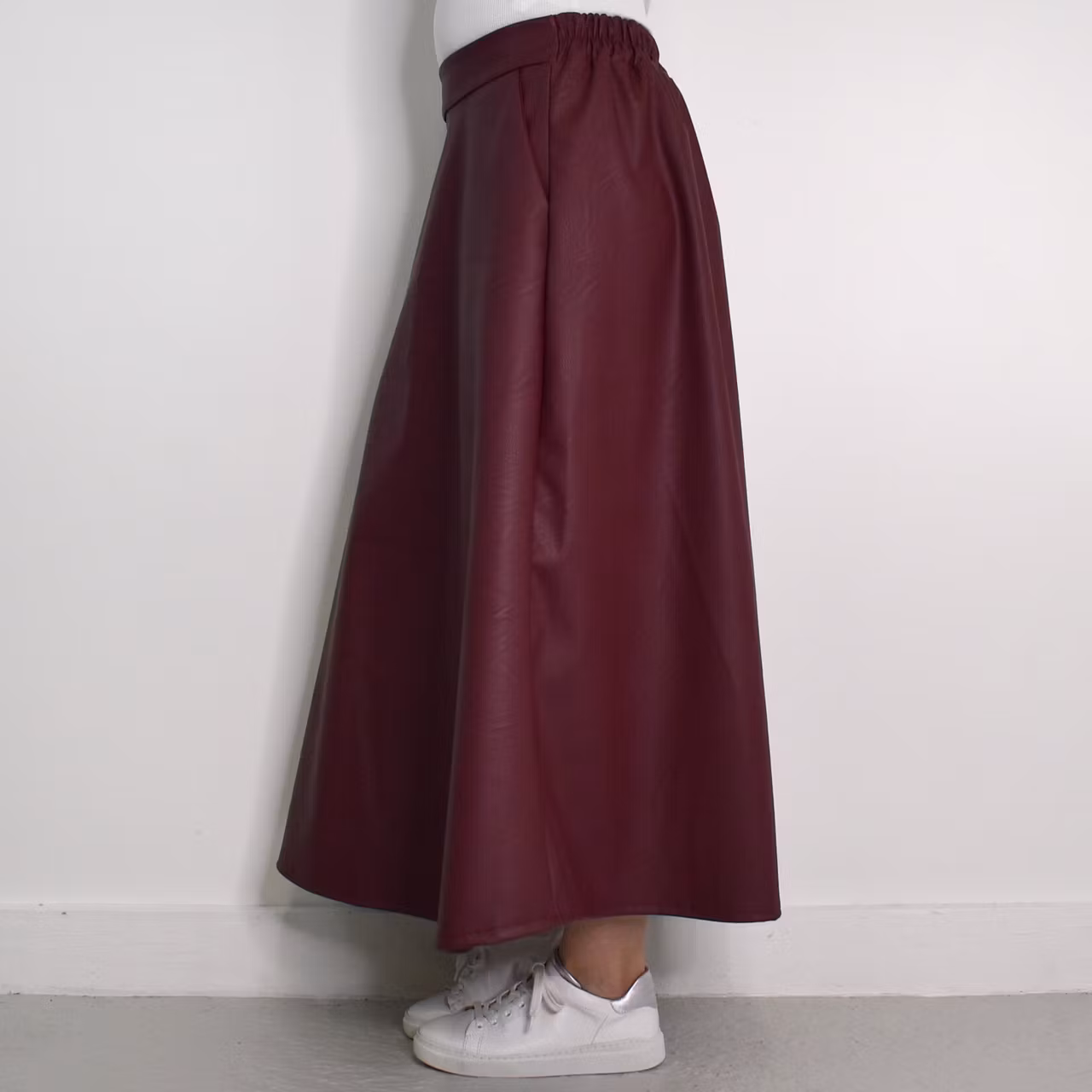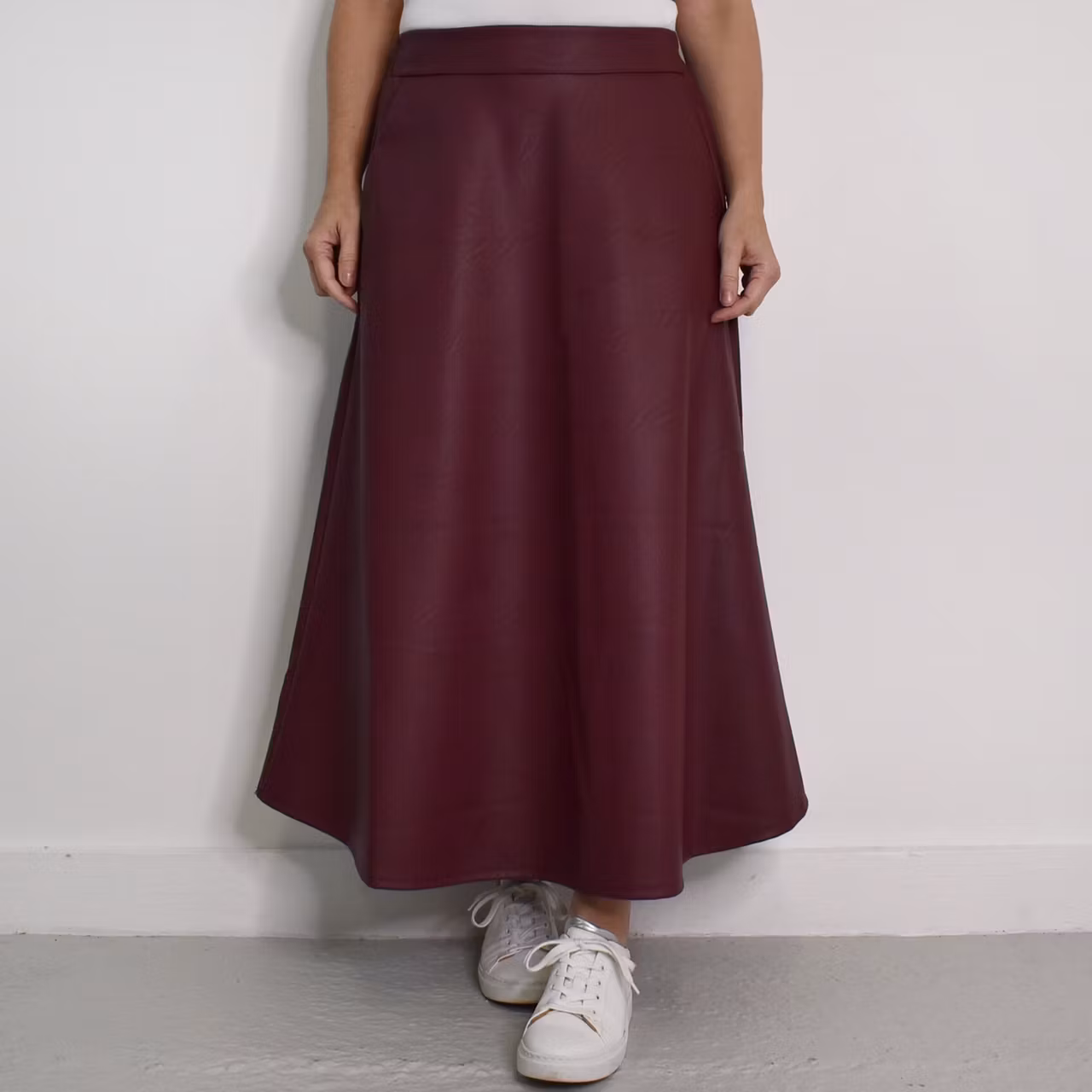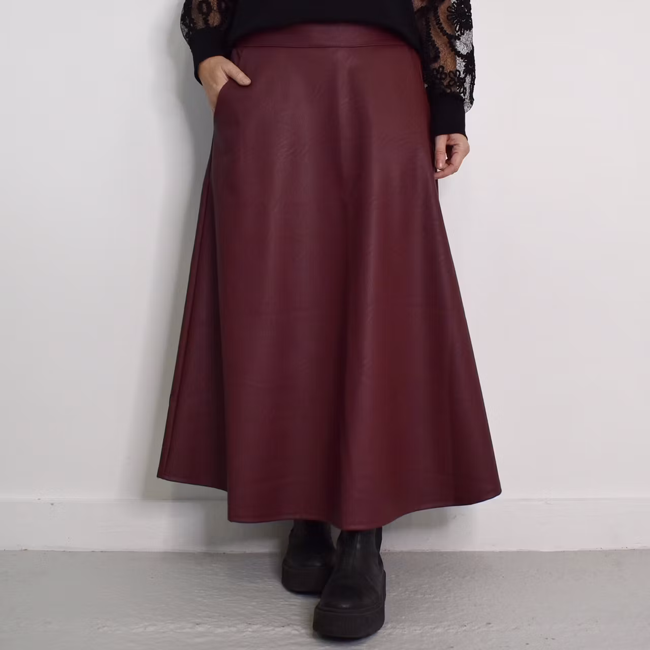 Det här är en läcker lång kjol i halvmatt konstskinn med svagt mönster (se detaljbilderna). Kjolen är klockformad och har sneda fickor fram. Baktill i midjan är där stretchig resår med rynkat tyg under. One Size - passar uppskattningsvis upp till L (40). Modellen har en midjevidd på cirka 78cm och är 163cm lång.