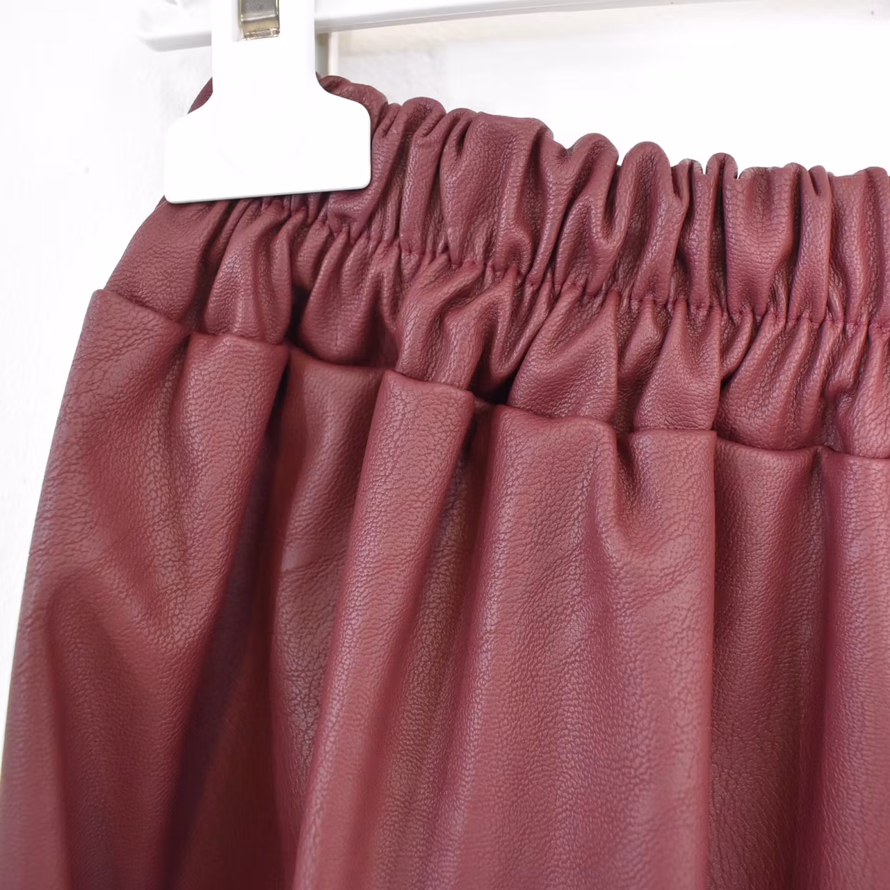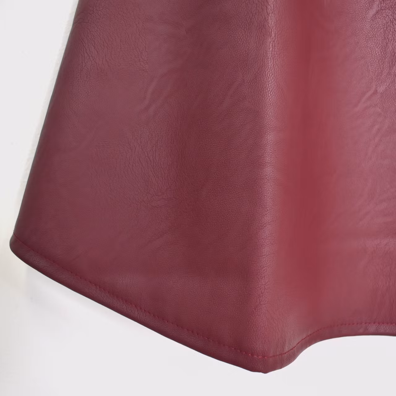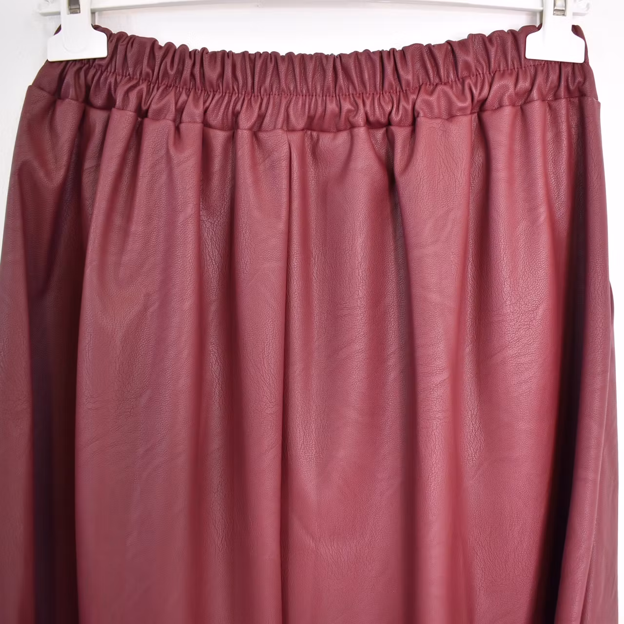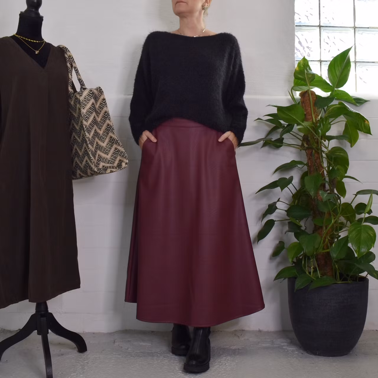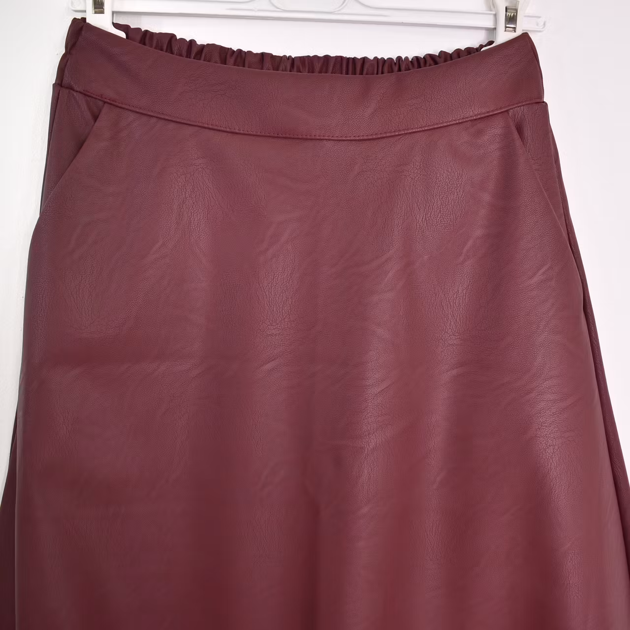 Det här är en läcker lång kjol i halvmatt konstskinn med svagt mönster (se detaljbilderna). Kjolen är klockformad och har sneda fickor fram. Baktill i midjan är där stretchig resår med rynkat tyg under. One Size - passar uppskattningsvis upp till L (40). Modellen har en midjevidd på cirka 78cm och är 163cm lång.
