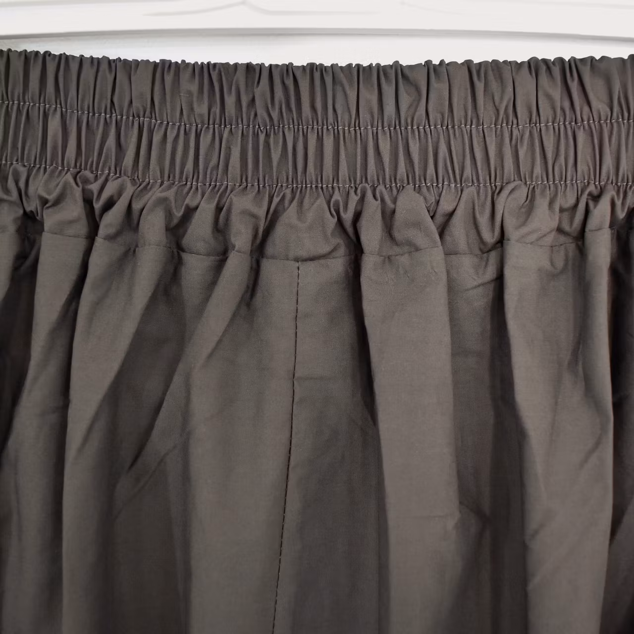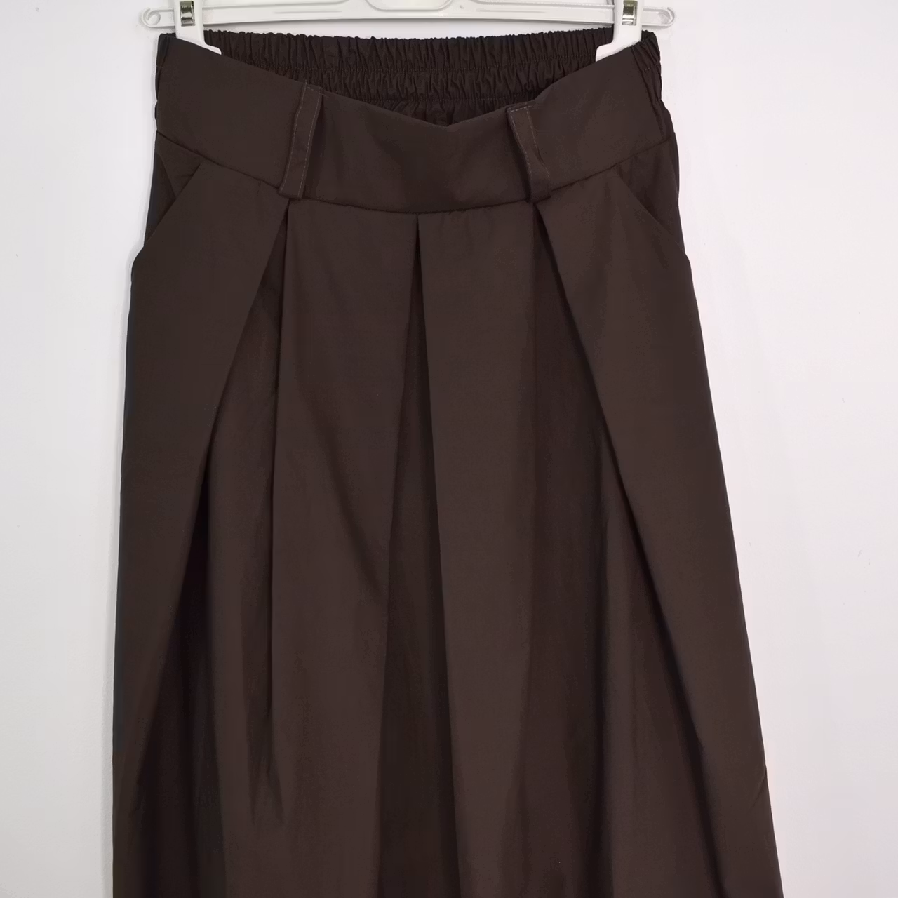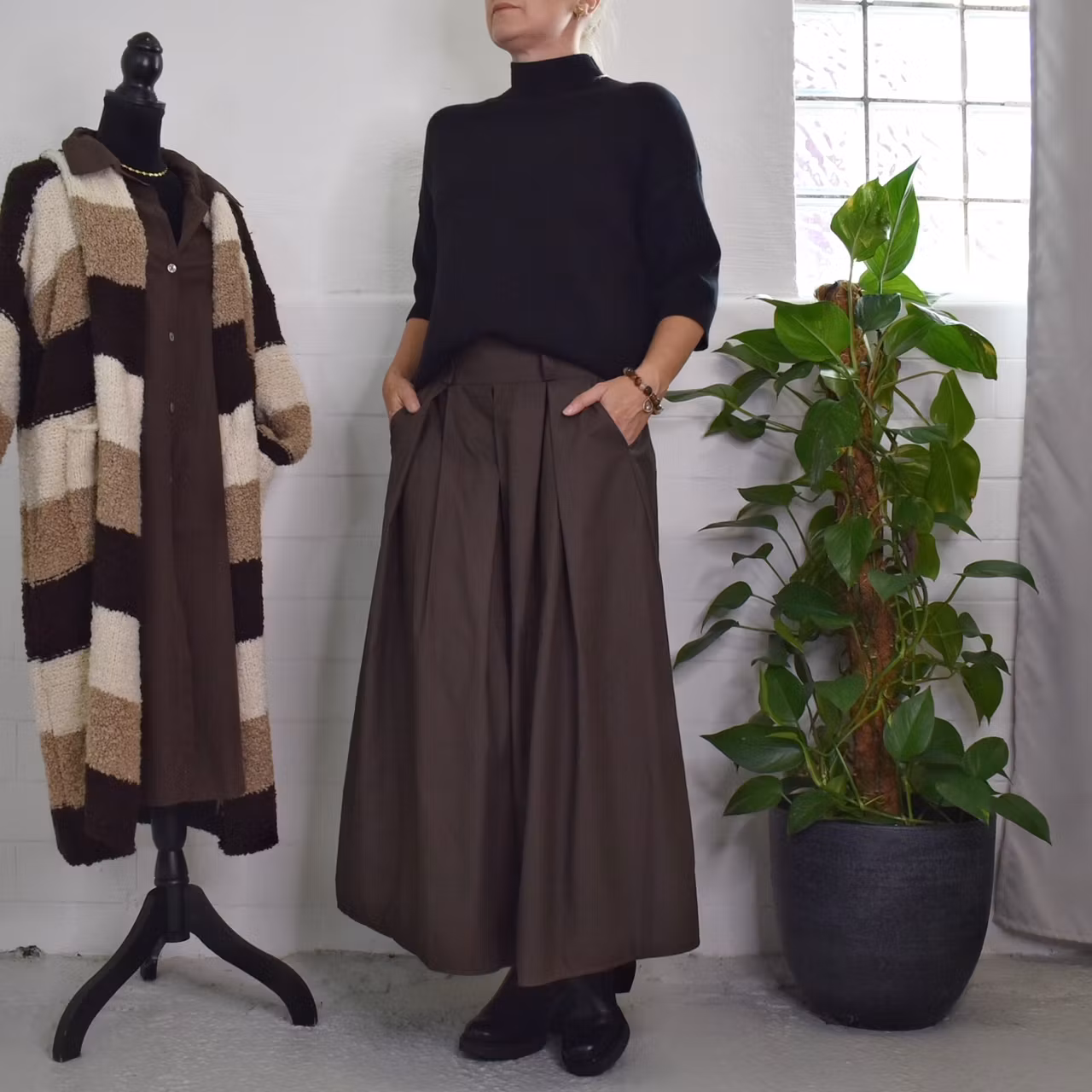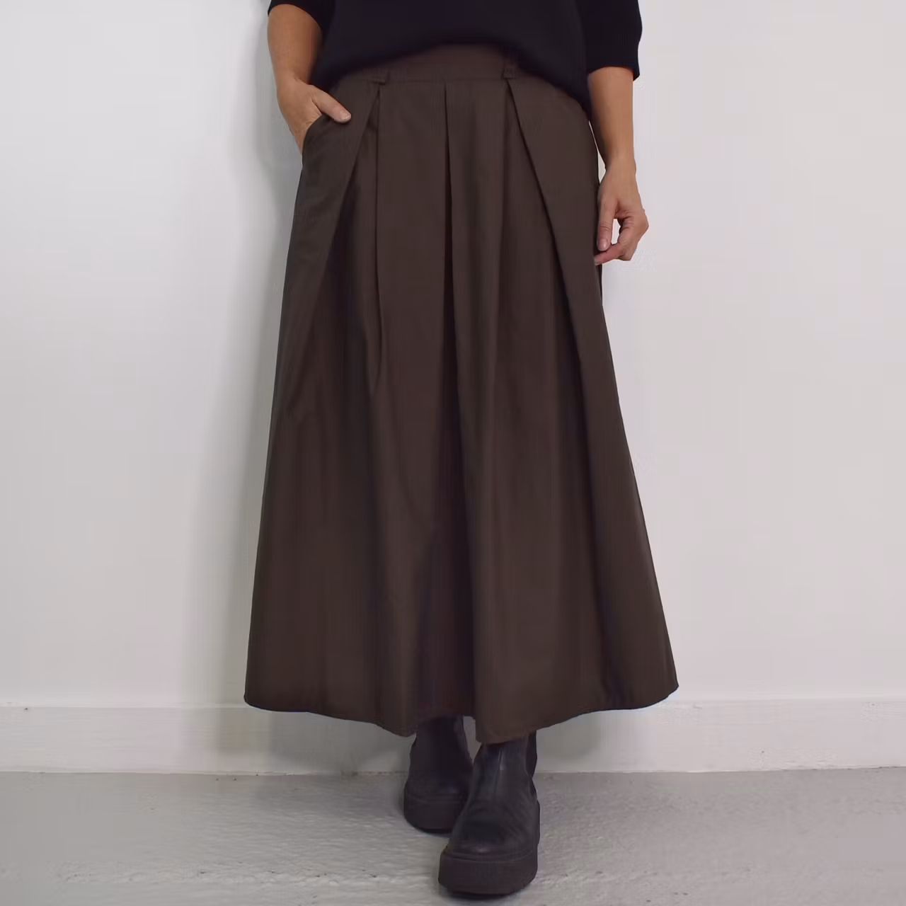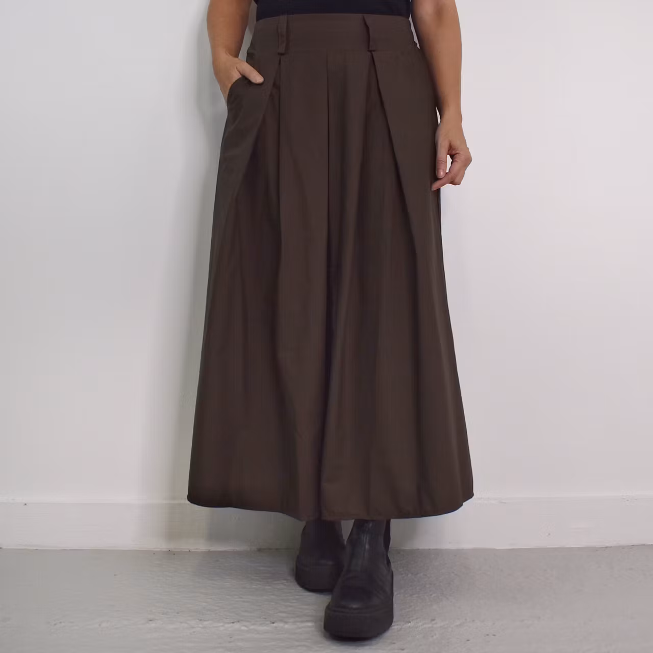 Det här är en tjusig lång kjol i härligt bomullsmaterial. Framtill är där dekorativa veck samt hällor för skärp i midjan. Baktill finns en stretchig resår med rynkat tyg under. I sidorna är där sneda fickor.