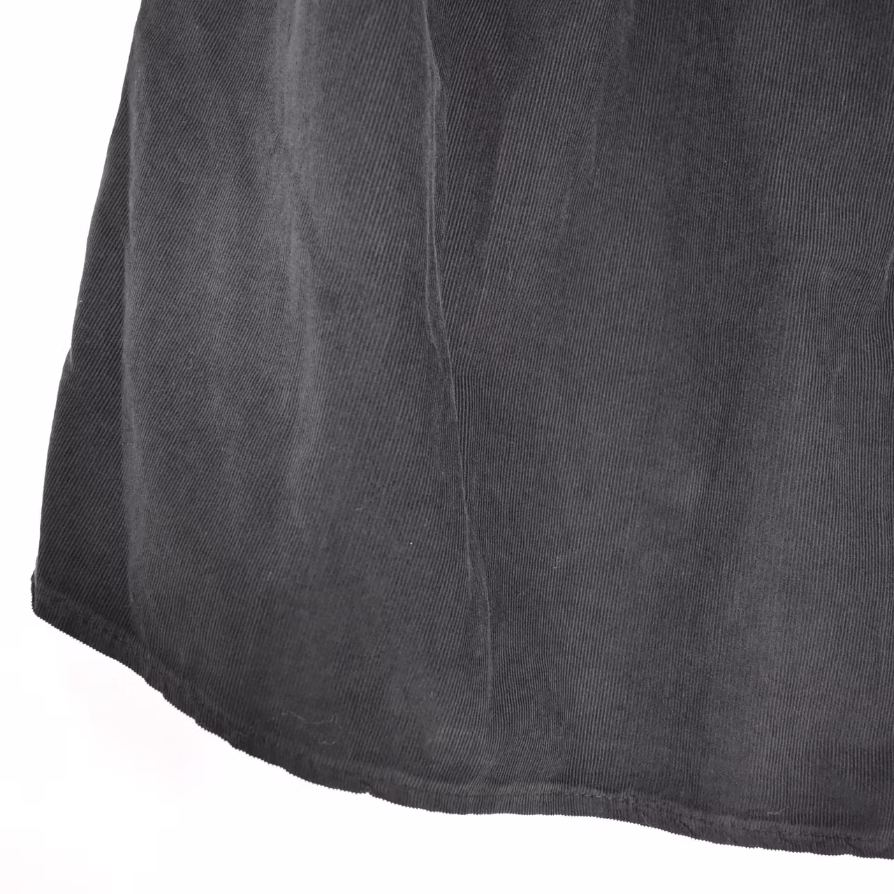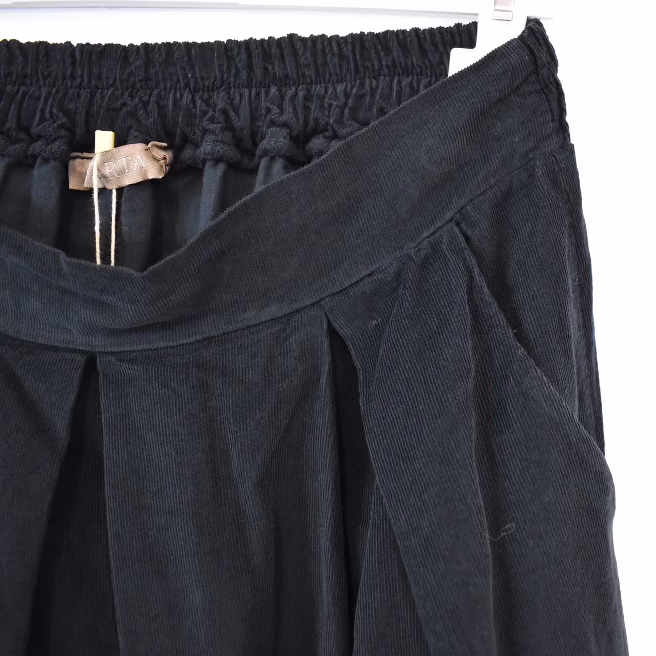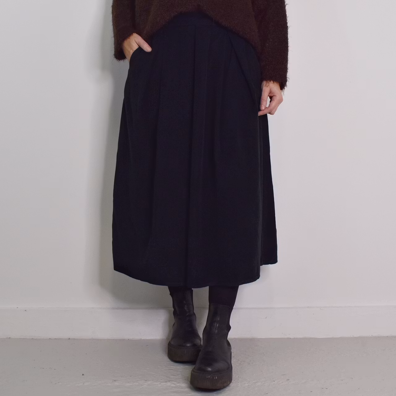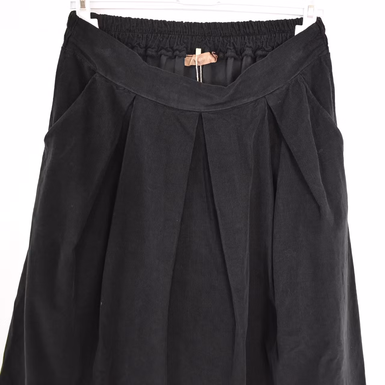 Det här är en tjusig medellång kjol i smalspårigt manchester-tyg. Baktill i midjan är där stretchig resår med rynkat tyg under, och framtill finns dekorativa veck. I sidorna är där gömda fickor. Observera att tyget inte innehåller stretch.
