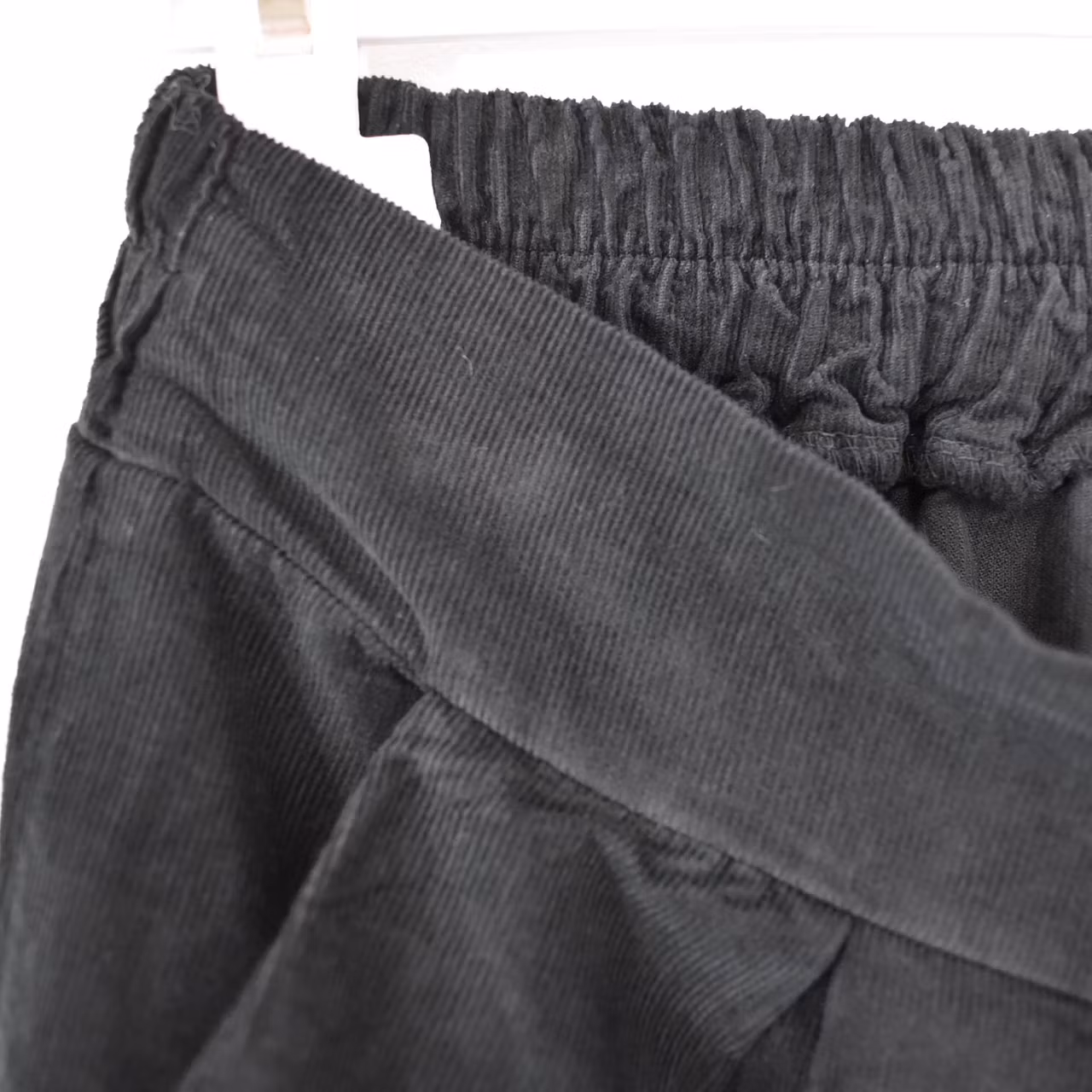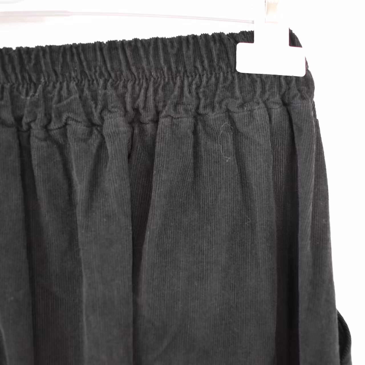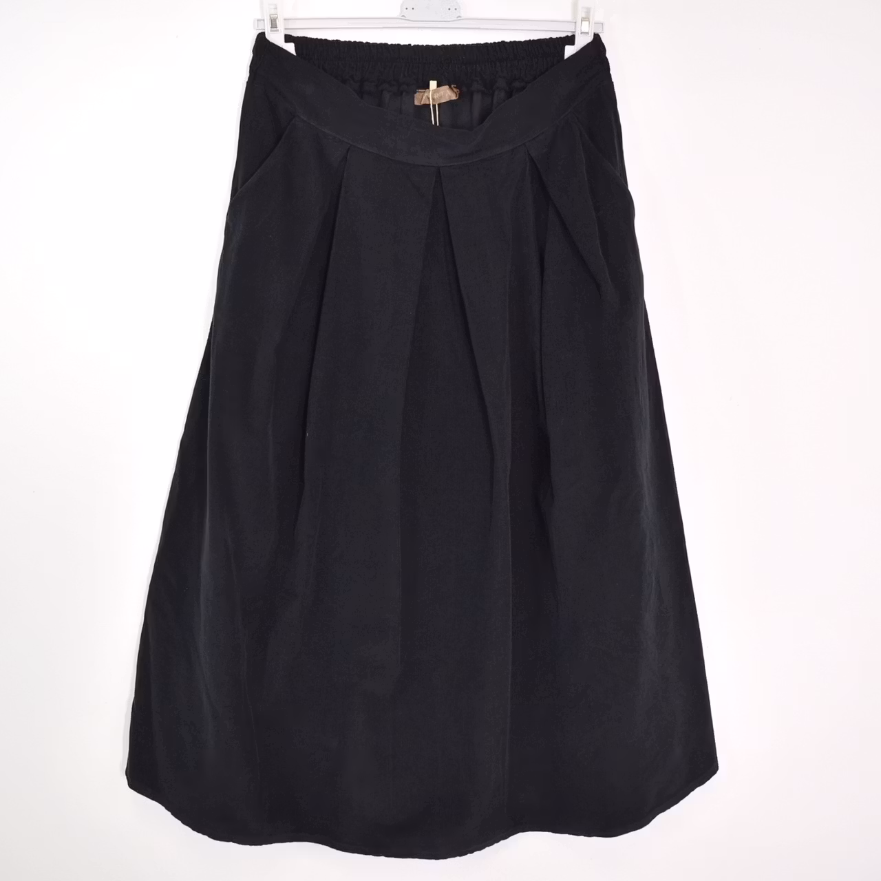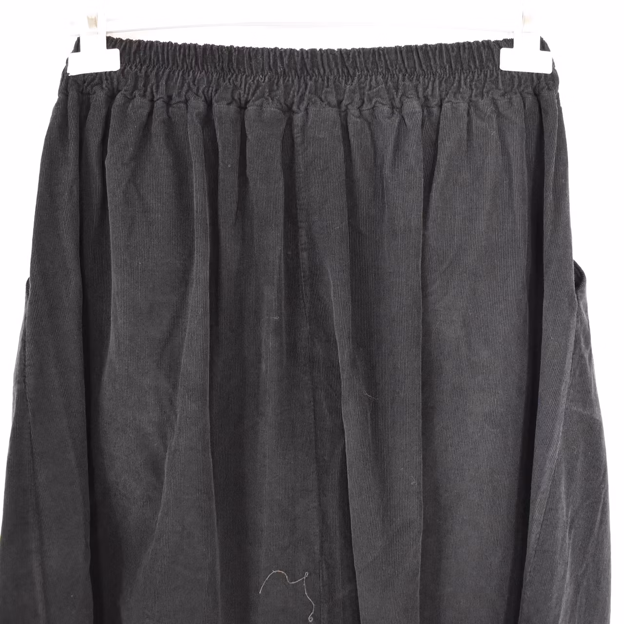 Det här är en tjusig medellång kjol i smalspårigt manchester-tyg. Baktill i midjan är där stretchig resår med rynkat tyg under, och framtill finns dekorativa veck. I sidorna är där gömda fickor. Observera att tyget inte innehåller stretch.