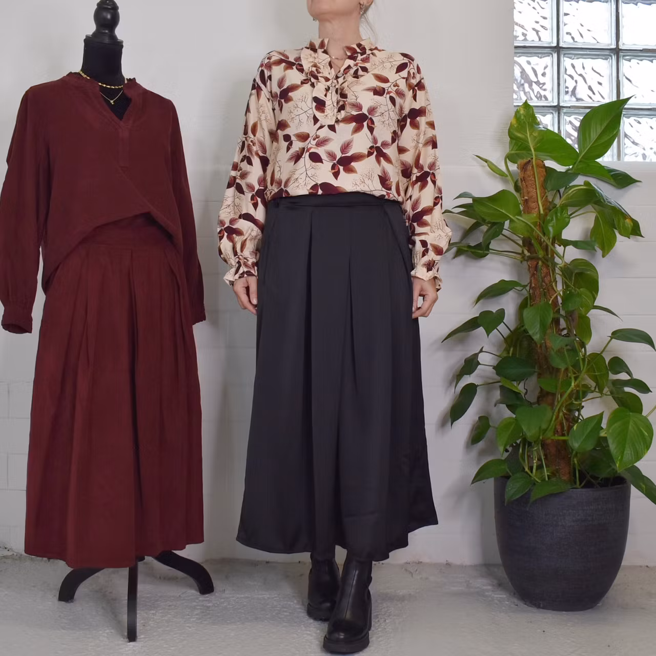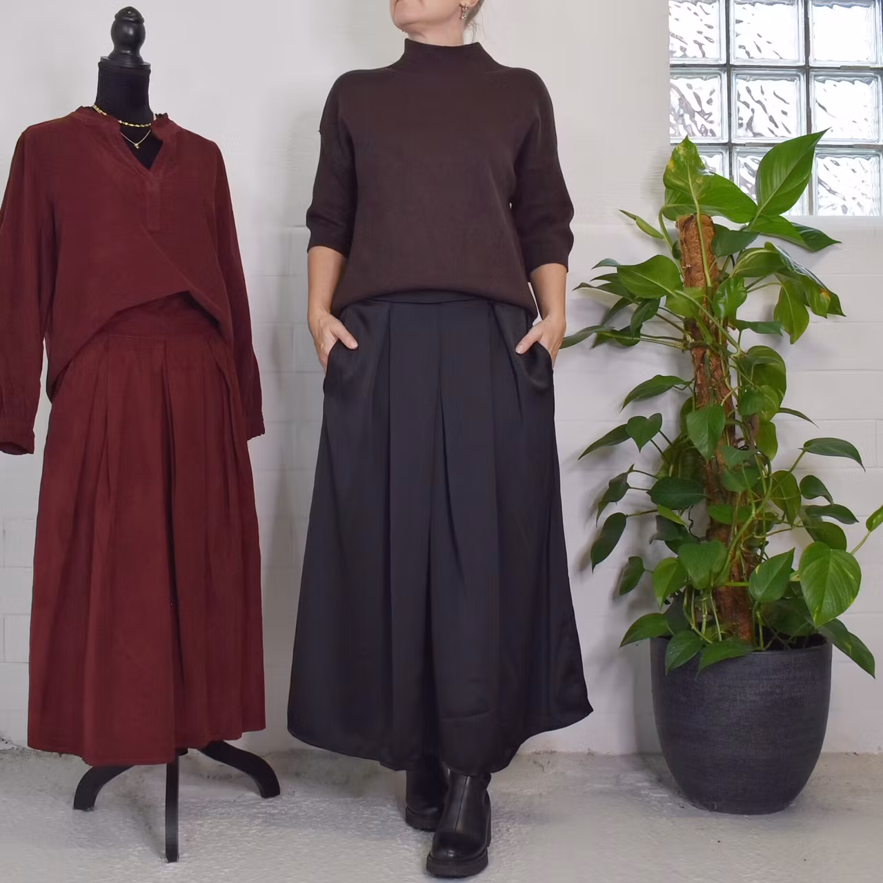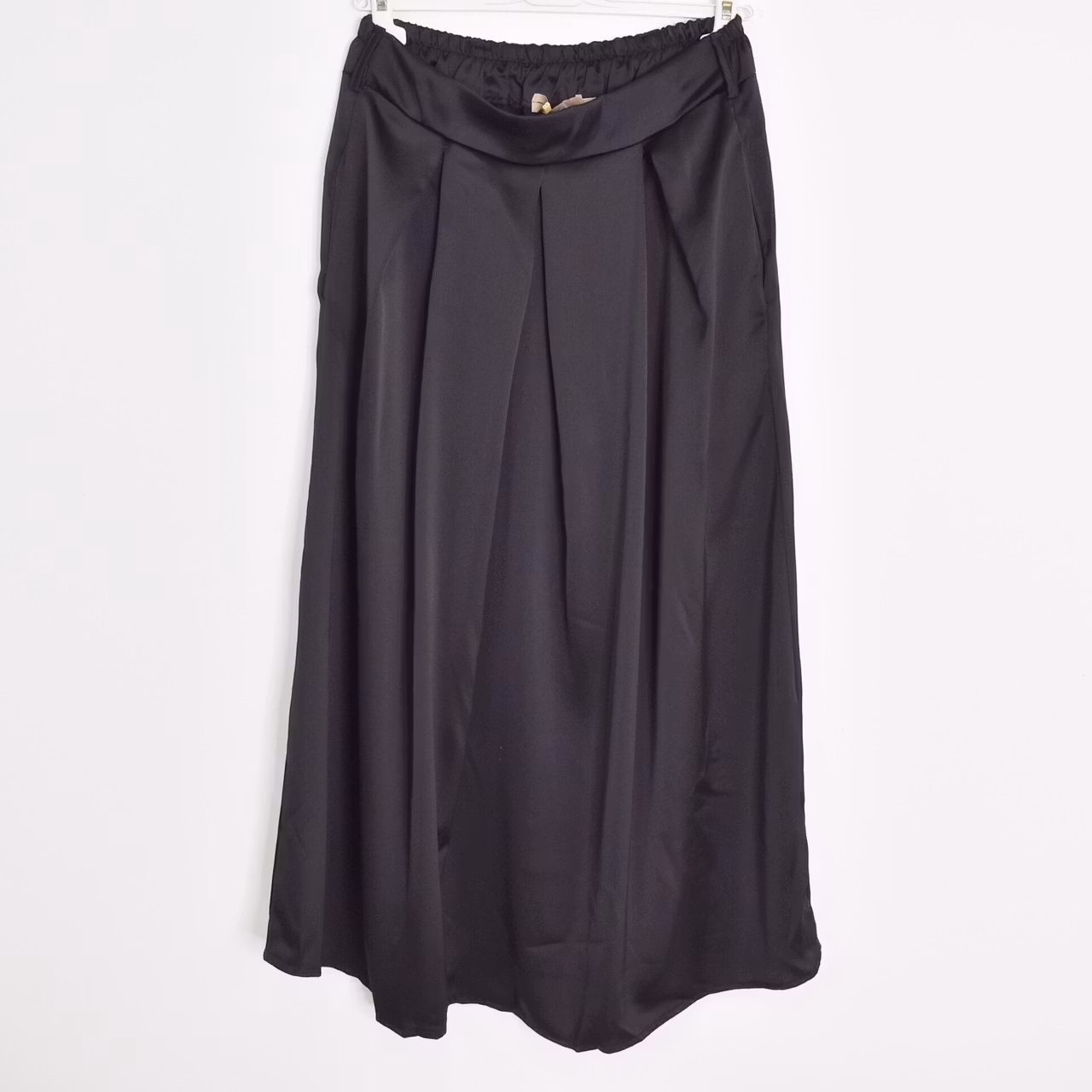 Det här är en tjusig medellång kjol i glansigt material. Baktill i midjan är där stretchig resår med rynkat tyg under, och framtill dekorativa veck. Hällor skärp finns och i sidorna är där gömda fickor.