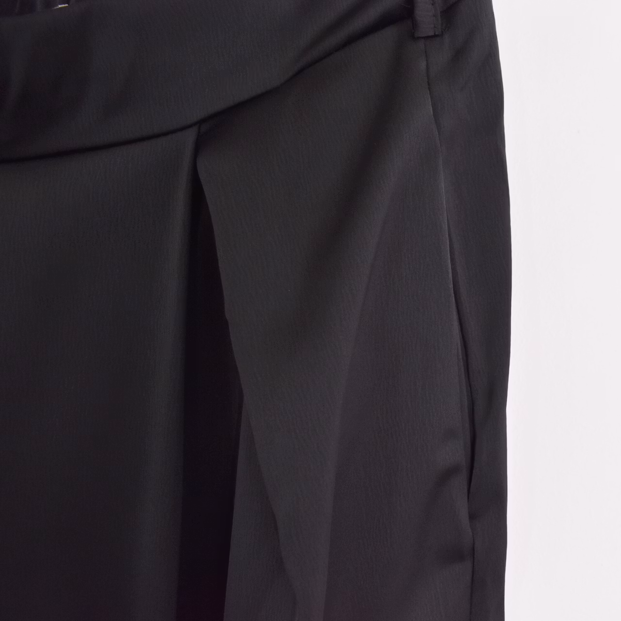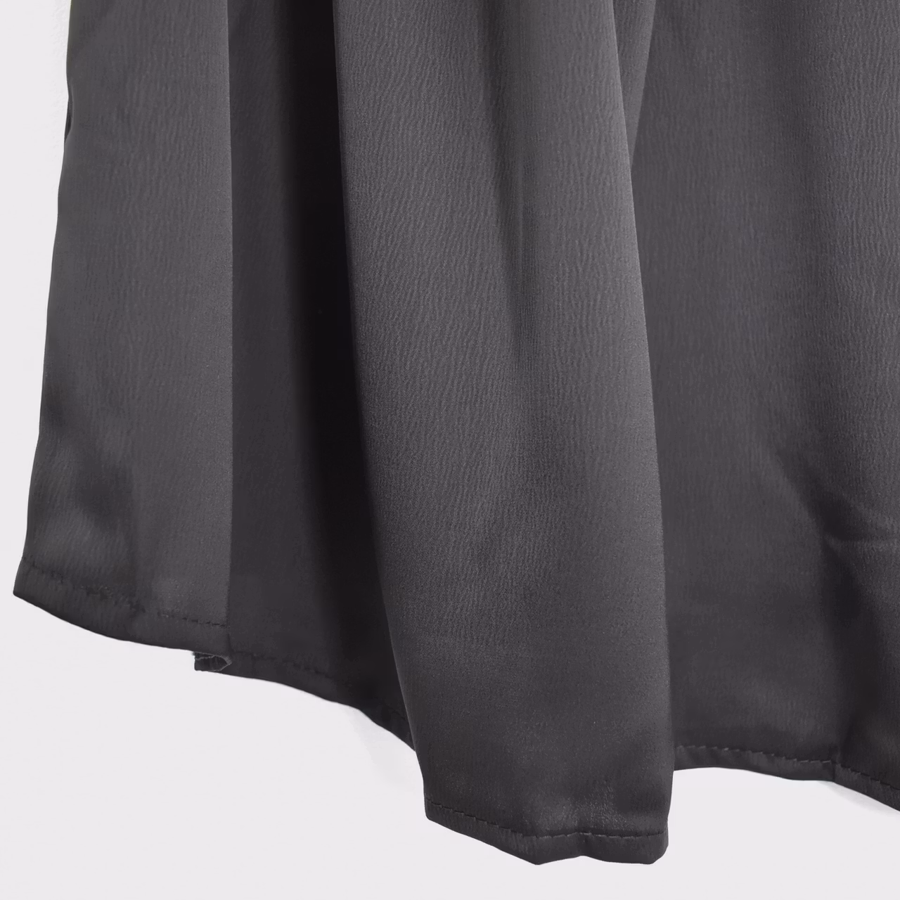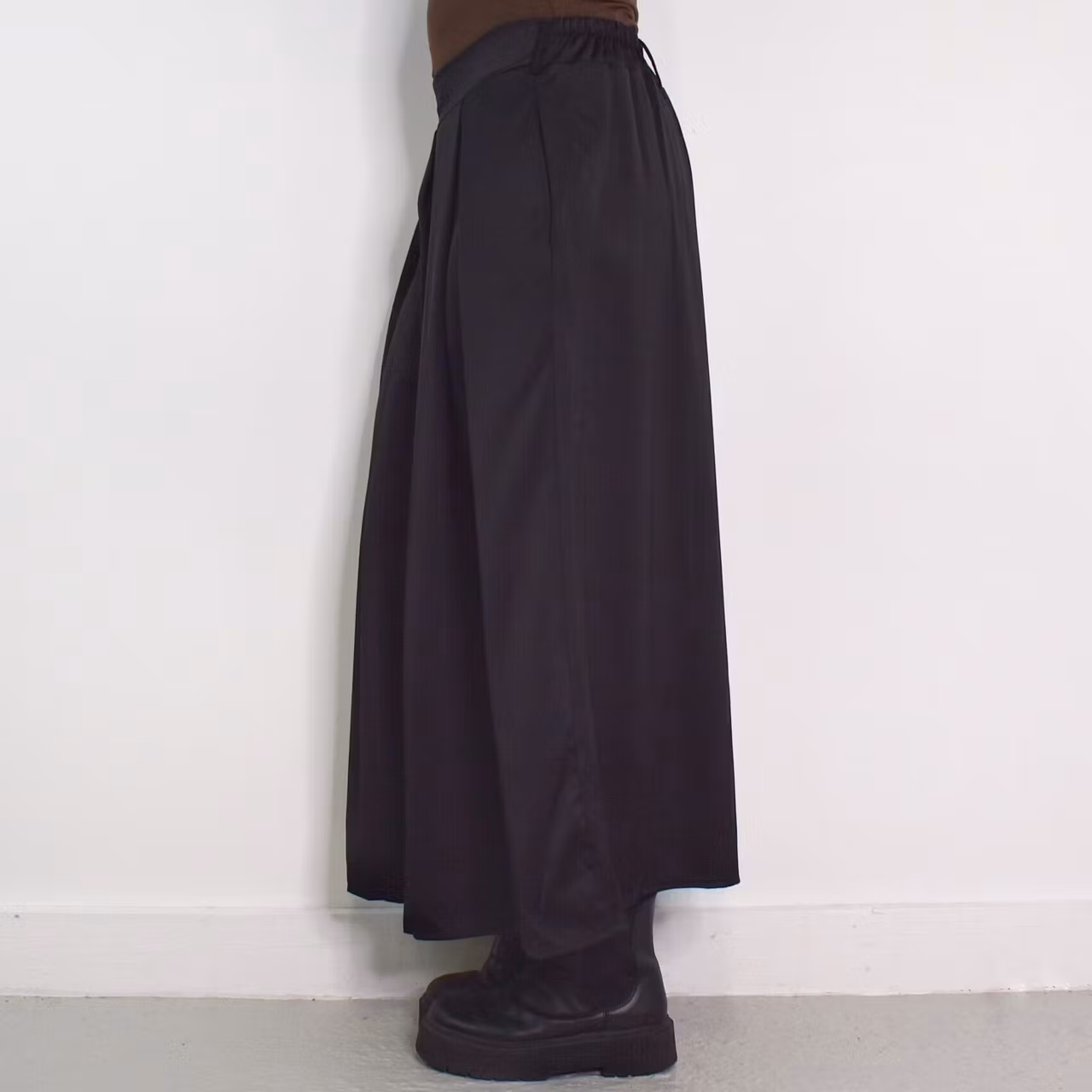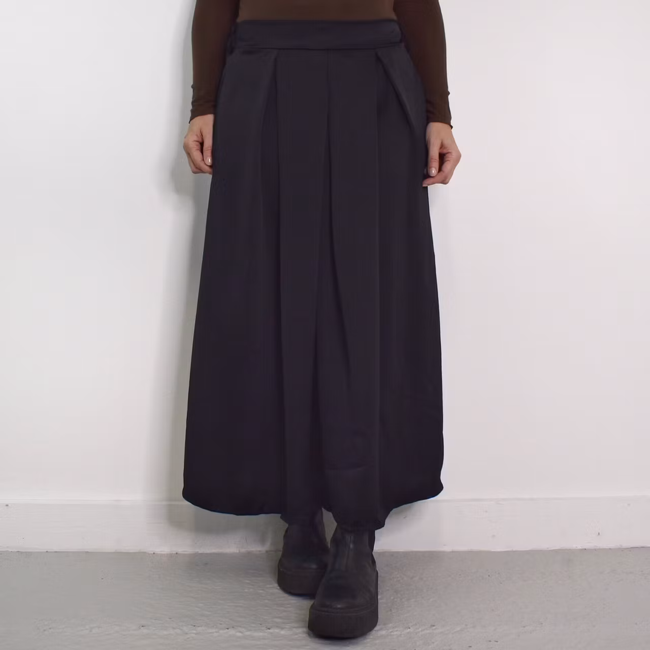 Det här är en tjusig medellång kjol i glansigt material. Baktill i midjan är där stretchig resår med rynkat tyg under, och framtill dekorativa veck. Hällor skärp finns och i sidorna är där gömda fickor.
