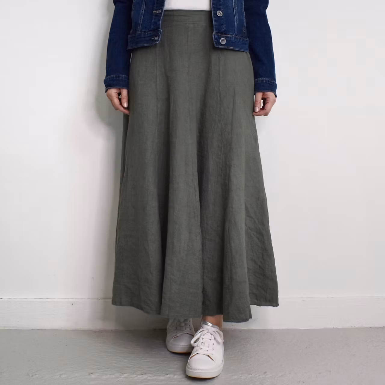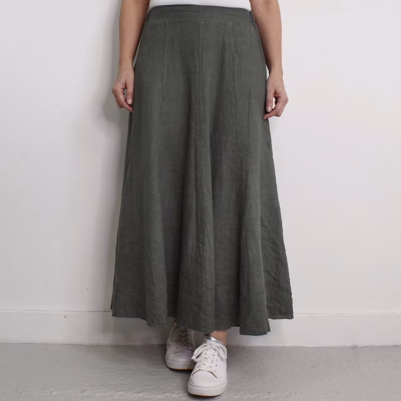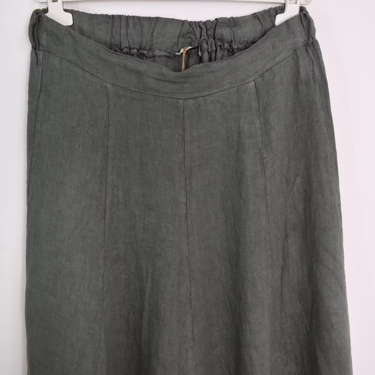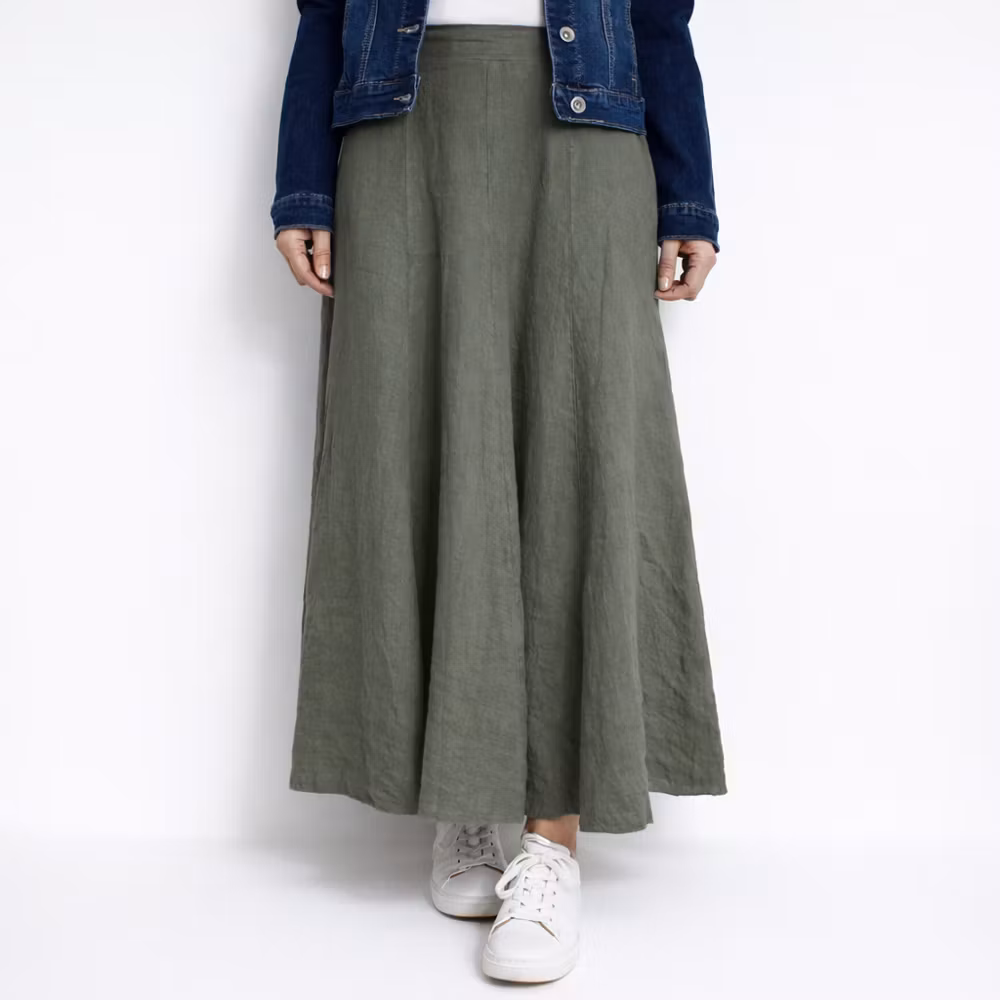 Det här är en snygg klockformad kjol i tunt vävt linnetyg. I midjan baktill är där en skön resår och kjolen har flera lodräta sömmar. Materialet innehåller inte stretch. Modellen har en midjevidd på cirka 78cm och är 163cm lång. Observera att förekomsten av streck, färgskiftningar etc. inte är defekter utan en del av det som gör tyget vackert.