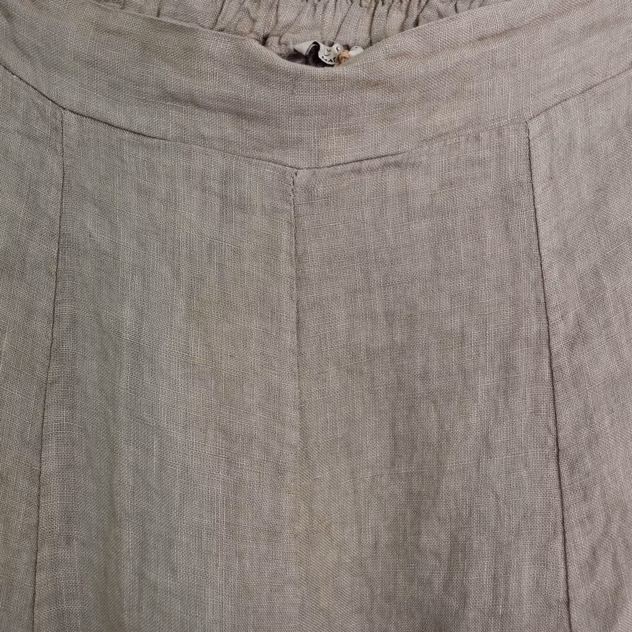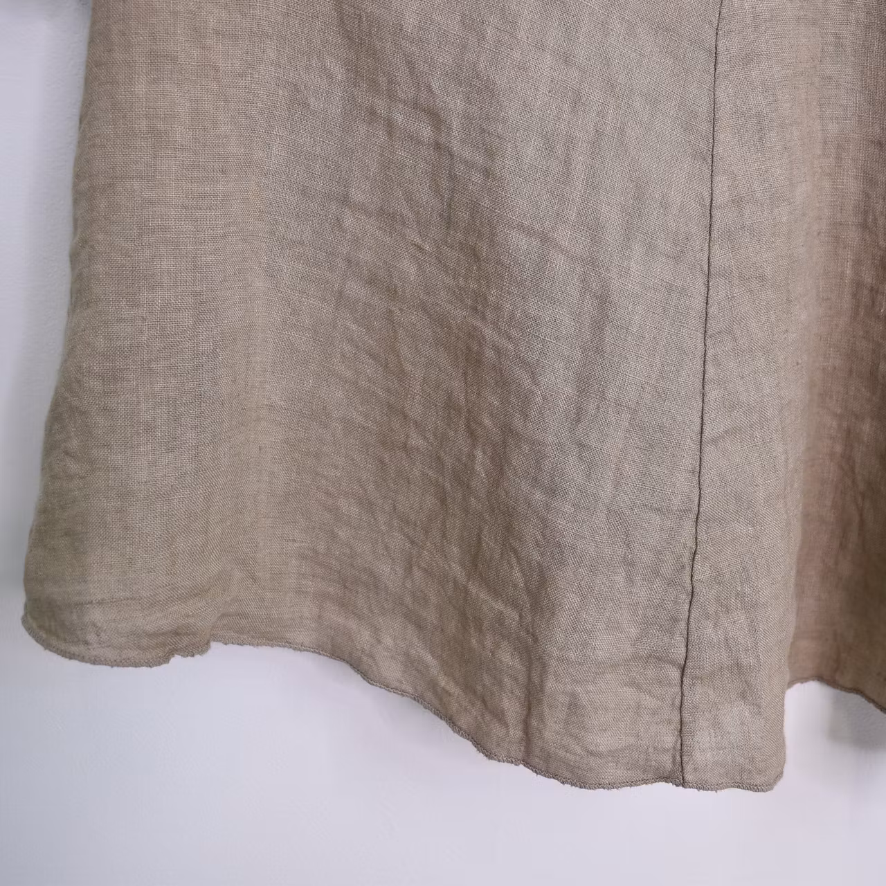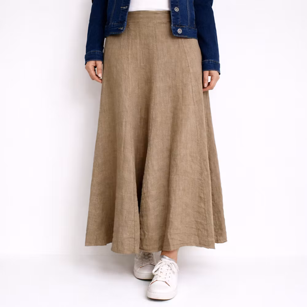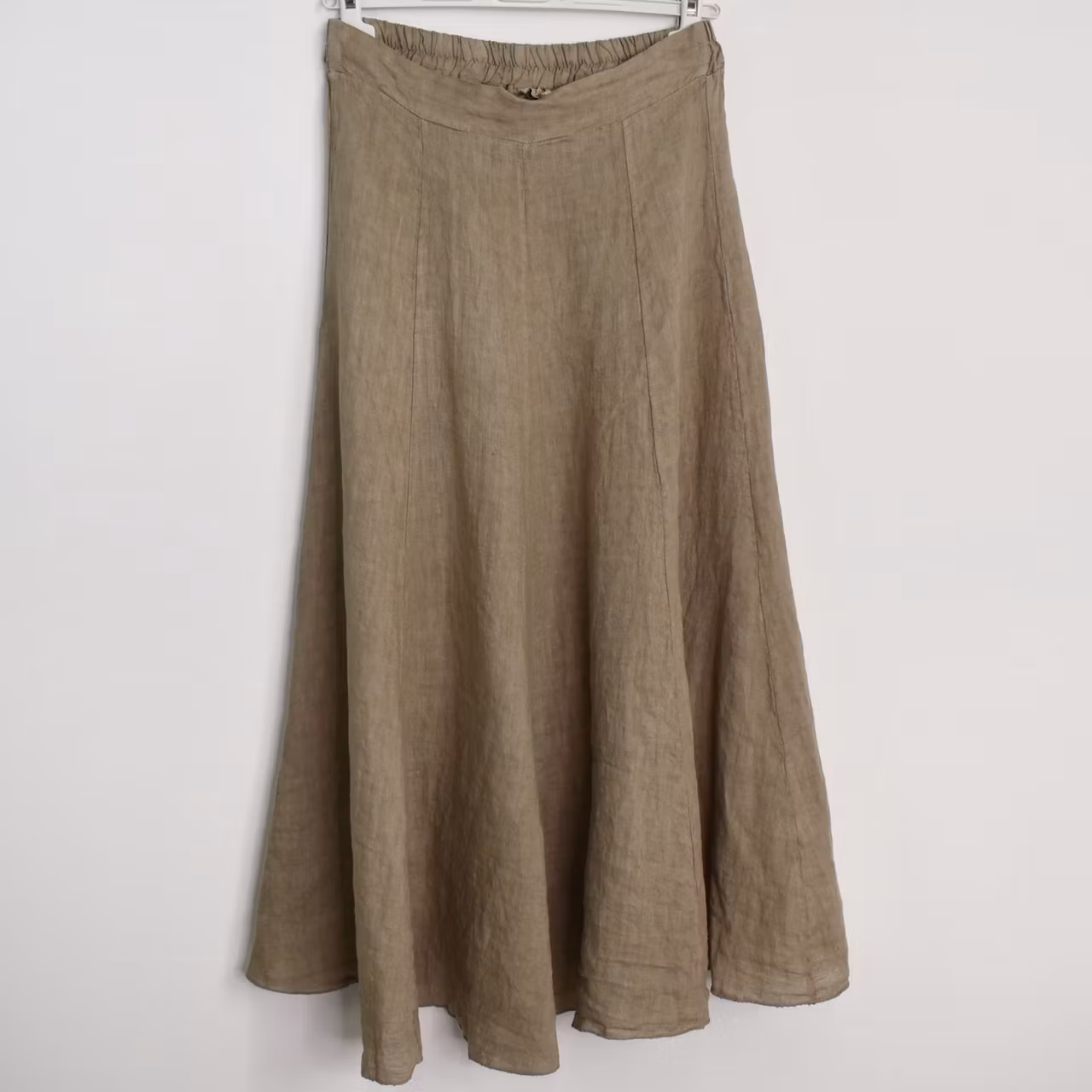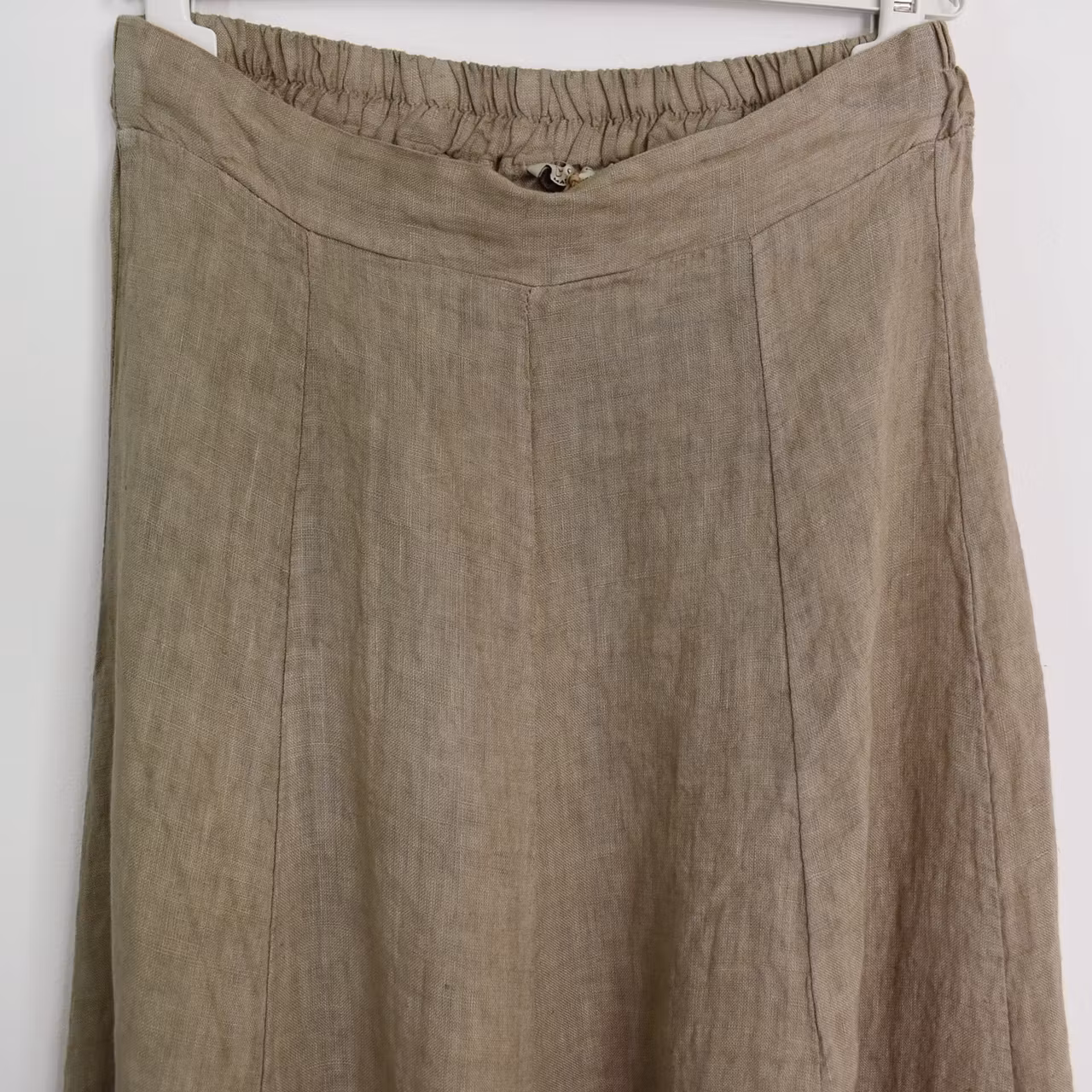 Det här är en snygg klockformad kjol i tunt vävt linnetyg. I midjan baktill är där en skön resår och kjolen har flera lodräta sömmar. Materialet innehåller inte stretch. Modellen har en midjevidd på cirka 78cm och är 163cm lång. Observera att förekomsten av streck, färgskiftningar etc. inte är defekter utan en del av det som gör tyget vackert.