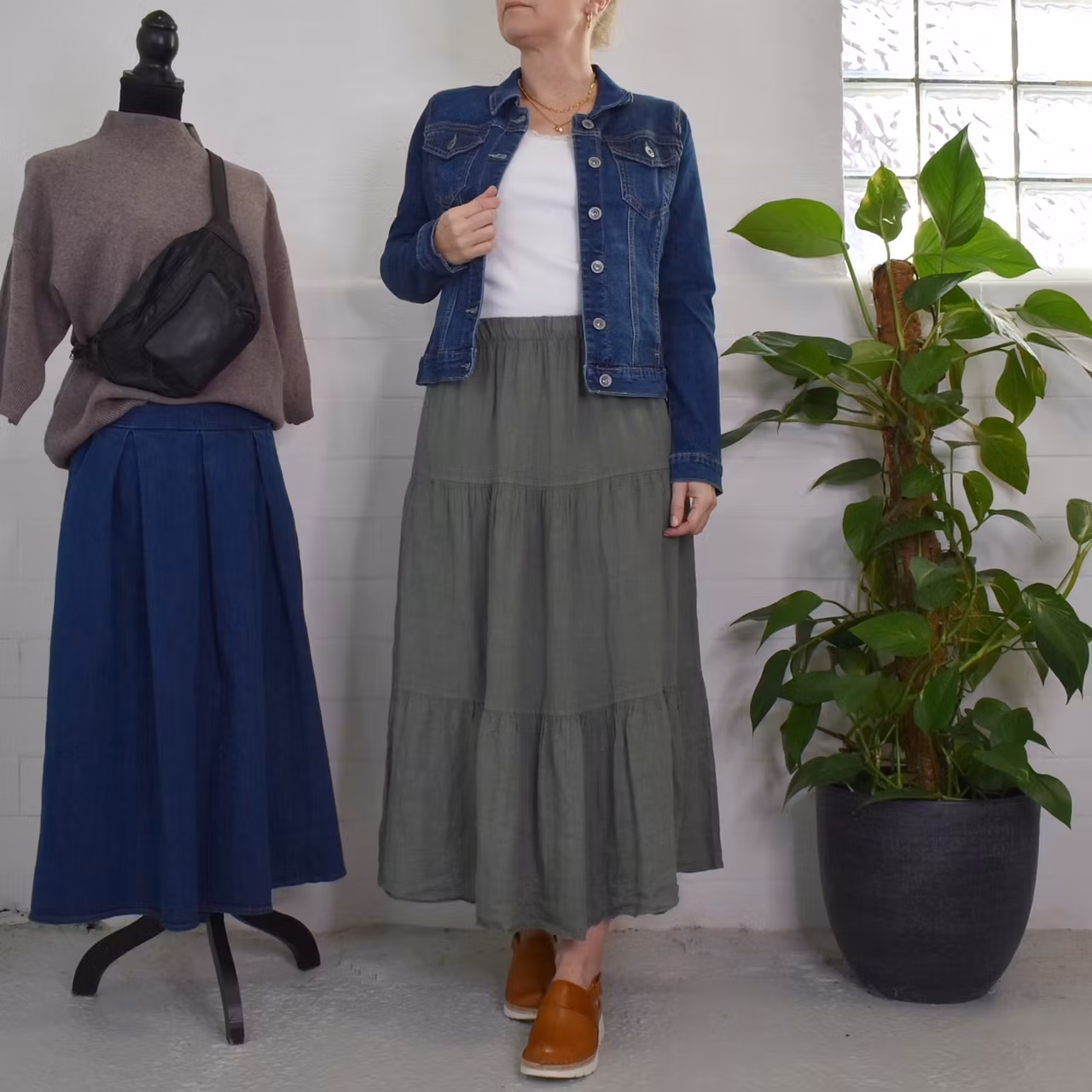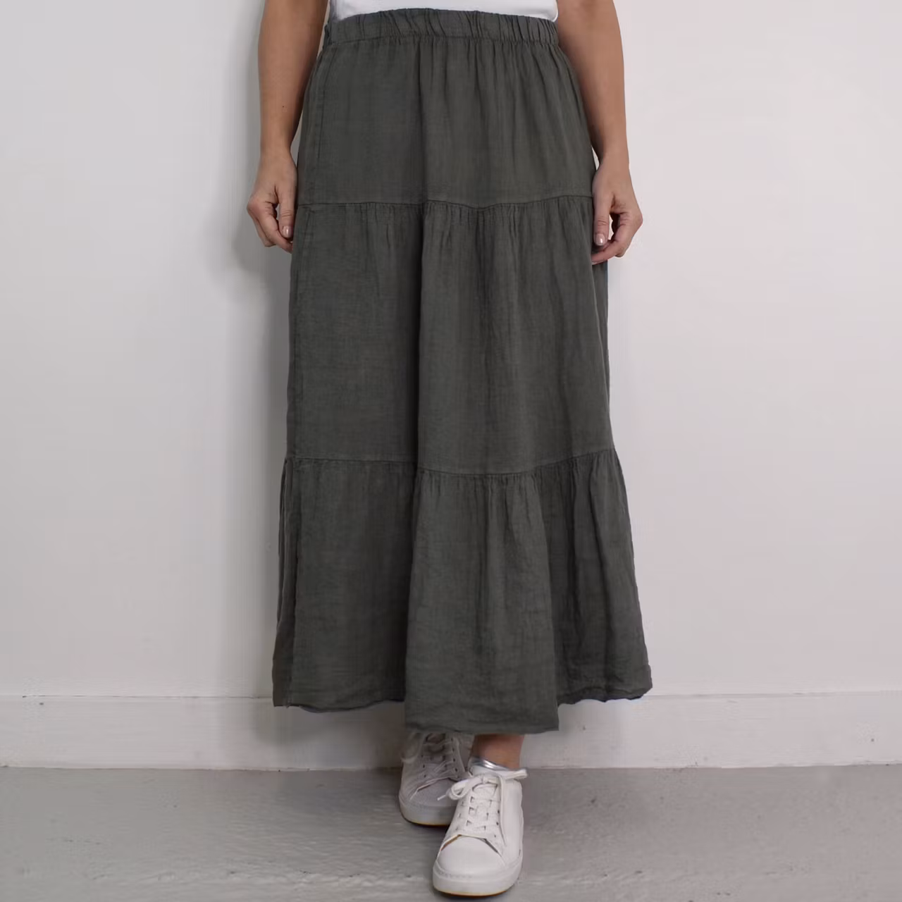 Det här är en härlig kjol i tunt vävt linnetyg med volanger. I midjan är där en skön resår. Materialet innehåller inte stretch och kan upplevas något genomskinligt. Modellen har en midjevidd på cirka 76cm och är 163cm lång. Observera att förekomsten av streck, färgskiftningar etc. inte är defekter utan en del av det som gör tyget vackert.