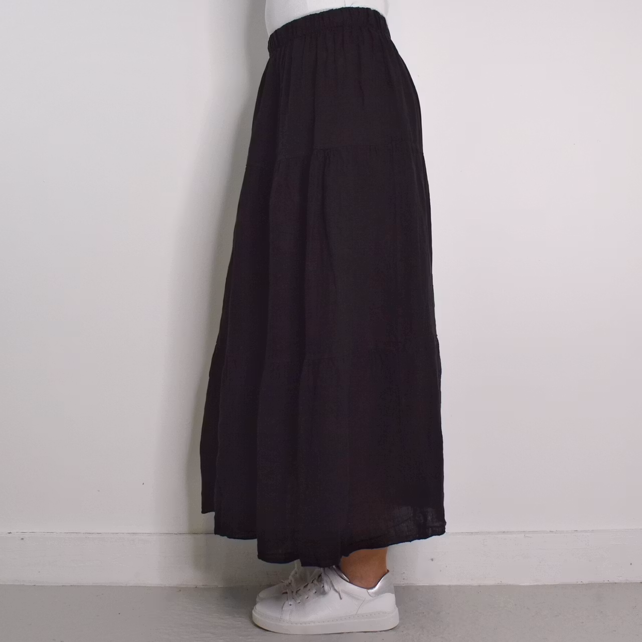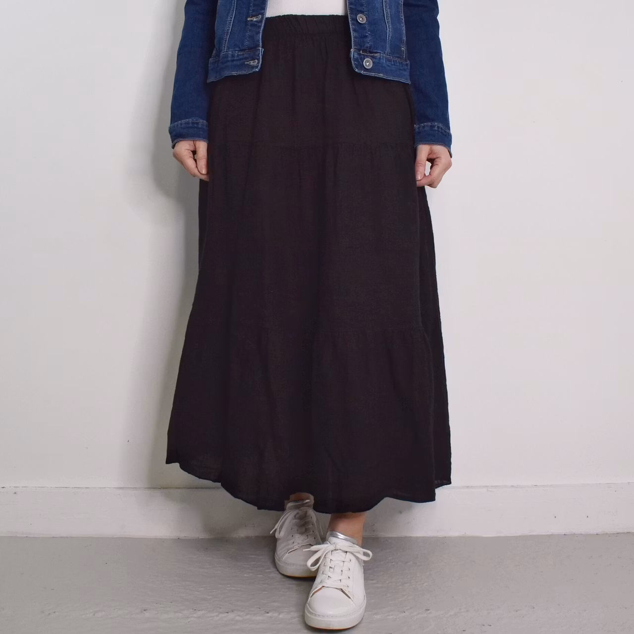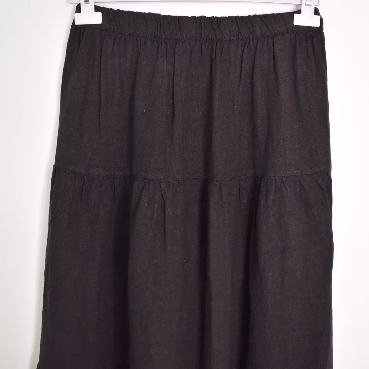 Det här är en härlig kjol i tunt vävt linnetyg med volanger. I midjan är där en skön resår. Tänk på att materialet inte innehåller stretch och att tyget är tunt och kan vara något genomskinligt. Modellen har en midjevidd på cirka 78cm och är 163cm lång. Observera att förekomsten av streck, färgskiftningar etc. inte är defekter utan en del av det som gör tyget vackert.