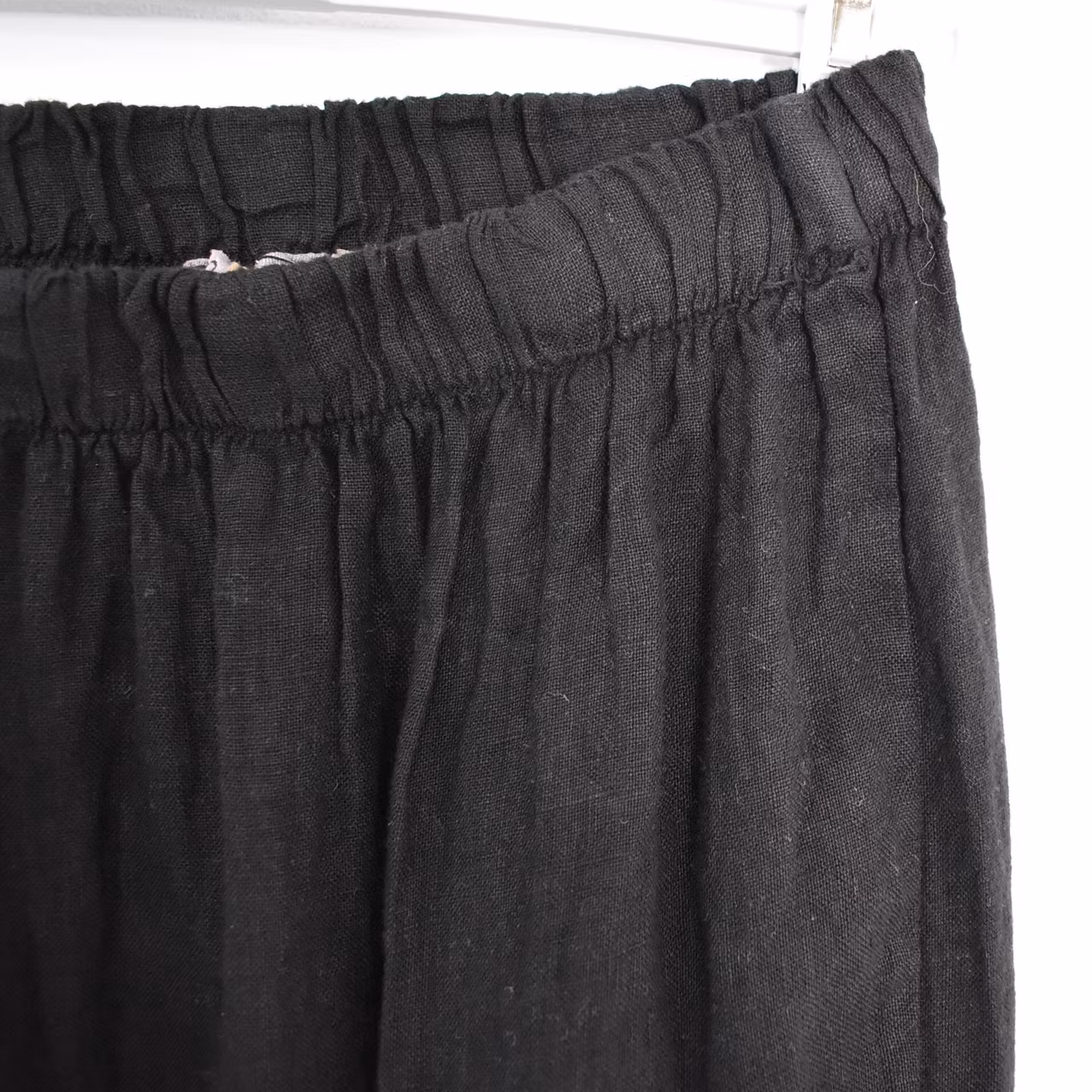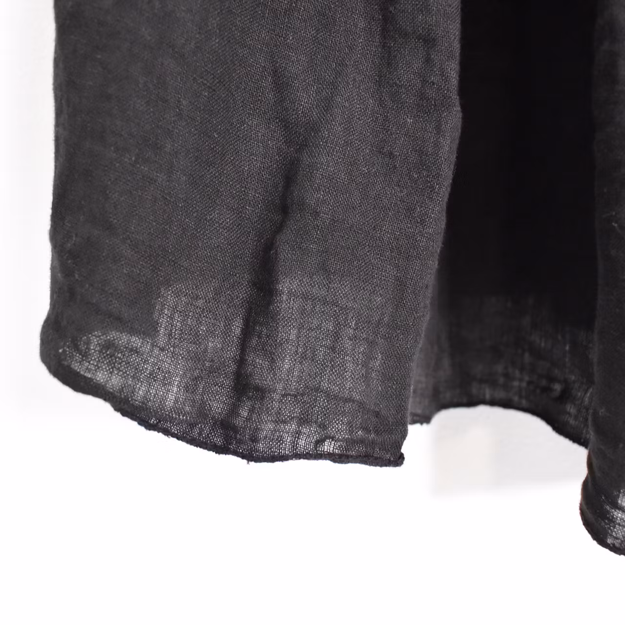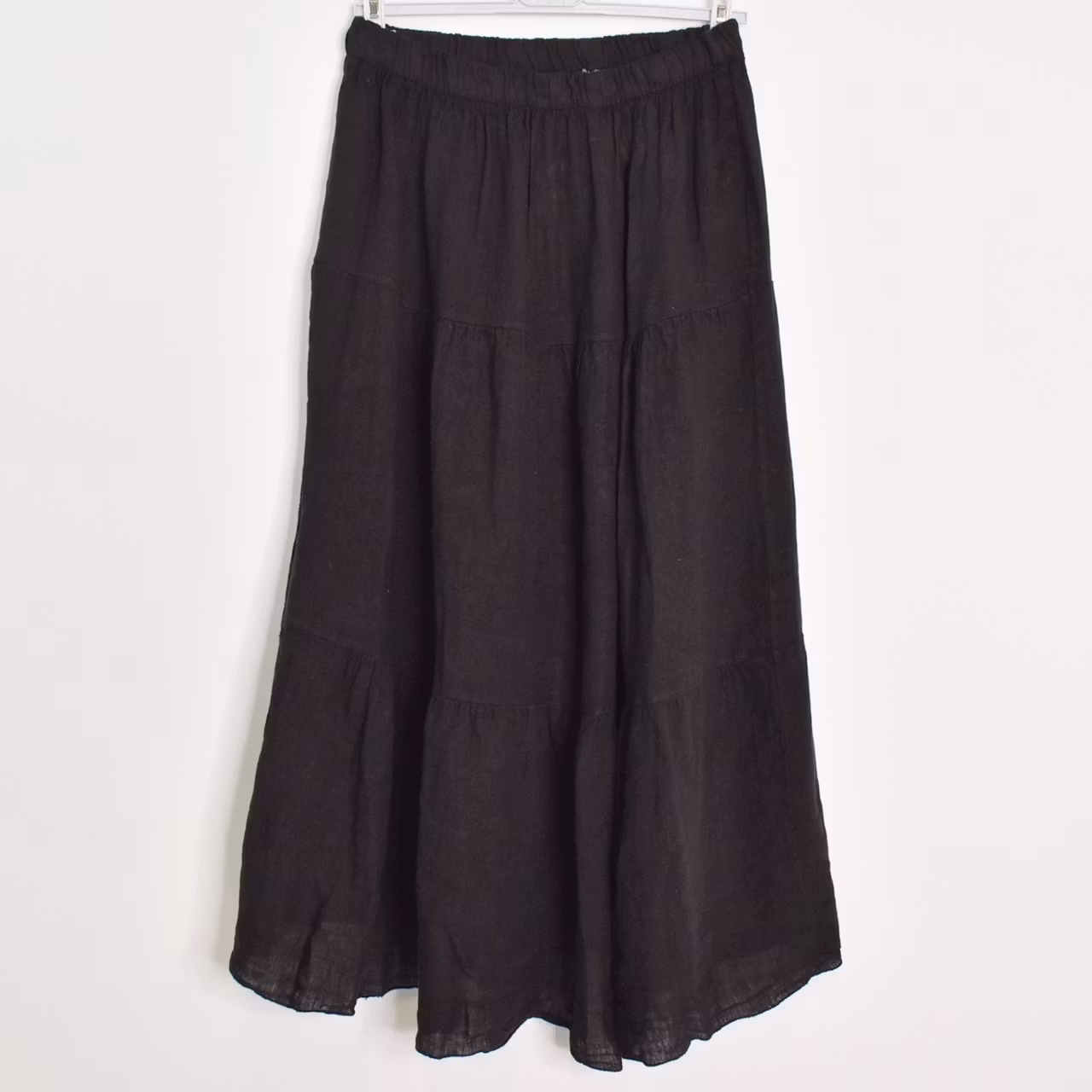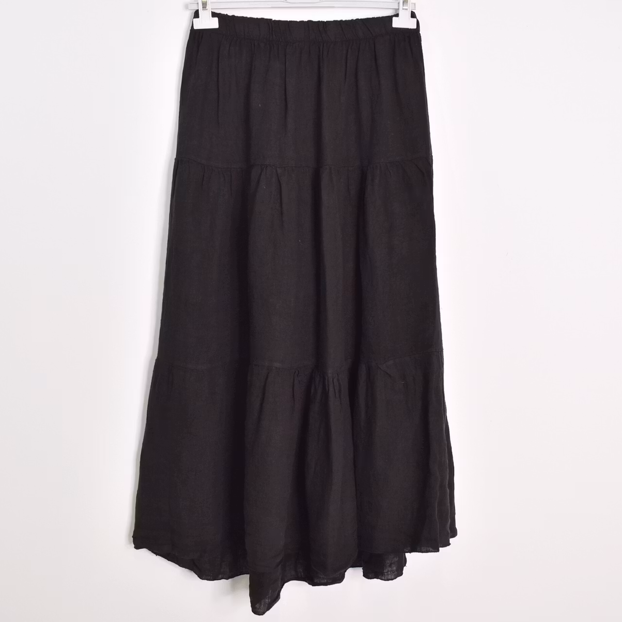 Det här är en härlig kjol i tunt vävt linnetyg med volanger. I midjan är där en skön resår. Tänk på att materialet inte innehåller stretch och att tyget är tunt och kan vara något genomskinligt. Modellen har en midjevidd på cirka 78cm och är 163cm lång. Observera att förekomsten av streck, färgskiftningar etc. inte är defekter utan en del av det som gör tyget vackert.