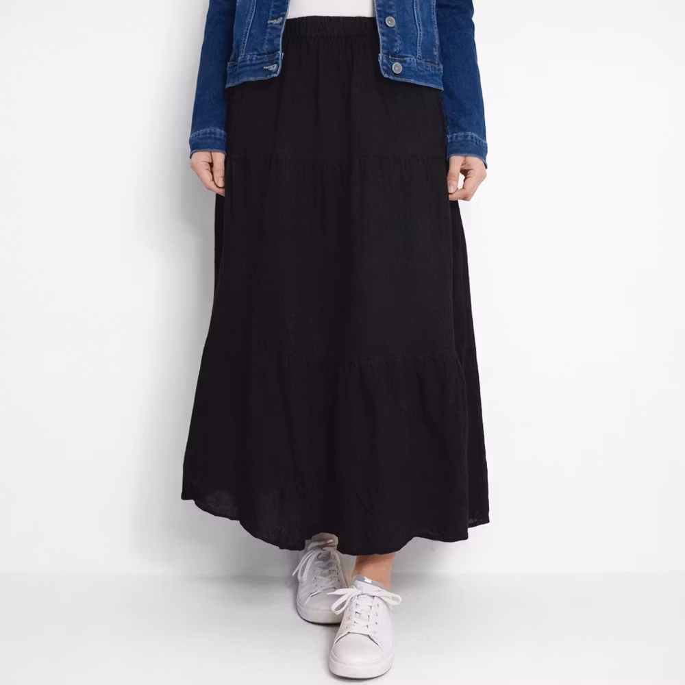 Det här är en härlig kjol i tunt vävt linnetyg med volanger. I midjan är där en skön resår. Tänk på att materialet inte innehåller stretch och att tyget är tunt och kan vara något genomskinligt. Modellen har en midjevidd på cirka 78cm och är 163cm lång. Observera att förekomsten av streck, färgskiftningar etc. inte är defekter utan en del av det som gör tyget vackert.