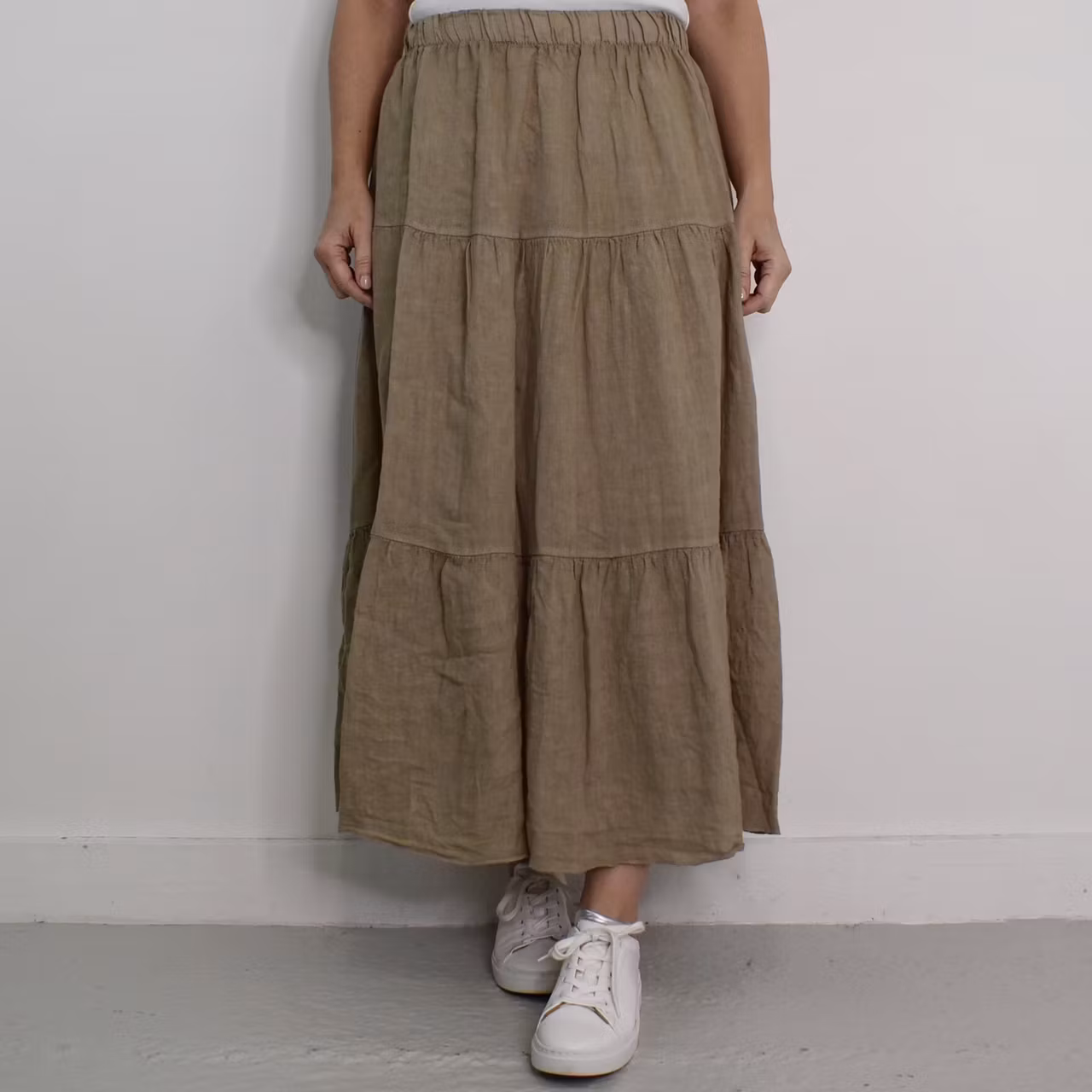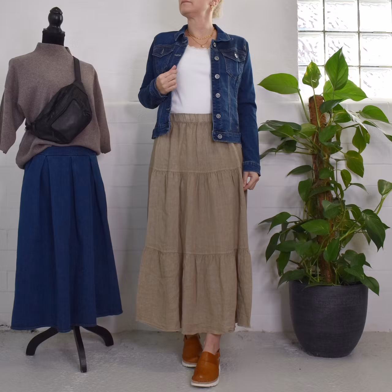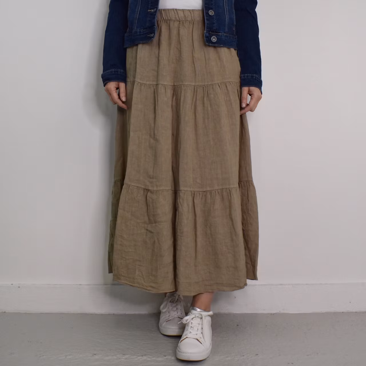Det här är en härlig kjol i tunt vävt linnetyg med volanger. I midjan är där en skön resår. Materialet innehåller inte stretch och kan upplevas något genomskinligt. Modellen har en midjevidd på cirka 76cm, är 163cm lång och bär One Size. Observera att förekomsten av streck, färgskiftningar etc. inte är defekter utan en del av det som gör tyget vackert.