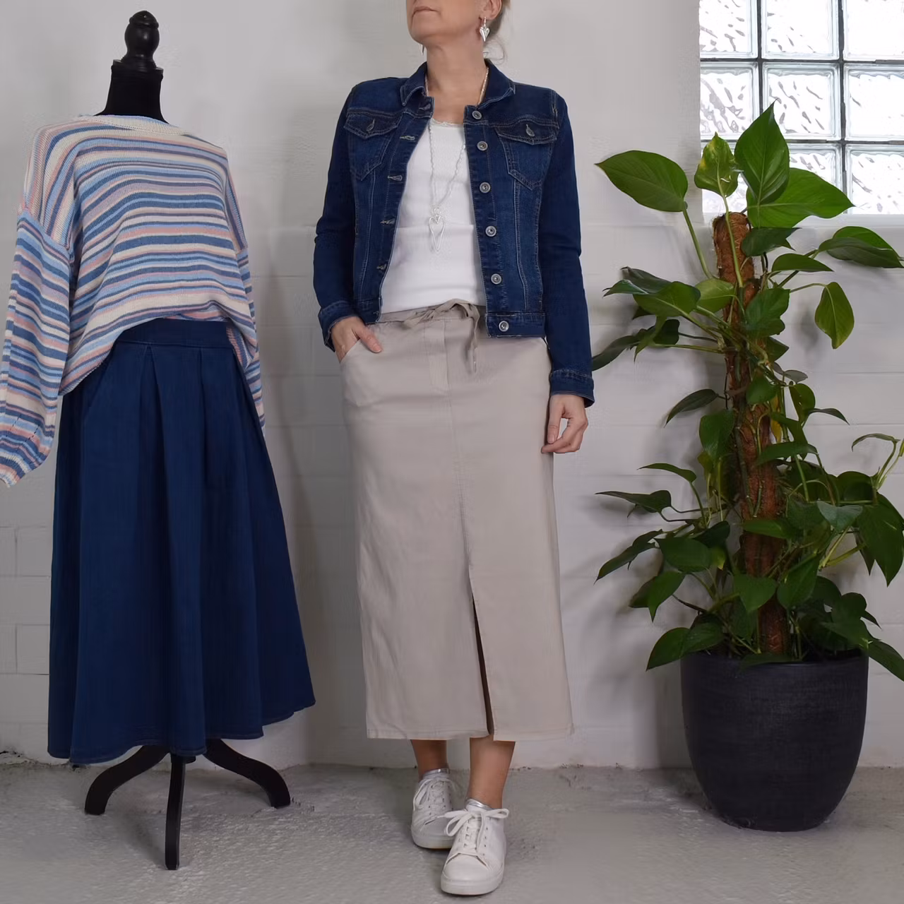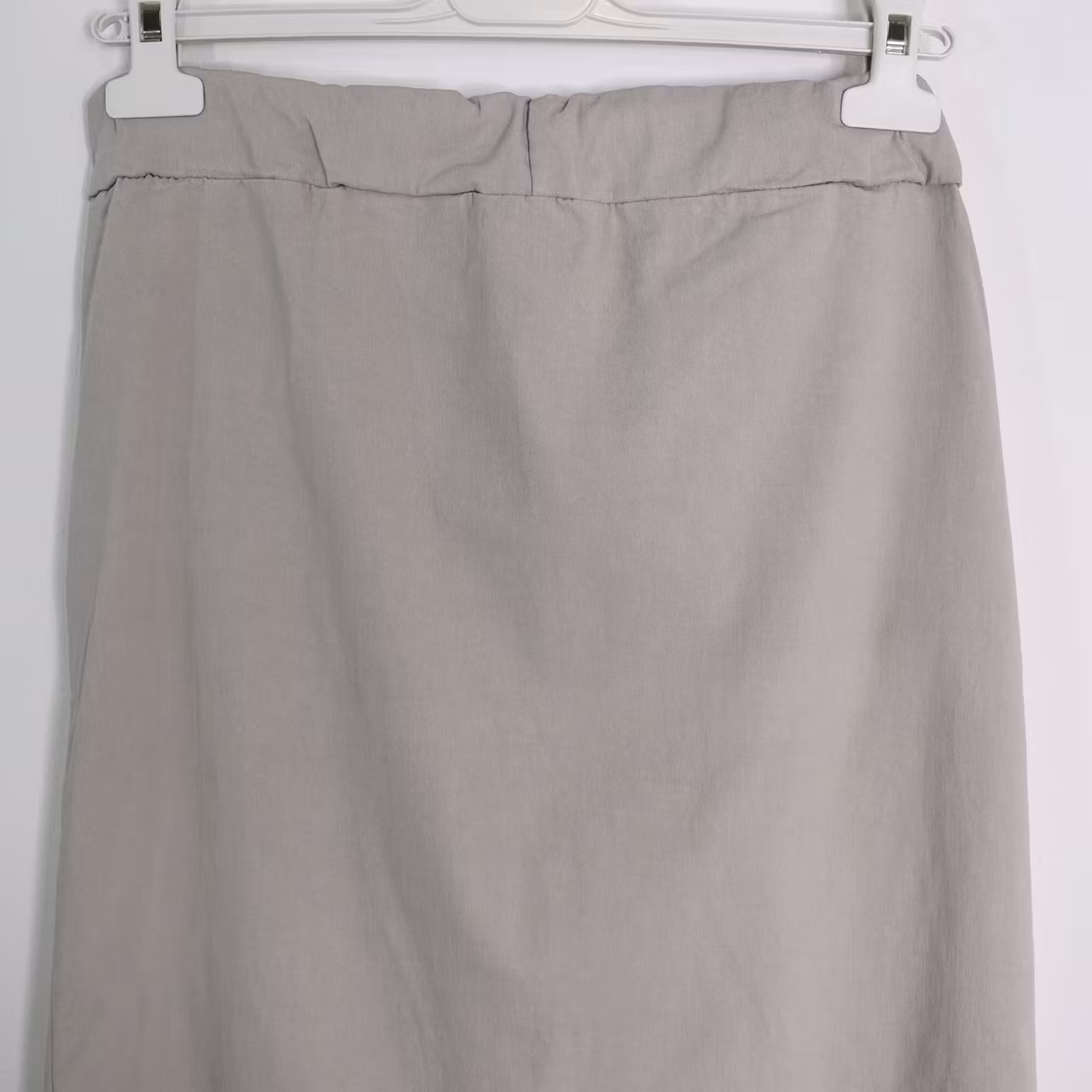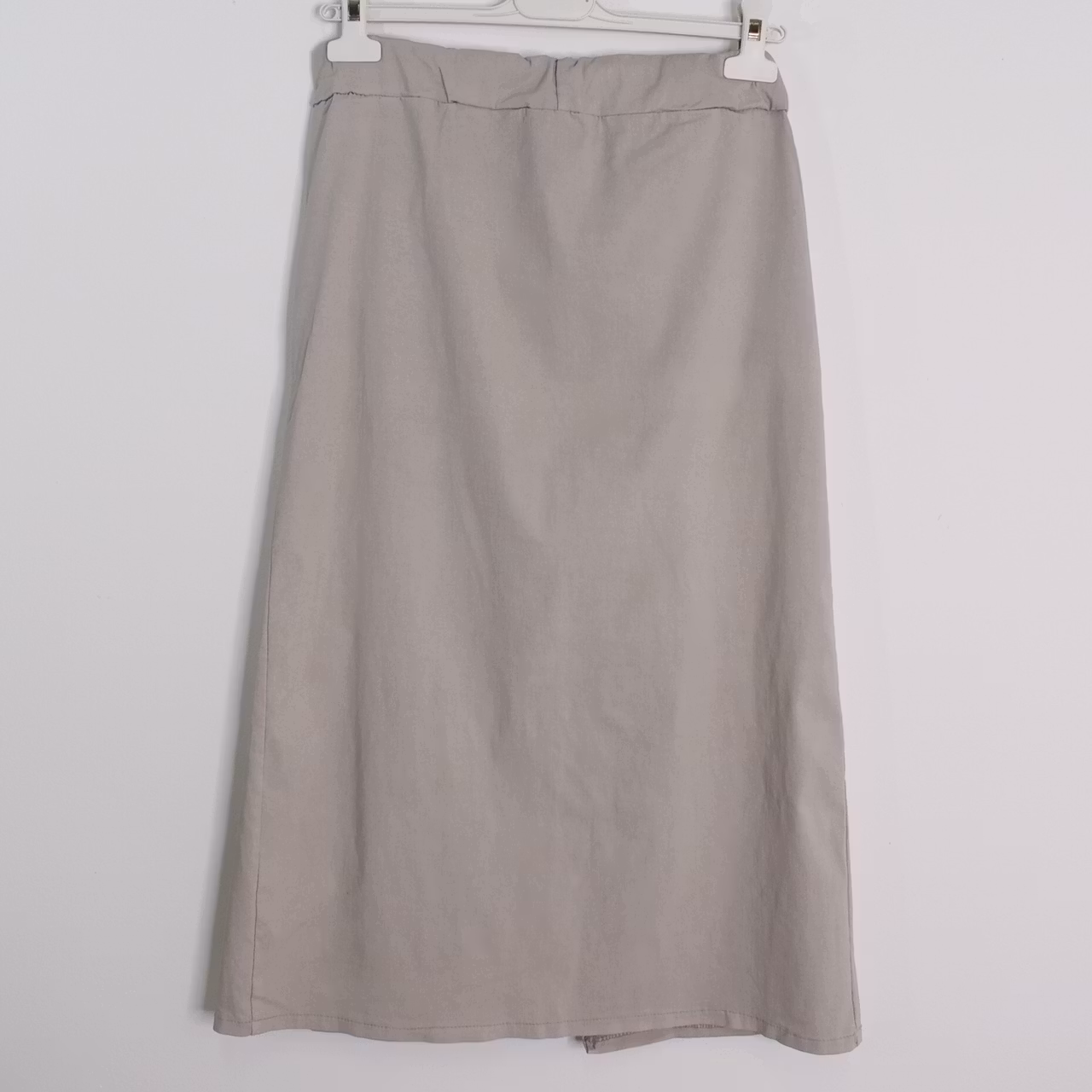 Det här är en skön halvlång stretchig kjol med slits längst ner framtill. Kjolen har resår och knytband i midjan och fickor i sidan. Passformen är ganska snäv. Materialet är stretchigt. Modellen har en midjevidd på cirka 79cm, en stussvid på cirka 99cm och är 163cm lång.