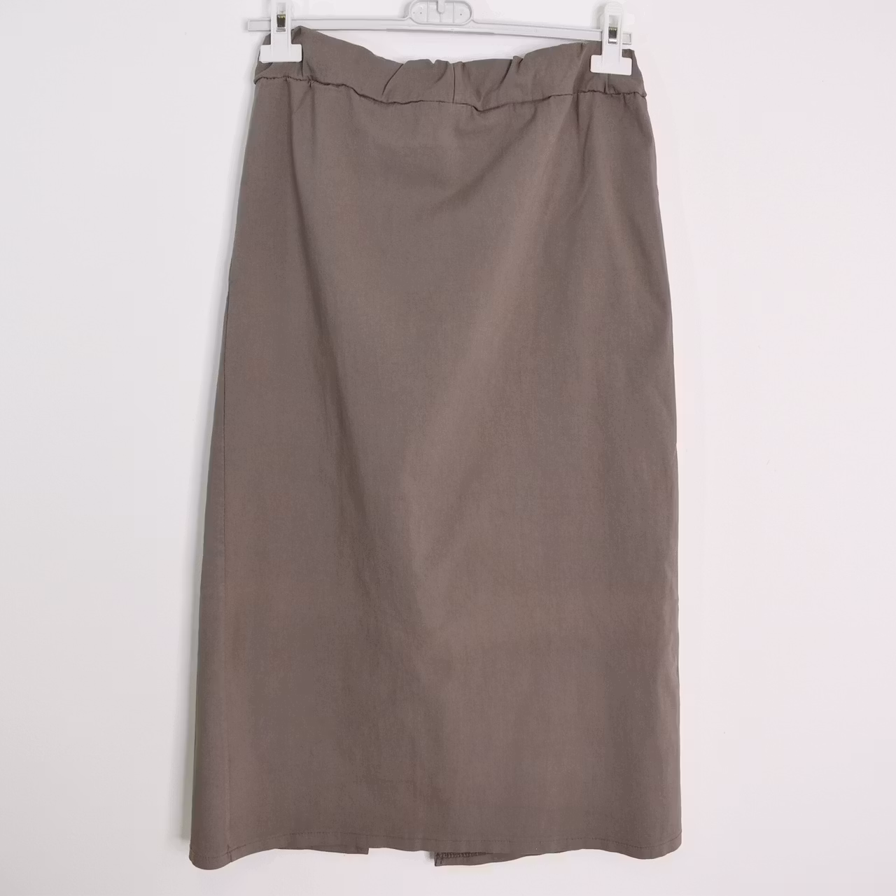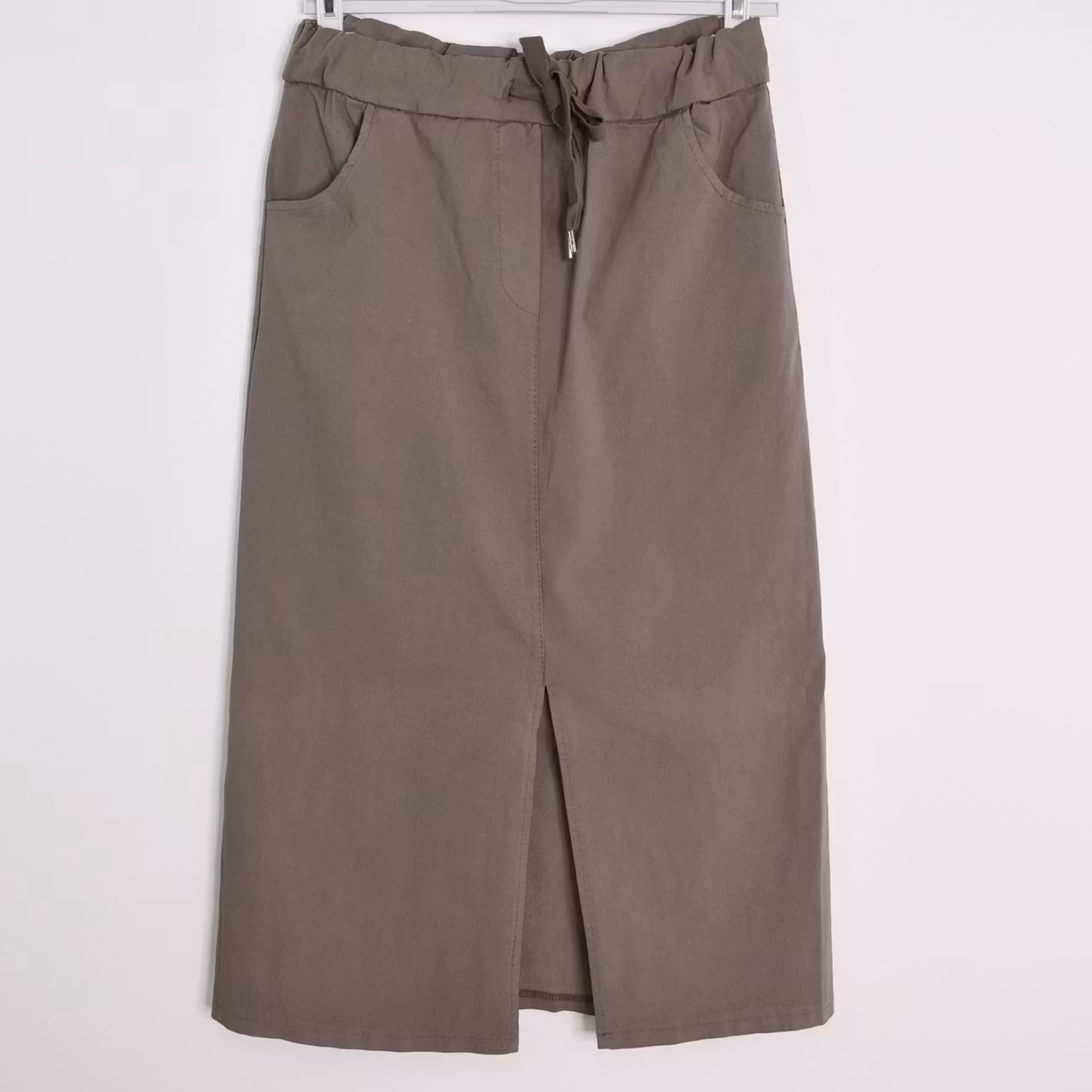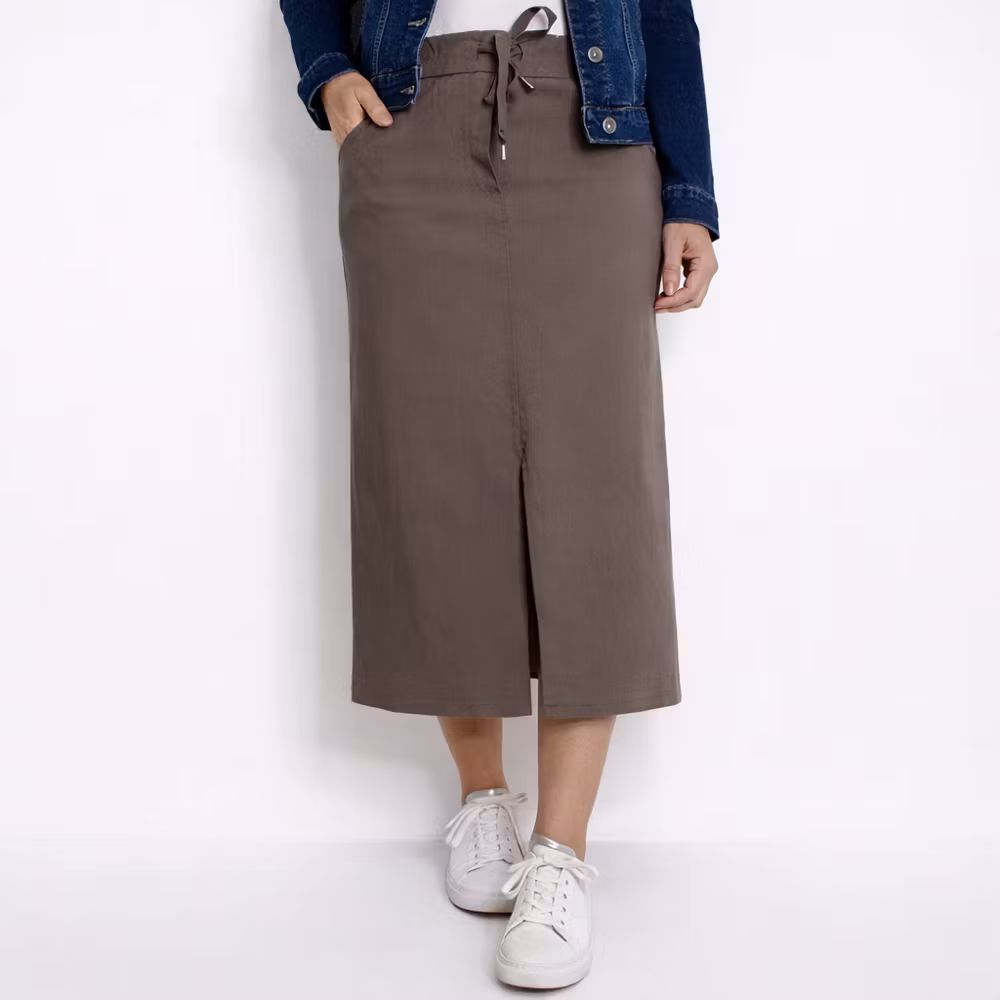 Det här är en skön halvlång stretchig kjol med slits längst ner framtill. Kjolen har resår och knytband i midjan och fickor i sidan. Passformen är ganska snäv. Materialet är stretchigt. Modellen har en midjevidd på cirka 79cm, en stussvid på cirka 99cm och är 163cm lång.