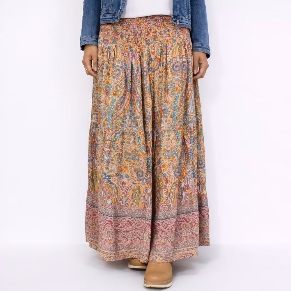 Det här är en underbar lång volang-kjol med vackert mönster i härliga färger. I midjan är där en bred, mjuk och väldigt töjbar smock. Kjolen kan även användas som tubklänning. Tyget är tunt och innehåller inte stretch. Eftersom färgerna i mönstret "smälter ihop" på avstånd är de viktigt att titta på detaljbilderna för att se färgerna ordentligt. Observera att mönstret inte exakt likadant ut på alla exemplar utan de är helt olika placerade och ser inte ut precis som den kjol vi använt på bilderna. Finns i två olika varianter - Mindre One Size och One Size (se mått nedan för att bedöma vilken variant du ska ha). Då vi alla är olika formade rekommenderar vi att man använder måtten längre ner i beskrivningen för att bedöma om plagget kan passa. Modellen har ett midjemått på cirka 76cm är 163cm lång och bär One Size.