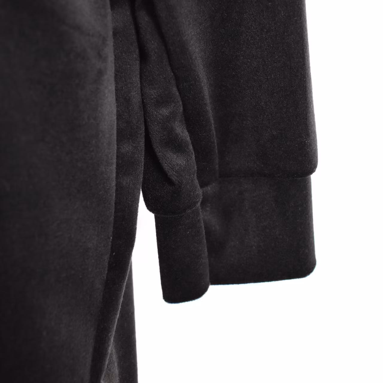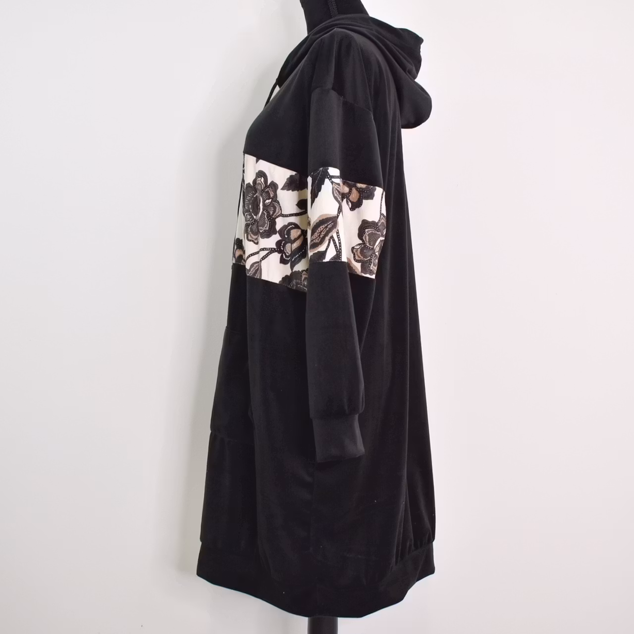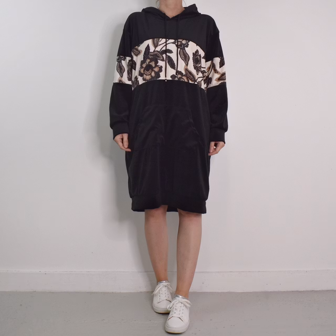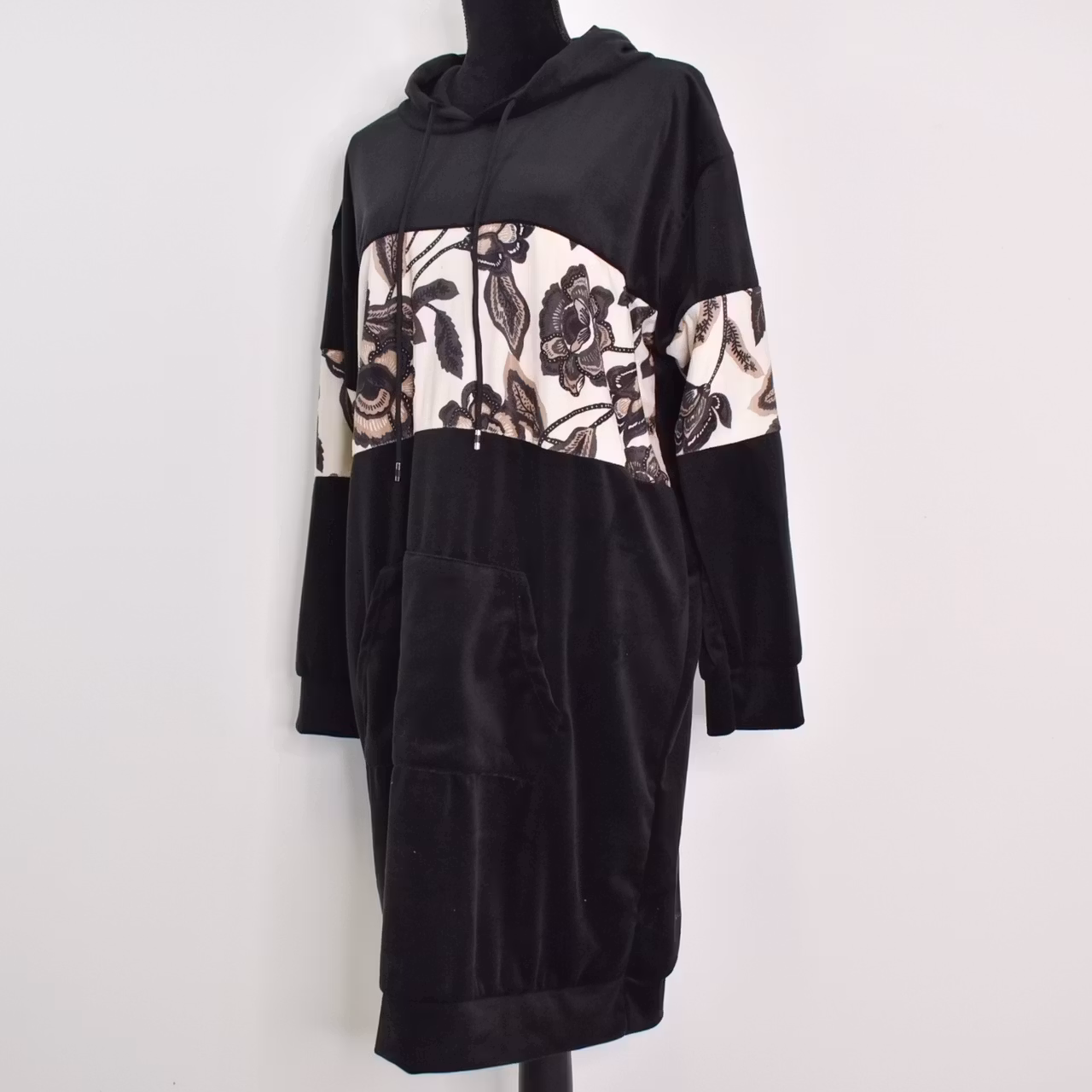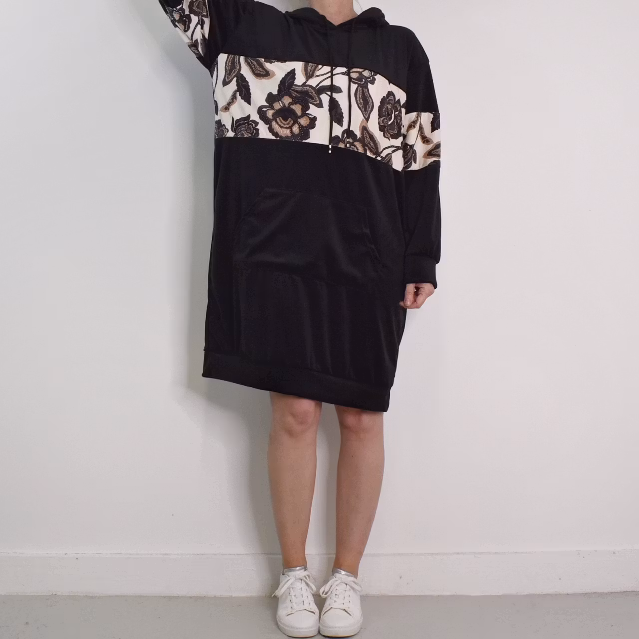 Det här är en mysig och läcker hoodie-klänning i mjukt, tunt och stretchigt velour-material med glans. På magen finns en ficka och tvärs över framtill, samt på ärmarna är det blommönster. Axeln är något nerhasad och från huvan är där knytband. Modellen har en bröstvidd på cirka 88cm, är 163cm lång och bär S/M.