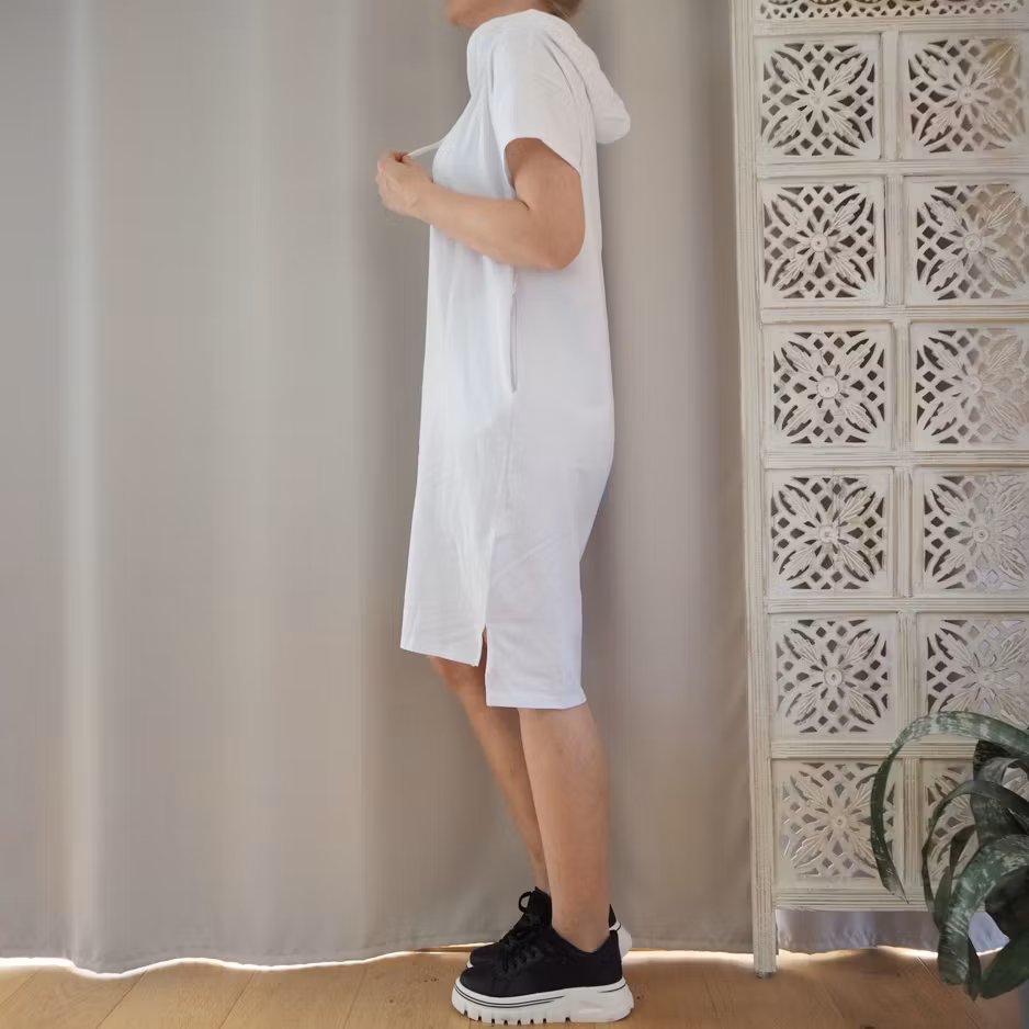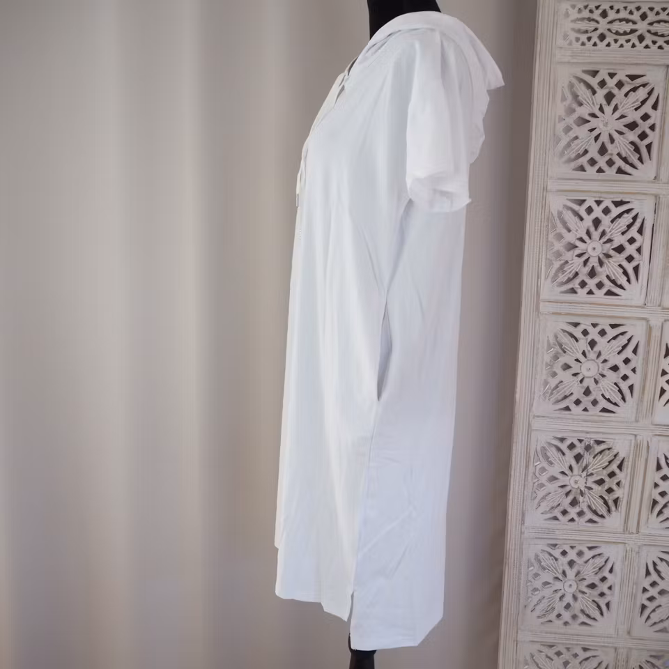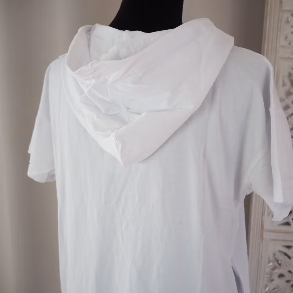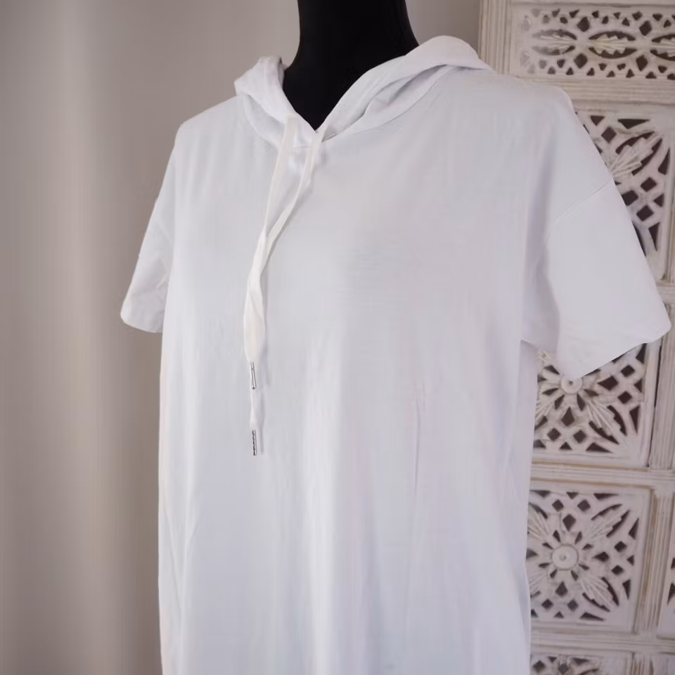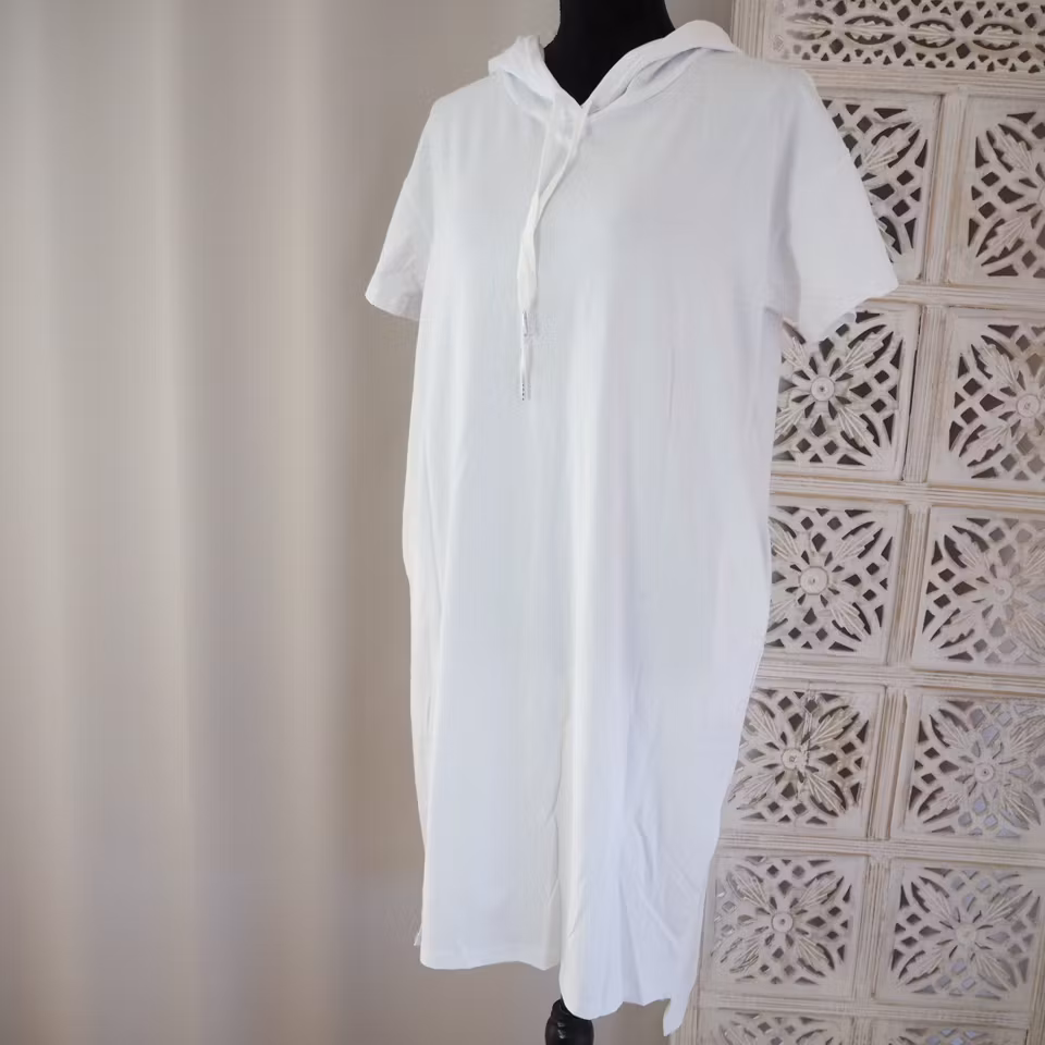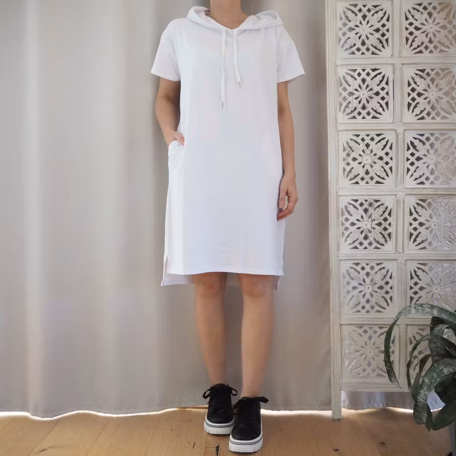 Det här är en cool hoodieklänning i tunt, härligt bomullstyg. Knytband vid luvan och i sidorna finns gömda fickor. Klänningen är aningen längre baktill. Liten slits i sidan. Materialet innehåller stretch och är en aning genomskinligt. Två storlekar - S/M & M/L. Se ungefärliga mått i beskrivningen. Modellen är storlek S, har en bröstvidd på 88cm, är 163cm lång och bär storlek S/M.Storlekar: S/M-M/L