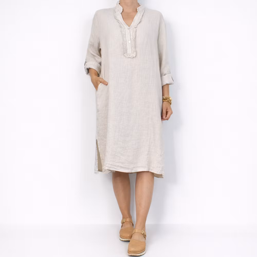 Kort Linneklänning med Krås BEIGE
