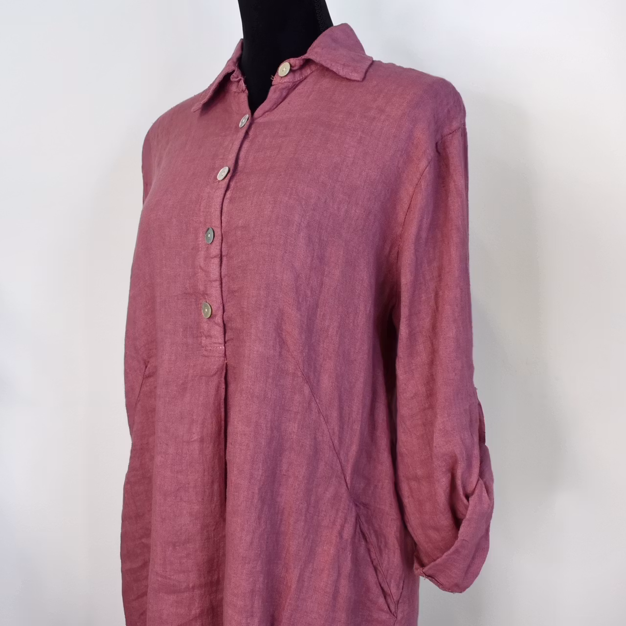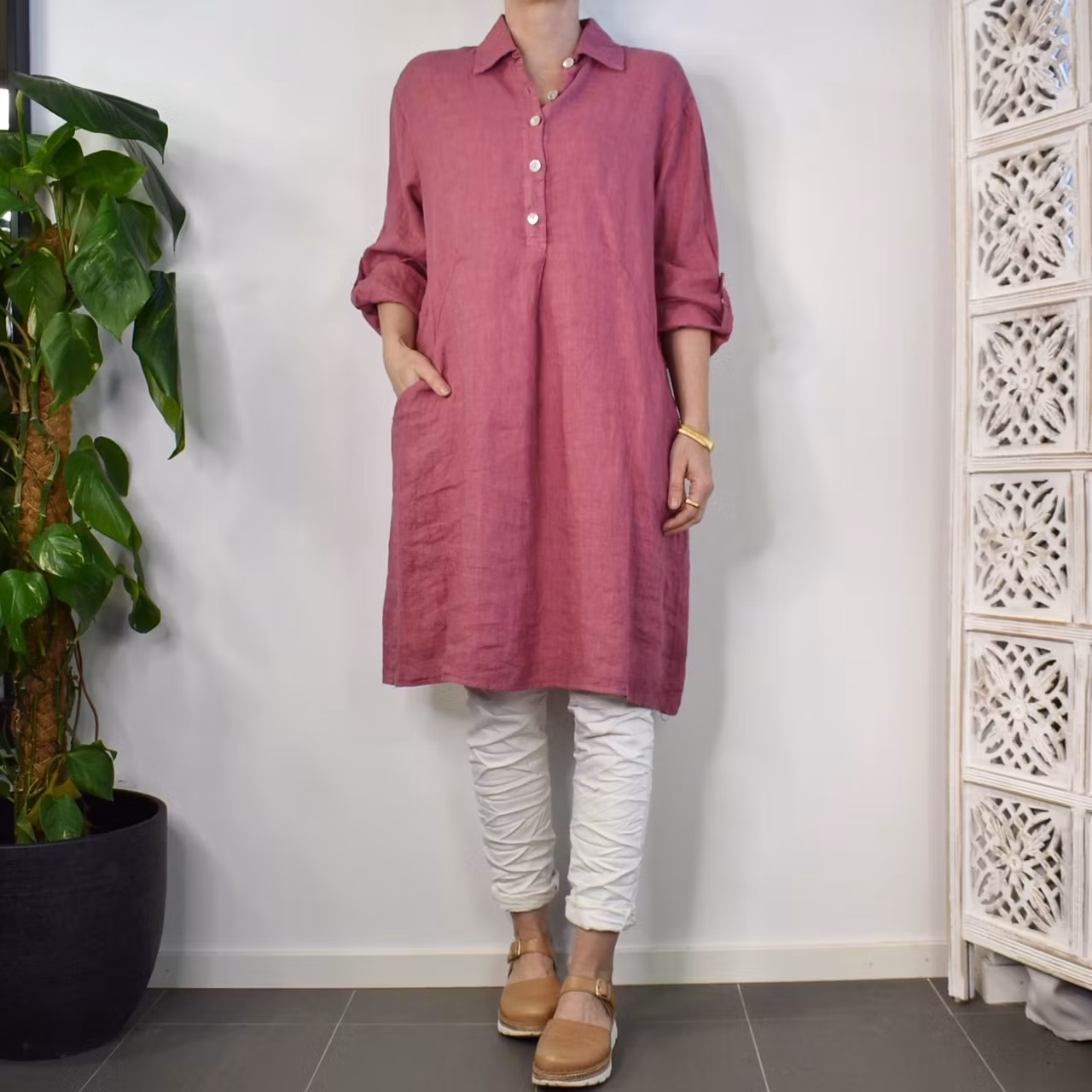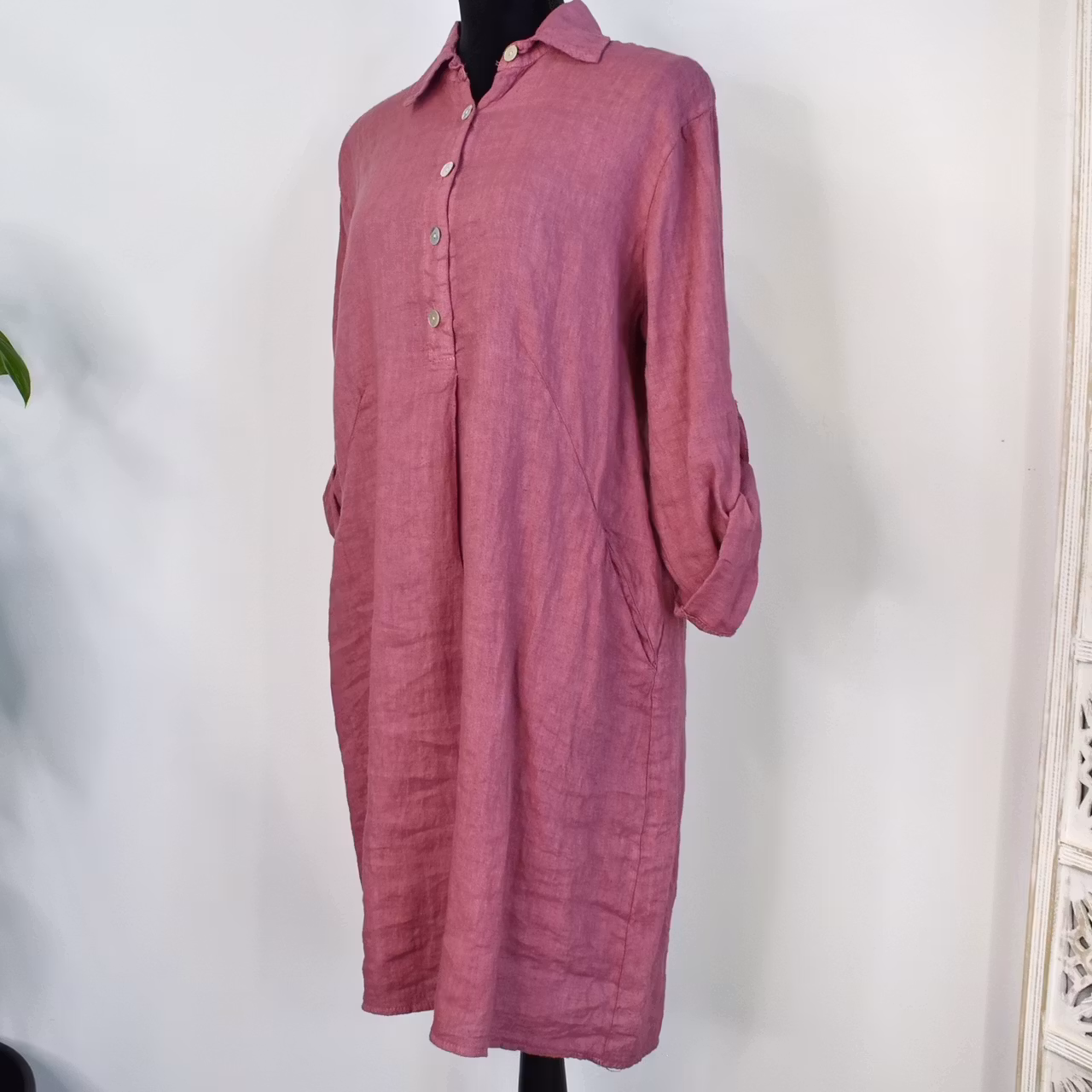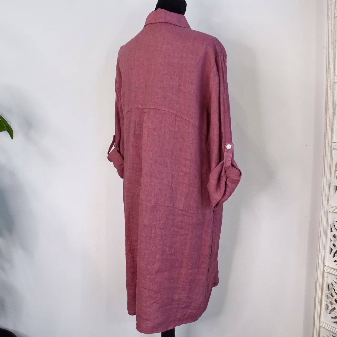 Detta är en underbar kort skjortklänning i härligt linne-material. Det finns knappar upptill med sprund nedanför och där är gömda fickor fram. Ärmen kan fästas upp med knapp. På ryggen finns ett dekorativt sprund. Observera att materialet inte innehåller stretch och att tyget kan vara något genomskinligt. Då vi alla är olika formade rekommenderar vi att man använder sig av måtten längre ner i beskrivningen för att bedöma om plagget kan passa. One Size - passar uppskattningsvis upp till L/XL (passformen varierar beroende på varje unik persons form och proportioner). Modellen är storlek S, har en bröstvidd på cirka 88cm och är 163cm lång.