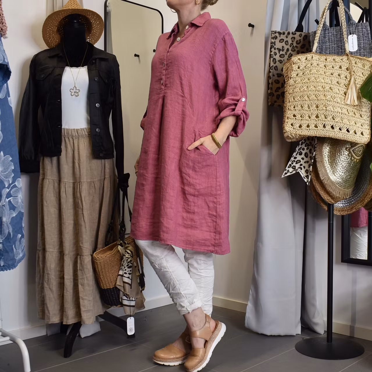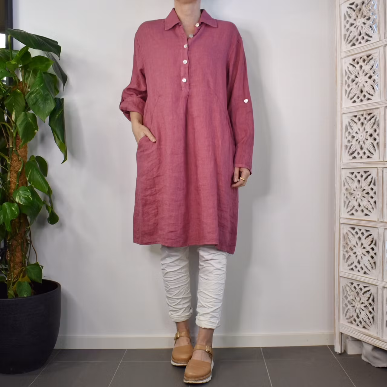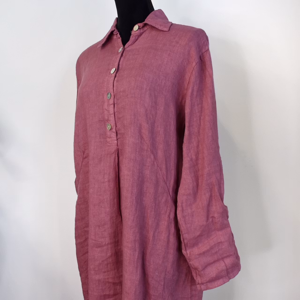 Detta är en underbar kort skjortklänning i härligt linne-material. Det finns knappar upptill med sprund nedanför och där är gömda fickor fram. Ärmen kan fästas upp med knapp. På ryggen finns ett dekorativt sprund. Observera att materialet inte innehåller stretch och att tyget kan vara något genomskinligt. Då vi alla är olika formade rekommenderar vi att man använder sig av måtten längre ner i beskrivningen för att bedöma om plagget kan passa. One Size - passar uppskattningsvis upp till L/XL (passformen varierar beroende på varje unik persons form och proportioner). Modellen är storlek S, har en bröstvidd på cirka 88cm och är 163cm lång.