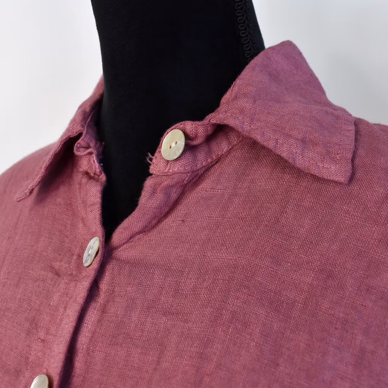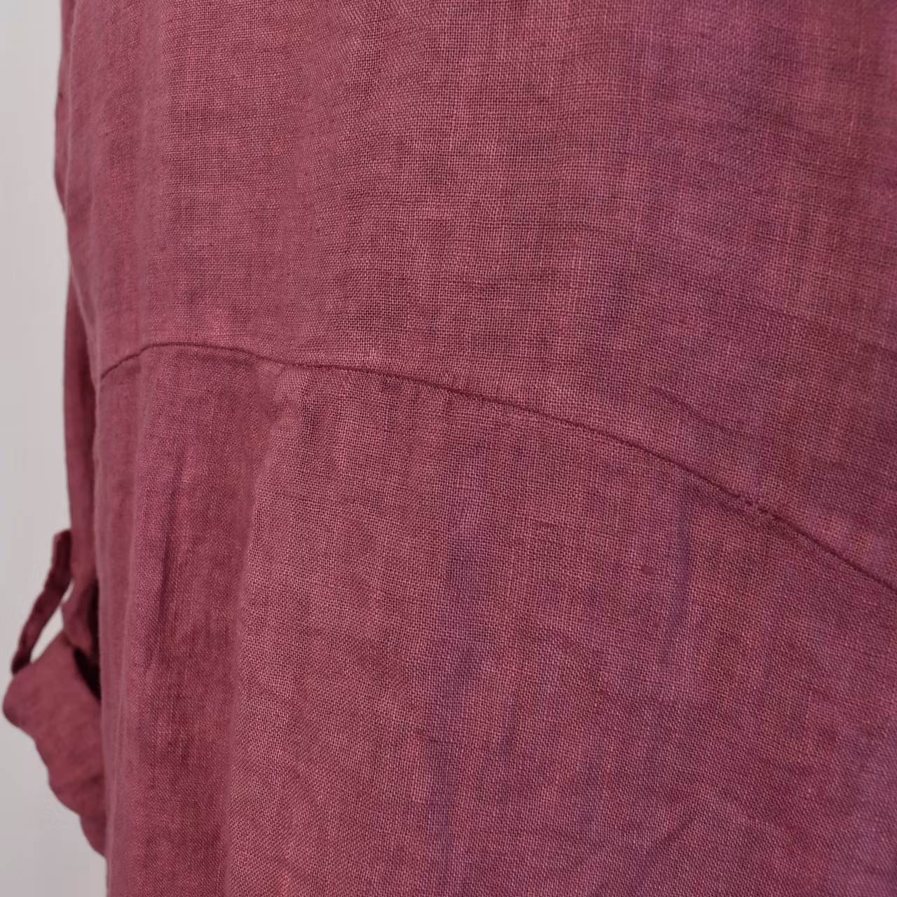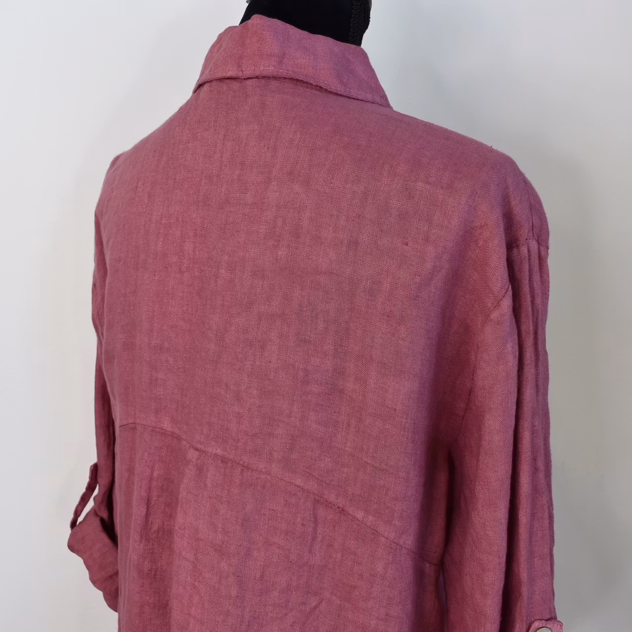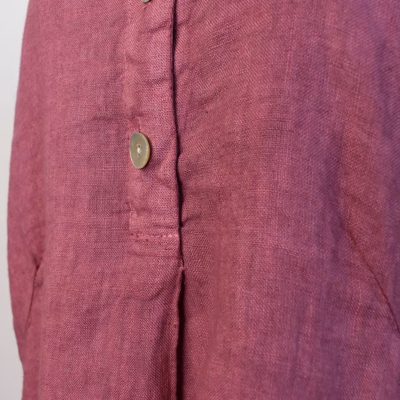 Detta är en underbar kort skjortklänning i härligt linne-material. Det finns knappar upptill med sprund nedanför och där är gömda fickor fram. Ärmen kan fästas upp med knapp. På ryggen finns ett dekorativt sprund. Observera att materialet inte innehåller stretch och att tyget kan vara något genomskinligt. Då vi alla är olika formade rekommenderar vi att man använder sig av måtten längre ner i beskrivningen för att bedöma om plagget kan passa. One Size - passar uppskattningsvis upp till L/XL (passformen varierar beroende på varje unik persons form och proportioner). Modellen är storlek S, har en bröstvidd på cirka 88cm och är 163cm lång.