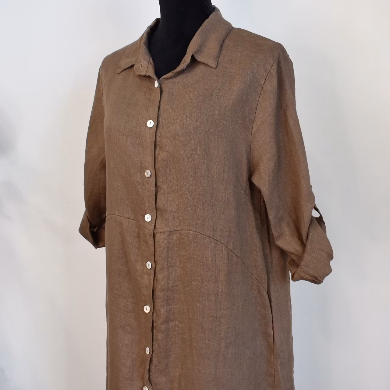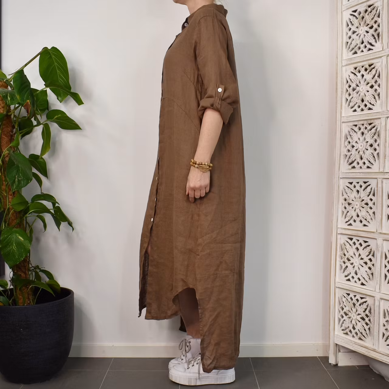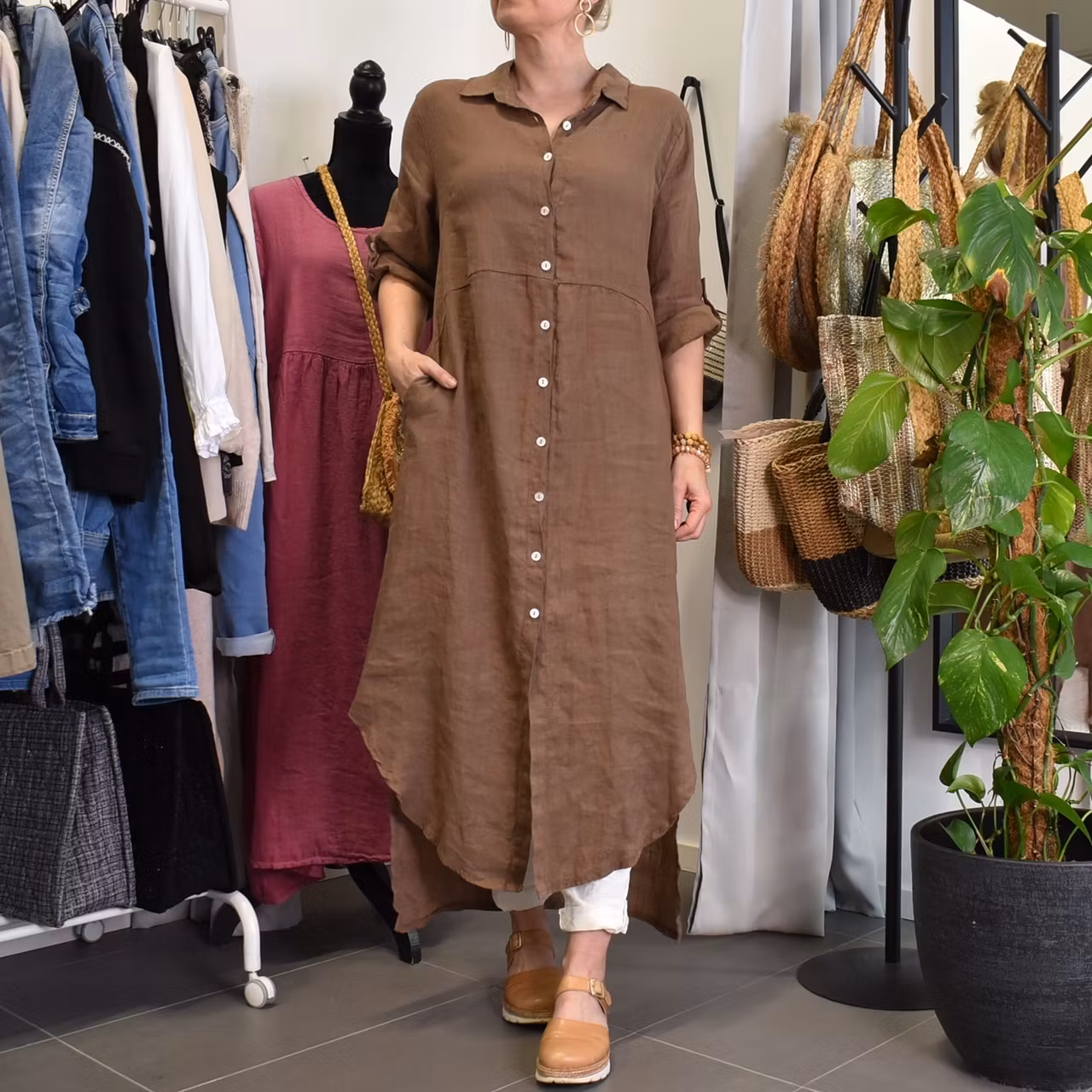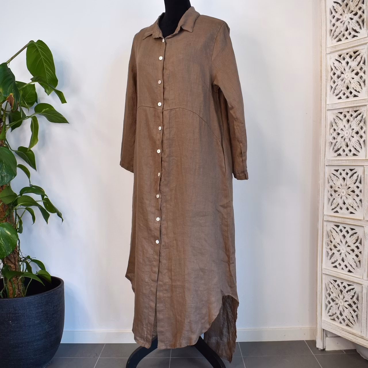 Det här är en snygg lång skjortklänning i tunt, mjukt linnetyg. Där är pärlemorskimrande knappar hela vägen fram samt gömda fickor i sidan. Ärmen är lång men kan vikas upp och fästas med knapp. Det finns en rundad slits i sidan nertill och dekorativt sprund i ryggen. Klänningen är längre baktill. Observera att materialet inte innehåller stretch och att tyget är något genomskinligt. Då vi alla är olika formade och upplever storlekar olika så rekommenderar vi att man alltid använder sig av måtten längre ner i beskrivningen för att bedöma om plagget kan passa. Storlekar S/M & L/XL. Modellen har en bröstvidd på cirka 88cm, är 163cm lång och bär storlek S/M. Observera att förekomsten av streck, färgskiftningar etc. inte är defekter utan en del av det som gör tyget vackert.