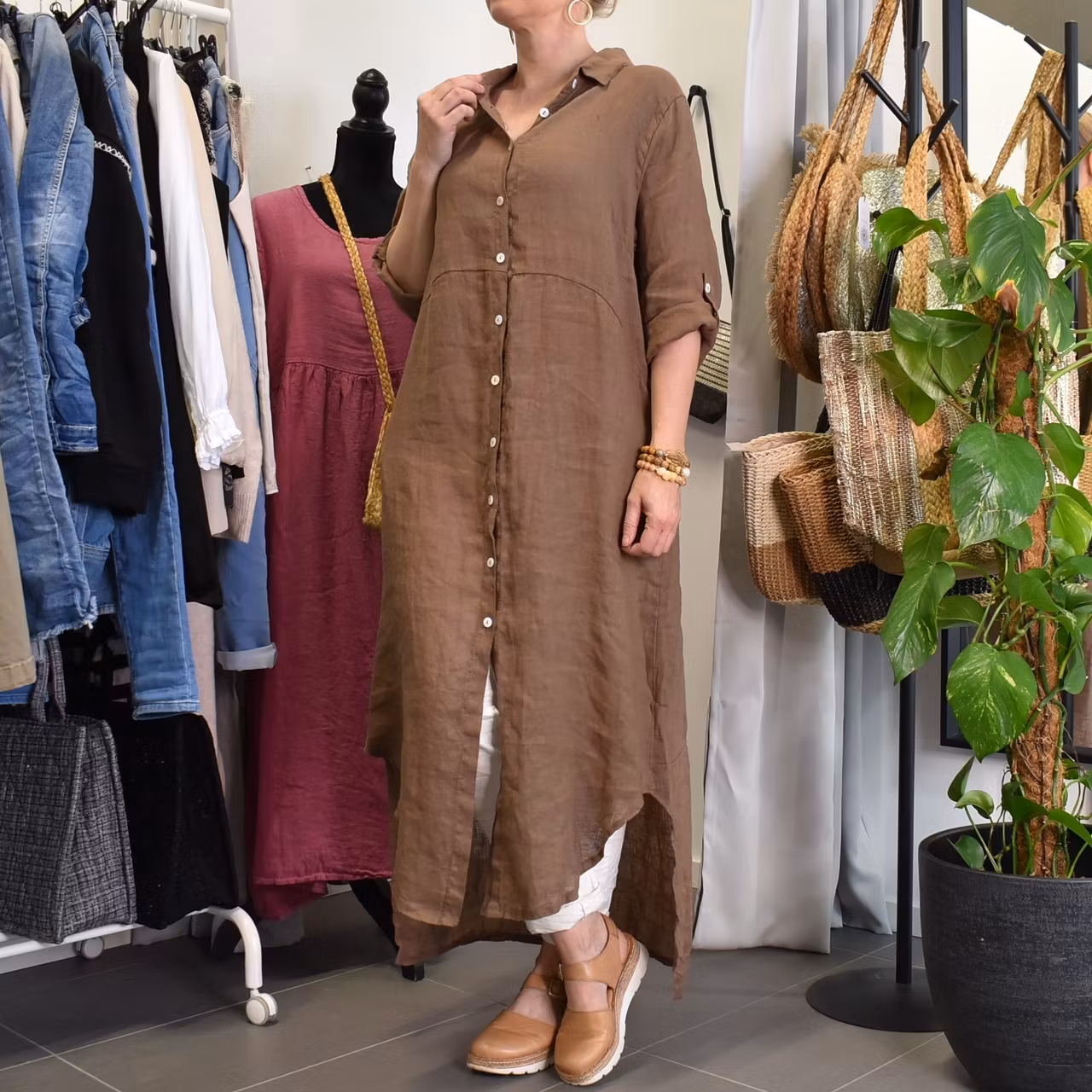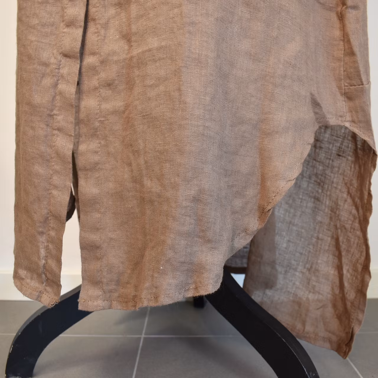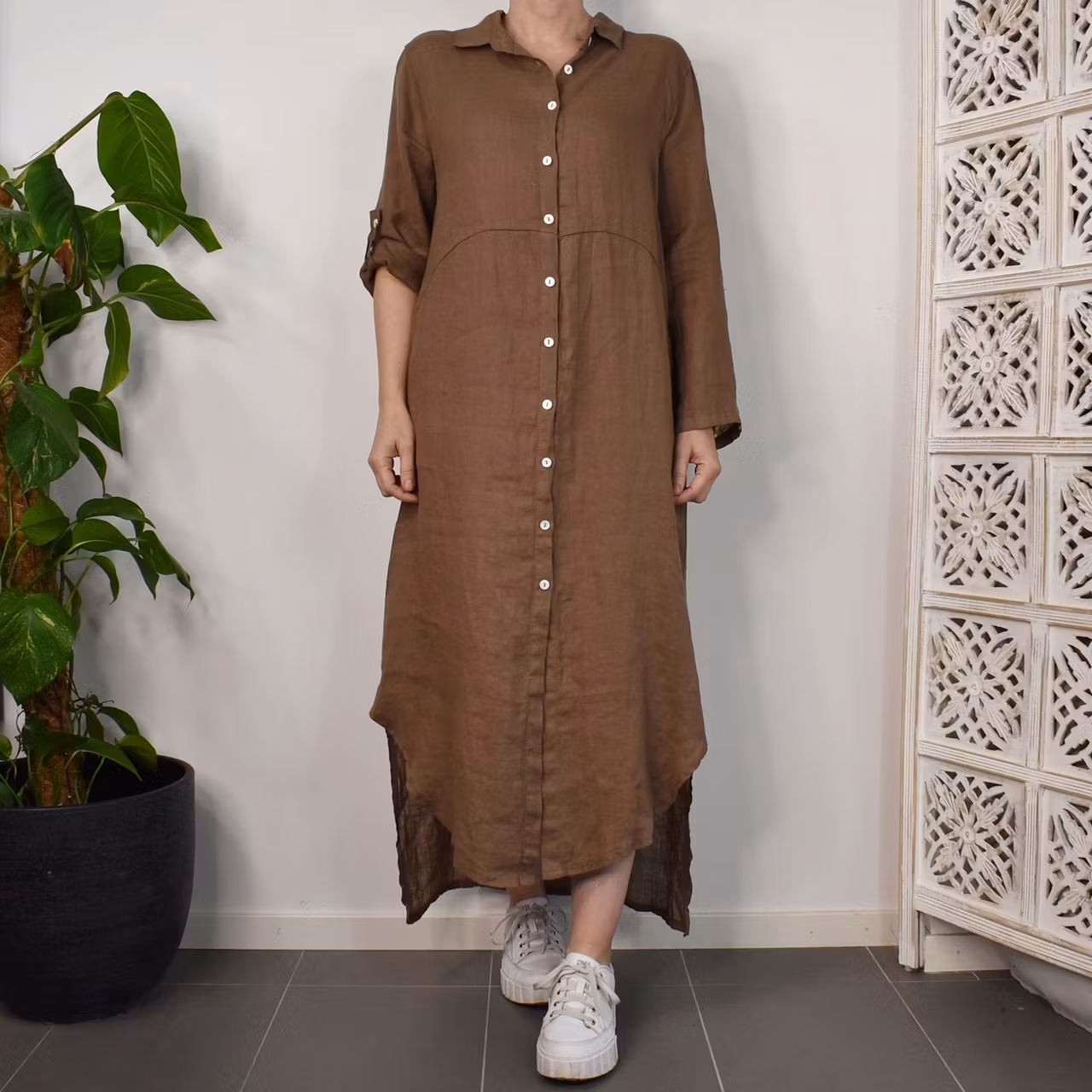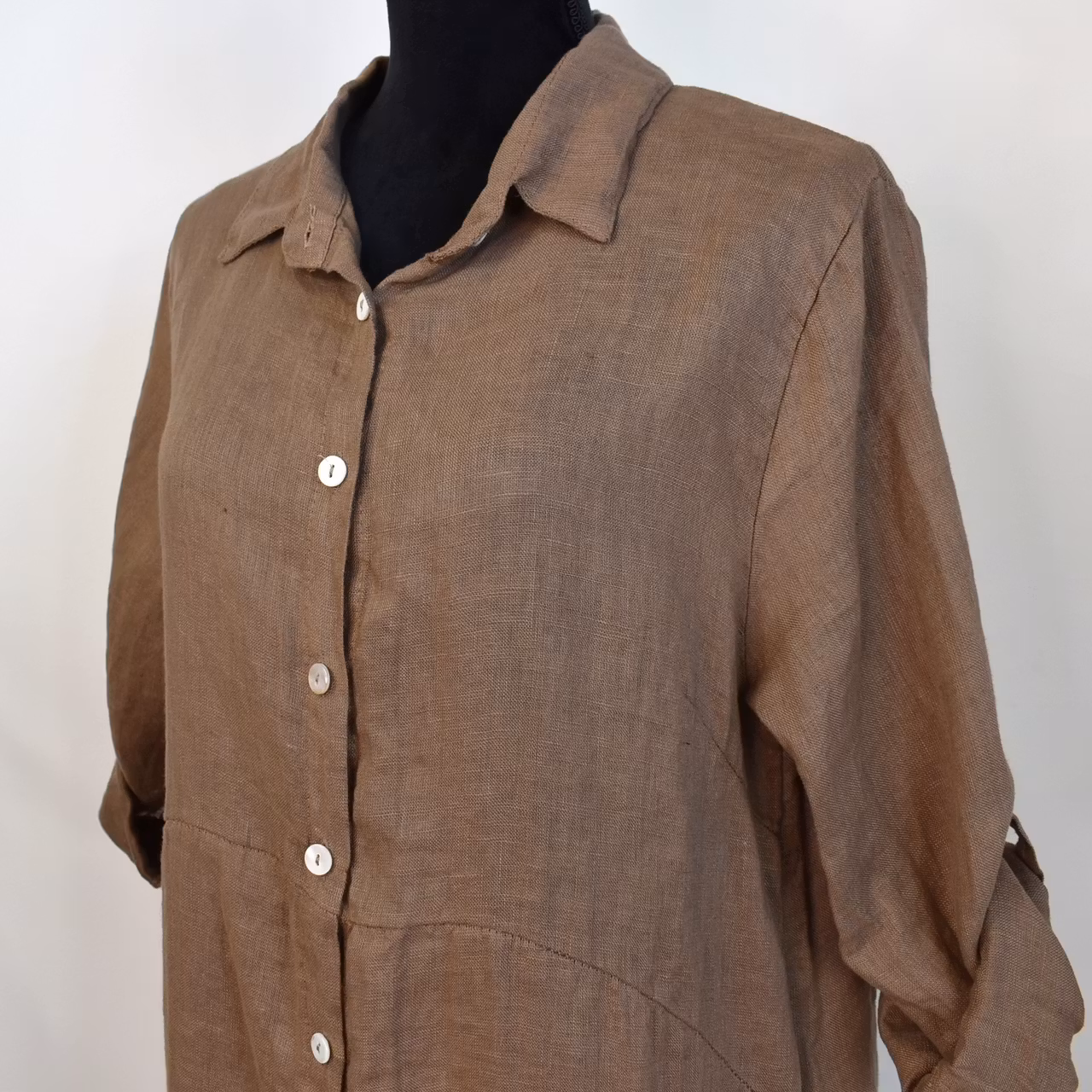 Det här är en snygg lång skjortklänning i tunt, mjukt linnetyg. Där är pärlemorskimrande knappar hela vägen fram samt gömda fickor i sidan. Ärmen är lång men kan vikas upp och fästas med knapp. Det finns en rundad slits i sidan nertill och dekorativt sprund i ryggen. Klänningen är längre baktill. Observera att materialet inte innehåller stretch och att tyget är något genomskinligt. Då vi alla är olika formade och upplever storlekar olika så rekommenderar vi att man alltid använder sig av måtten längre ner i beskrivningen för att bedöma om plagget kan passa. Storlekar S/M & L/XL. Modellen har en bröstvidd på cirka 88cm, är 163cm lång och bär storlek S/M. Observera att förekomsten av streck, färgskiftningar etc. inte är defekter utan en del av det som gör tyget vackert.