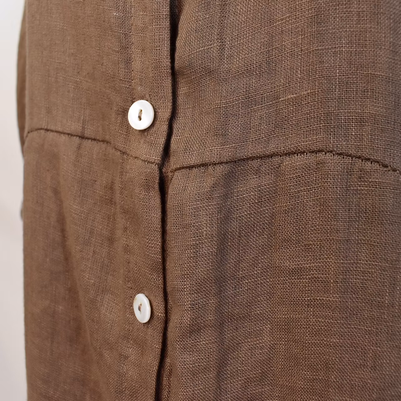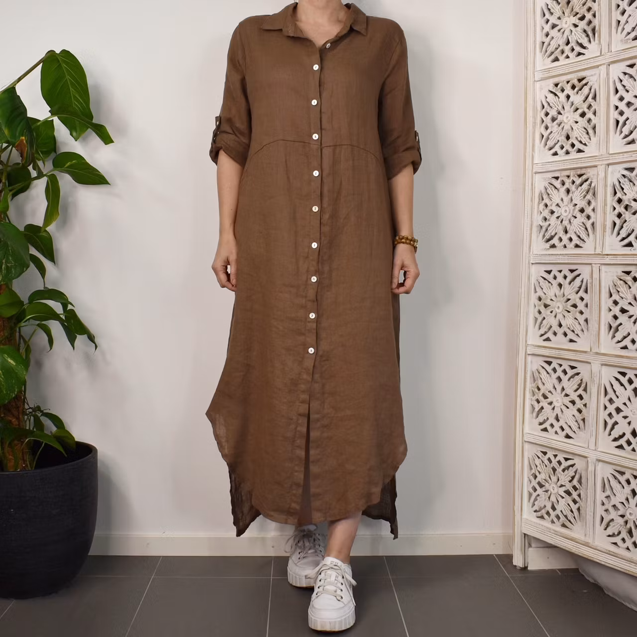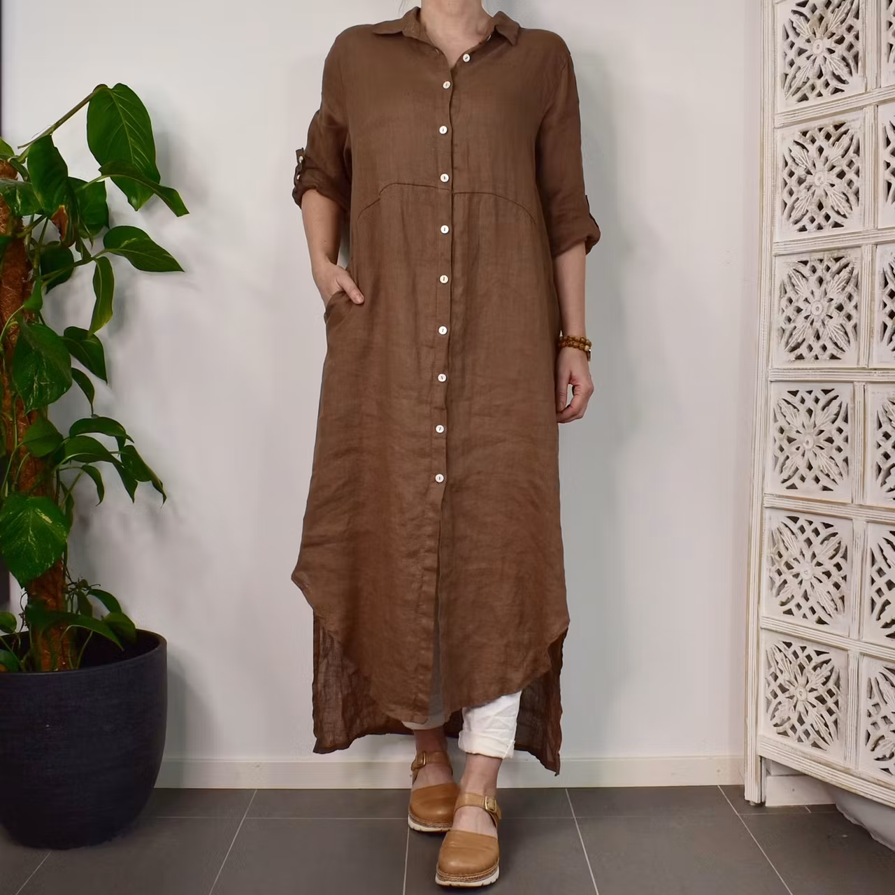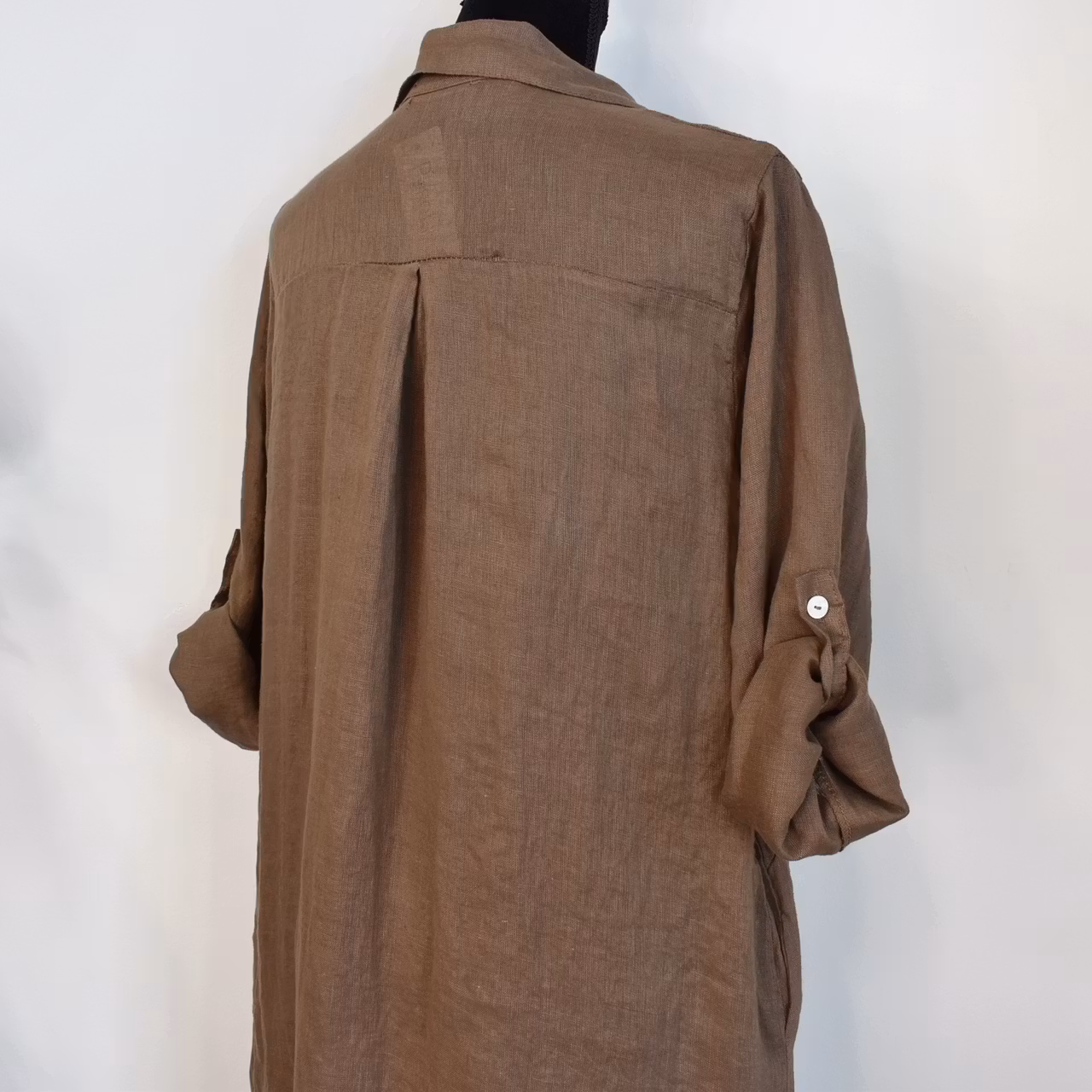 Det här är en snygg lång skjortklänning i tunt, mjukt linnetyg. Där är pärlemorskimrande knappar hela vägen fram samt gömda fickor i sidan. Ärmen är lång men kan vikas upp och fästas med knapp. Det finns en rundad slits i sidan nertill och dekorativt sprund i ryggen. Klänningen är längre baktill. Observera att materialet inte innehåller stretch och att tyget är något genomskinligt. Då vi alla är olika formade och upplever storlekar olika så rekommenderar vi att man alltid använder sig av måtten längre ner i beskrivningen för att bedöma om plagget kan passa. Storlekar S/M & L/XL. Modellen har en bröstvidd på cirka 88cm, är 163cm lång och bär storlek S/M. Observera att förekomsten av streck, färgskiftningar etc. inte är defekter utan en del av det som gör tyget vackert.