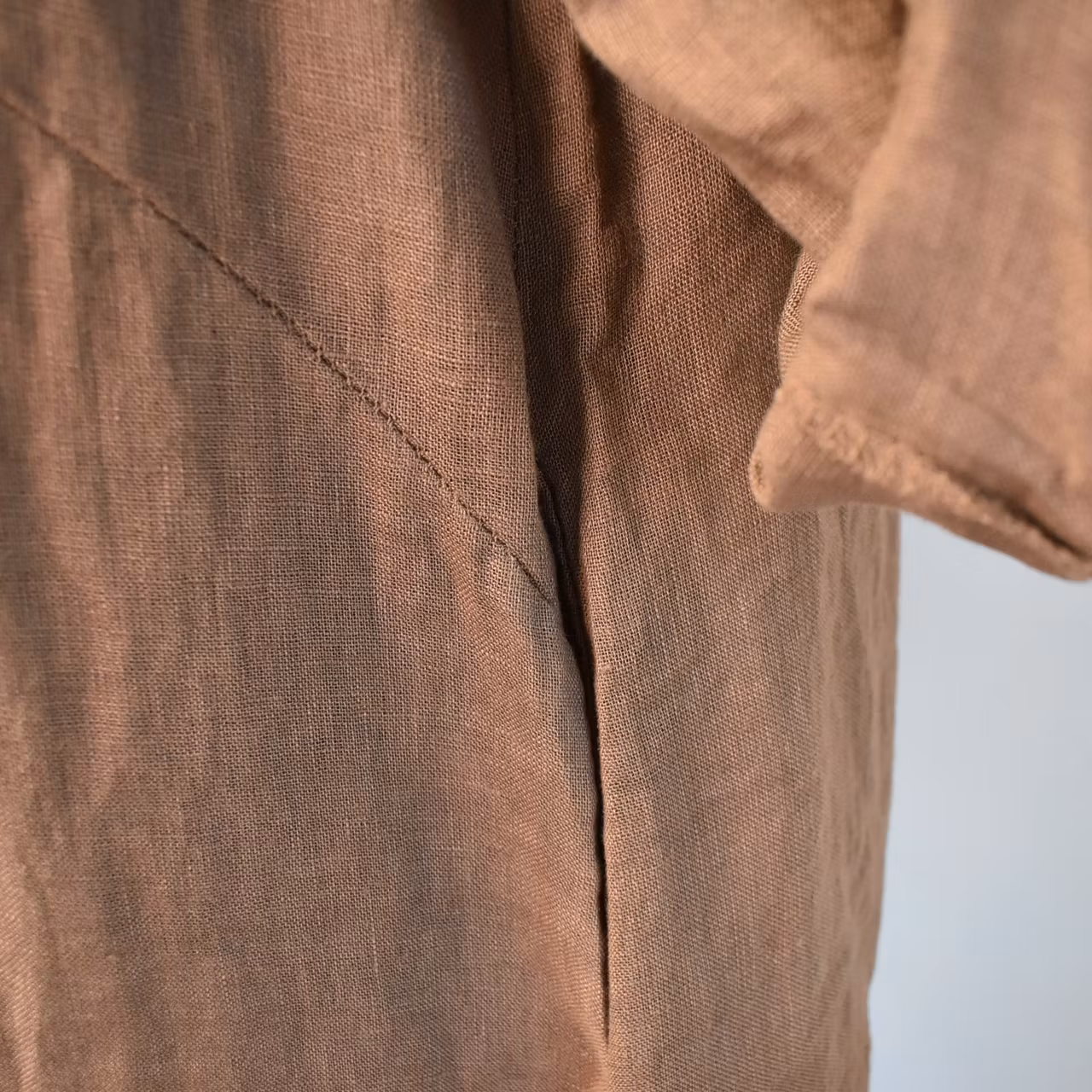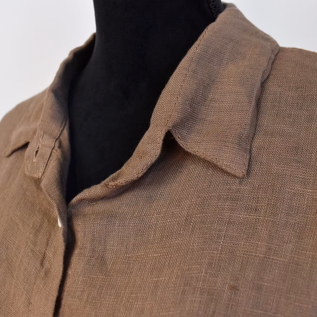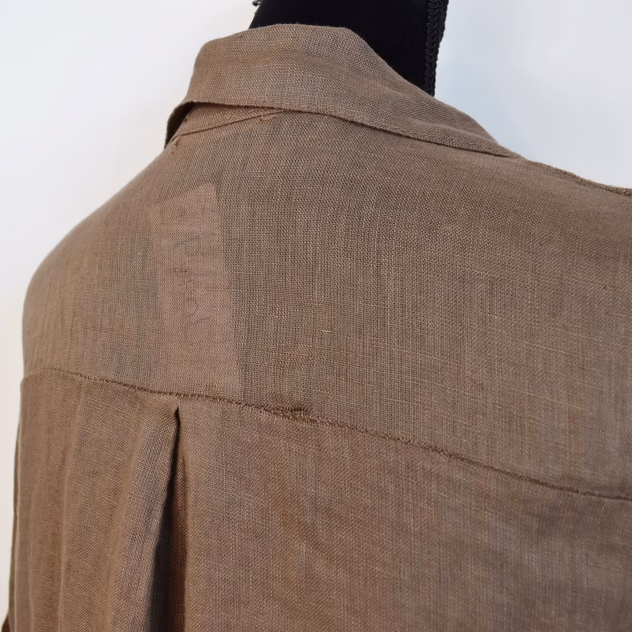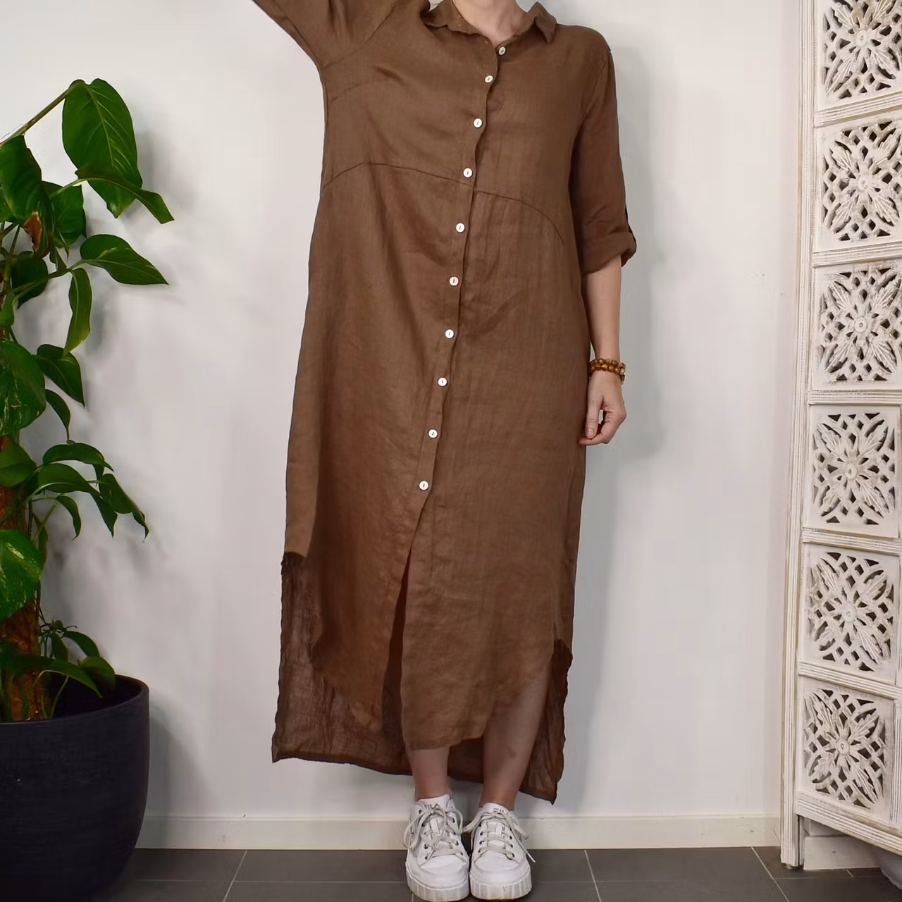Det här är en snygg lång skjortklänning i tunt, mjukt linnetyg. Där är pärlemorskimrande knappar hela vägen fram samt gömda fickor i sidan. Ärmen är lång men kan vikas upp och fästas med knapp. Det finns en rundad slits i sidan nertill och dekorativt sprund i ryggen. Klänningen är längre baktill. Observera att materialet inte innehåller stretch och att tyget är något genomskinligt. Då vi alla är olika formade och upplever storlekar olika så rekommenderar vi att man alltid använder sig av måtten längre ner i beskrivningen för att bedöma om plagget kan passa. Storlekar S/M & L/XL. Modellen har en bröstvidd på cirka 88cm, är 163cm lång och bär storlek S/M. Observera att förekomsten av streck, färgskiftningar etc. inte är defekter utan en del av det som gör tyget vackert.