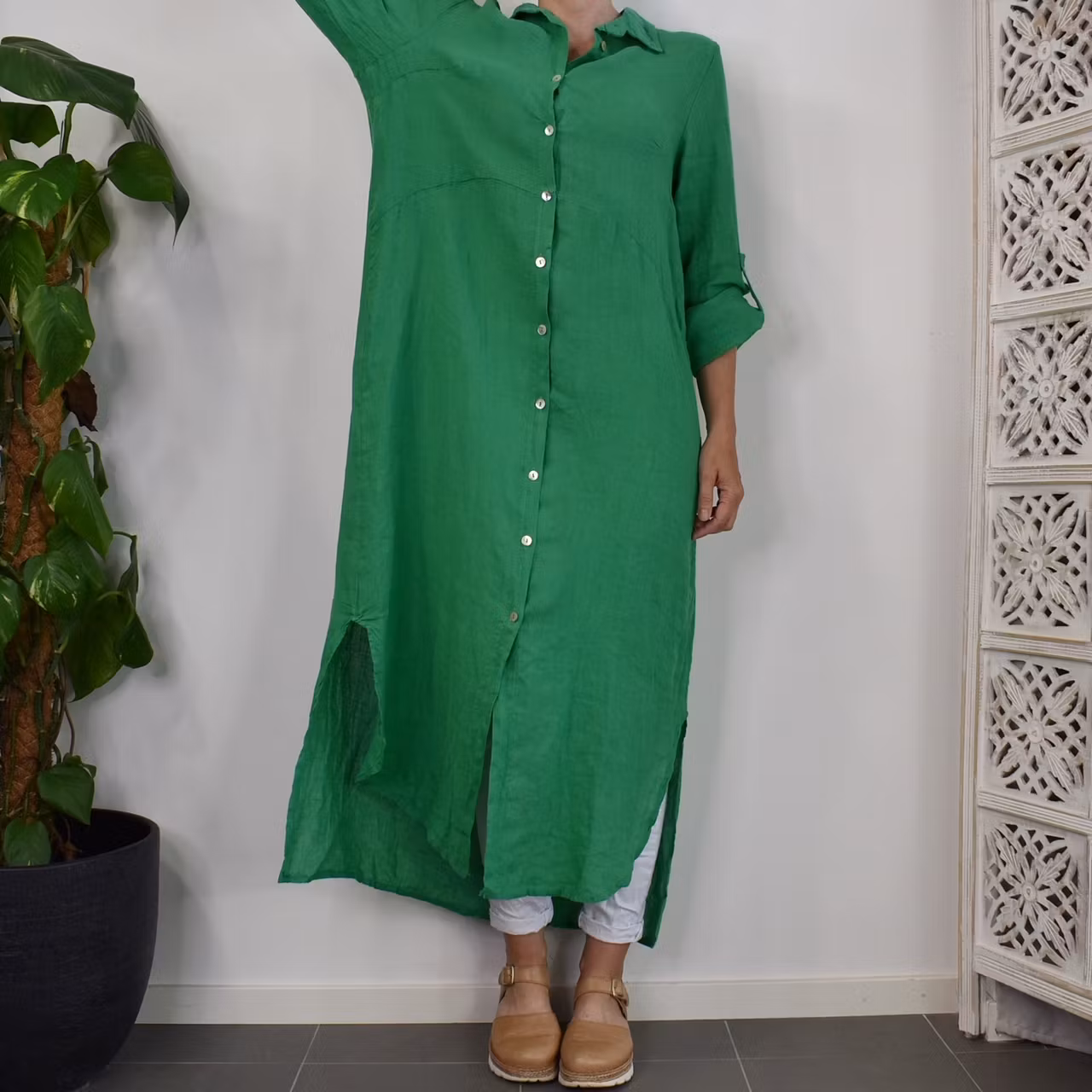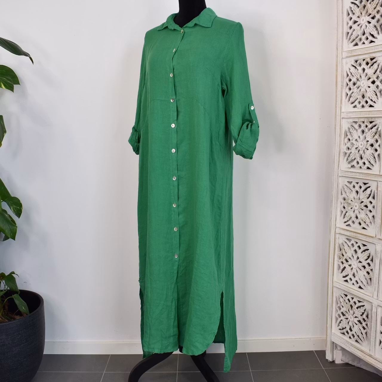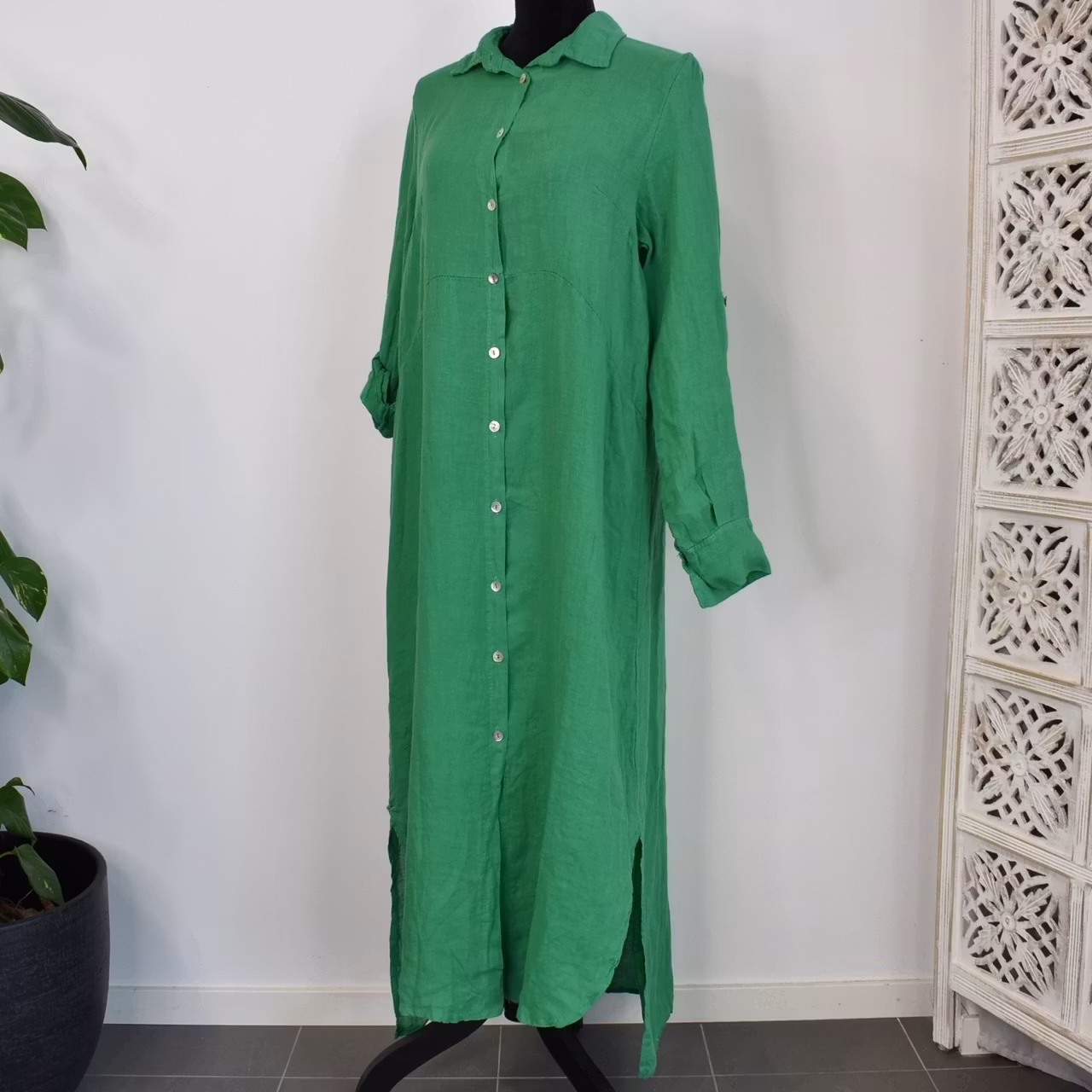 Lång skjortklänning i linne GRÖN